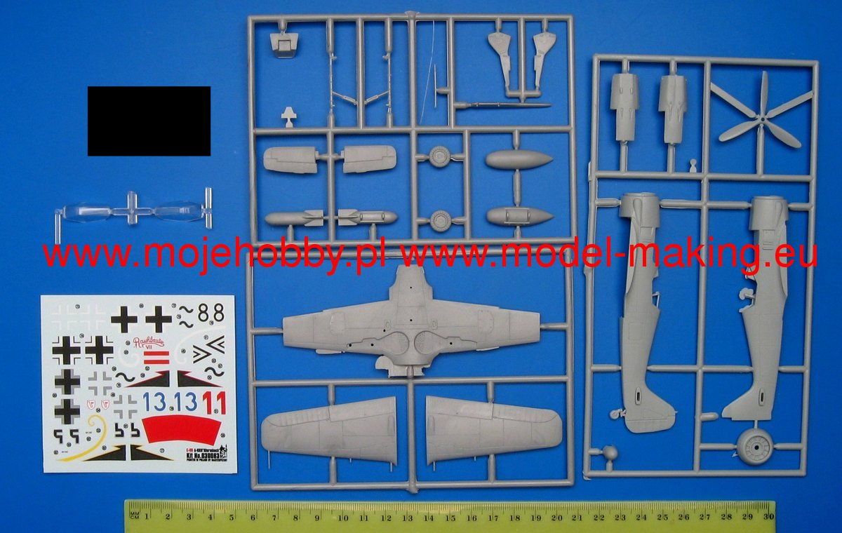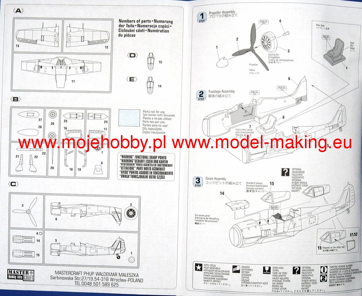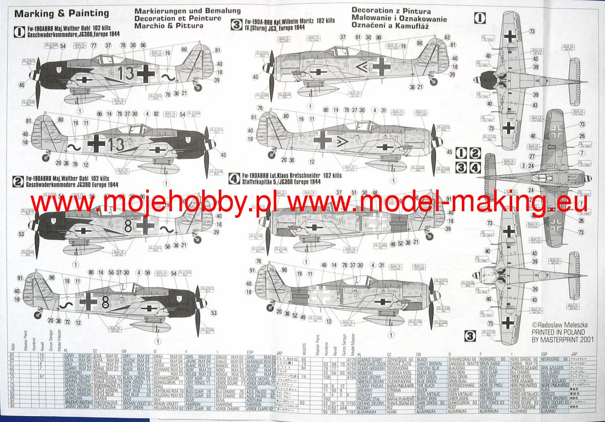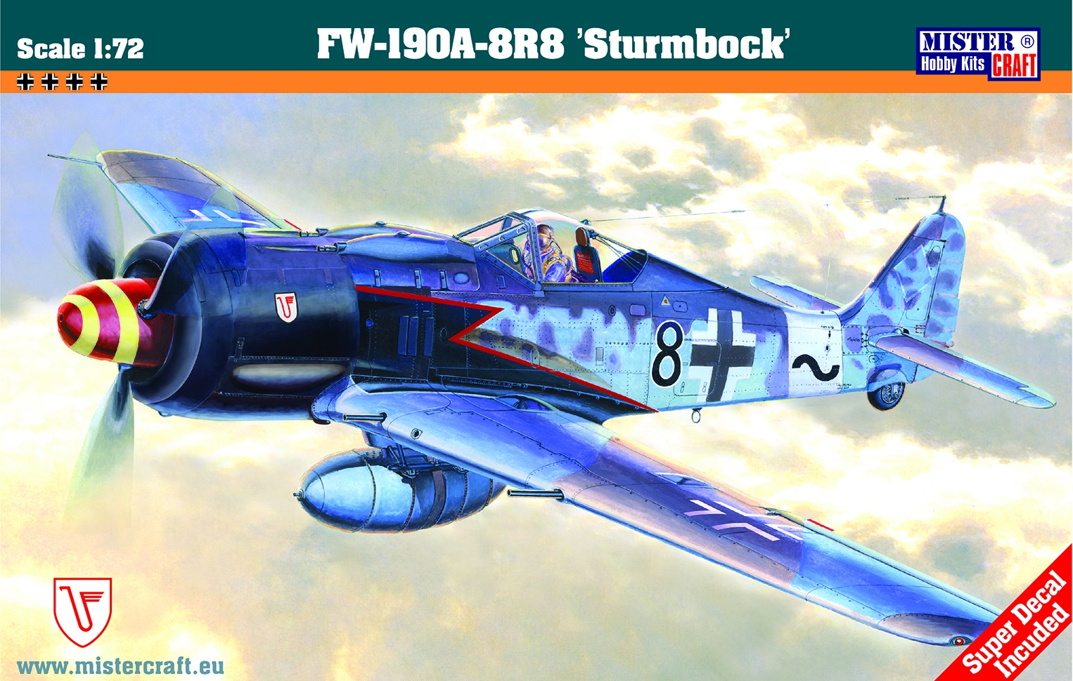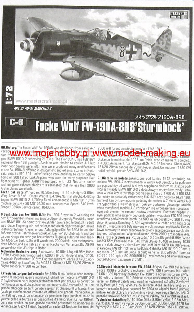 Focke-Wulf Fw-190 немецкий одномоторный цельнометаллический истребитель с крытой кабиной в конструкции низкоплана времен Второй мировой войны. Пилоты считали Fw-190 лучшим самолетом, чем Messerschmitt Bf-109. Отдельно стоящее низкоплан с работающим покрытием Fw-190 было заказано Luftfahrtministerium, собрано осенью 1937 года. Курт Танк представил два предложения по силовым установкам первое с двигателем Daimler-Benz DB 601 жидкостного охлаждения, а второе с новым звездообразным двигателем BMW 139. Был выбран последний, и начатые весной 1938 года работы возглавил Оберинг. Р. Блазер. Первый прототип Fw-190V1 был готов в мае 1939 года, а 1 июня 1939 года капитан Ганс Сандер поднял его в воздух в Бремене. Второй прототип, FW-190V2, вооруженный двумя пулеметами MG131 и двумя пулеметами MG17 калибра 7,92 мм, поднялся в воздух в октябре 1939 года. Чтобы уменьшить аэродинамическое сопротивление, оба были оснащены туннельным воздухозаборником в крышке воздушного винта, но проблемы с перегревом двигателя привели к возврату к проверенной конструкции щитка NACA. Прежде чем окончательно начались испытания этих прототипов, уже было принято решение о замене двигателя BMW 139 на более мощный, но более длинный и тяжелый BMW 810. Это потребовало множества изменений, усиления конструкции и перемещения кабины назад, что впоследствии стало источник проблем с центром тяжести. Преимуществом было снятие проблем с проницаемостью выхлопных газов и перегревом салона из-за его непосредственной близости к двигателю BMW 139. От третьего и четвертого прототипов отказались, а в начале достроили Fw-190V5 с новым двигателем 1940 года. Позже он получил крылья с увеличенным на один метр размахом (с исходных 9,5 м), что сделало его медленнее на 10 км/ч, но зато повысило скороподъемность и улучшило маневренность. Он получил обозначение Fw-190V5g, а вариант с более коротким крылом Fw-190V5k. Первые семь машин информационной серии Fw-190A-0 имели короткое крыло, остальные более длинное. Первая оперативная часть, оснащенная Fw-190 6./JG 26, дислоцированная в Ле-Бурже, заявила о своей оперативной готовности в августе 1941 г., и с первой же встречи нового истребителя с британскими Supermarine Spitfire стало очевидным его преимущество перед ними. Во время войны было создано около дюжины модификаций этого великого самолета. Машины версии А вместе с десятком-другим модернизаций служили истребителями. Версии с маркировкой В и С были лишь прототипами высотных истребителей, предназначенных для борьбы со стратегическими бомбардировщиками, но в серийное производство не поступали. Вариант D, как единственный из Fw-190, был оснащен новым двигателем Jumo 213A мощностью 1750 л.с. и был немецким ответом на P-51 Mustang. Новый двигатель удлинил фюзеляж на несколько десятков сантиметров. Этот вариант также выполнял в основном охотничьи и высотные истребительные задачи. Многочисленные варианты версии F использовались как истребители-бомбардировщики для непосредственной поддержки на поле боя. Версия G играла ту же роль, что и версия F, но имела больший радиус действия. За всю войну было выпущено более 20 000 экземпляров этого одного из лучших истребителей Второй мировой войны. Технические данные (вариант Fw-190A-8): длина: 9м, размах крыла: 10,51м, высота: 3,95м, максимальная скорость: 656км/ч, скороподъемность: 15м/с, максимальная дальность: 800км, максимальный потолок 11410м, вооружение : исправлено - 2 13-мм пулемета MG131 и 4 20-мм пу