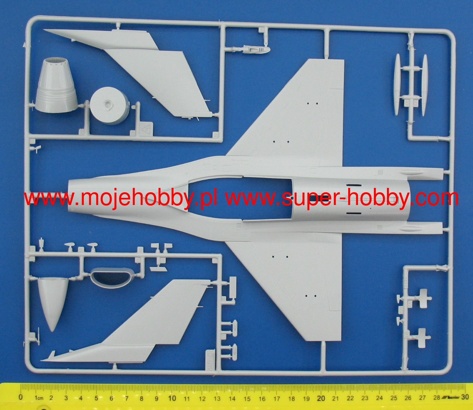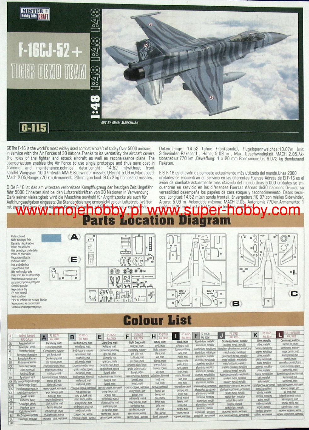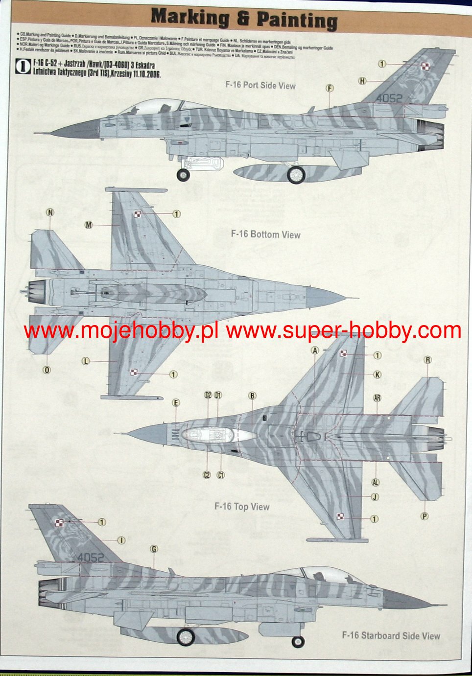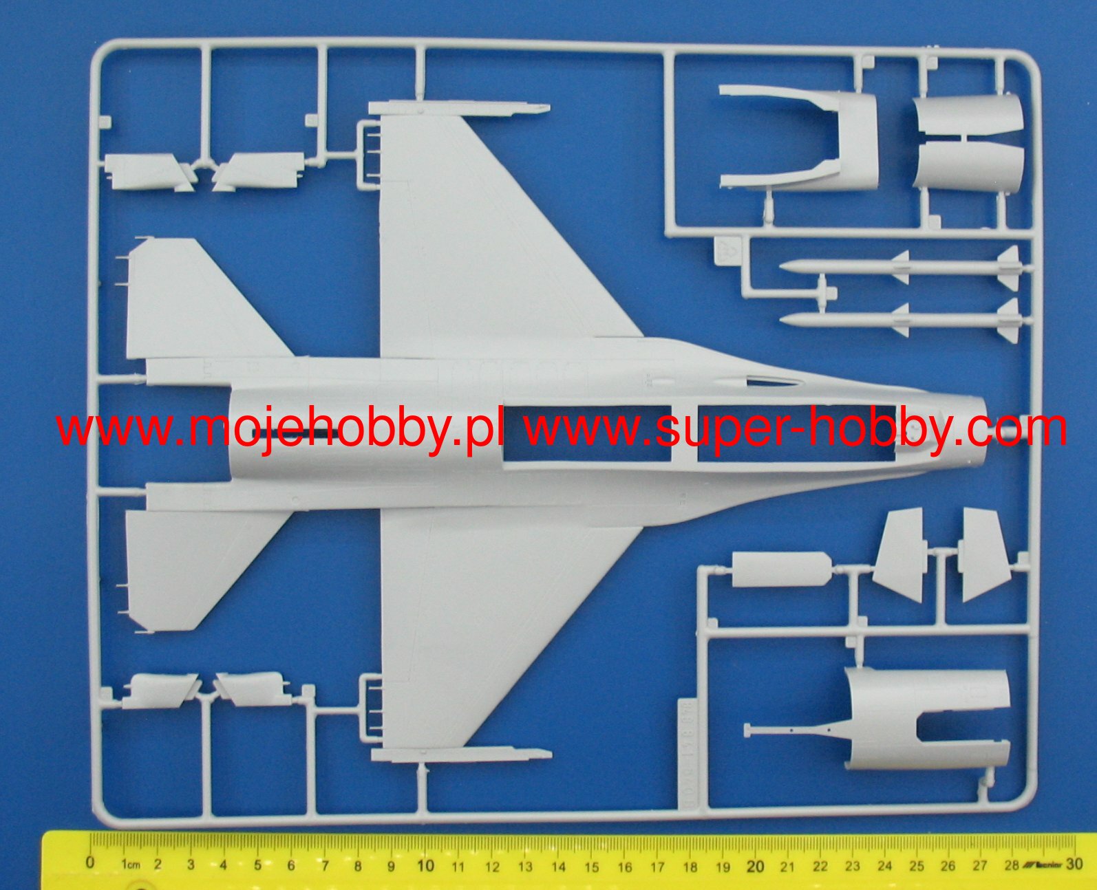 Note: Comany Mistercraft frequently changes, without any notice, the decals that come with the model, so they may differ from the photos and descriptions on our website. If you need a specific version, please let us know about that by entering the appropriate notice in the comments field when placing the order. The General-Dynamics F16 Falcon is an American single-engine, multi-role light fighter and stormtrooper. Work on the F-16 project began in 1971 at the General Dynamics concern (which in 1993 was part of the Lockheed Martin giant), entering the competition for a light multi-purpose fighter (LWF) for the US Air Force. The YF-16 prototype first flew on February 2, 1974. A breakthrough in technical terms was the use of a computerized electric fly-by-wire control system, which made it possible to reduce the area of the wings and tail, and thus reduce the weight of the entire aircraft. The F-16 was the first fighter in the world to use such a system. The first versions were to a large extent made of aluminum alloys (about 83% of the total structure), but with time they gave way to composites. The different versions of the F-16 are powered by three versions of the engines: Pratt-Whitney F-100-PW-200, General Electric F110-GE100 and Pratt-Whitney F-100-PW-2020. The "brain" of the guidance system was the APG-66 radar, later replaced by the APG-68 (V) radar. It is worth noting that the YF-16 design turned out to be so successful that it won not only the LWF competition in the USA (in competition with the Northrop YF-17 aircraft), but also won the centenary contract for a multi-role fighter for European NATO countries. His rivals were the Dassault Mirage F.1 and SAAB J-37 Viggen machines. Serial production of the F-16 began in 1975. It was also attended by European NATO countries for which it was an injection of new aviation technologies. Final assembly was performed in the USA, Belgium and the Netherlands. The first serial F-16A Fighting Falcon was flown on August 7, 1978. It is an assault version of the F-16, intended primarily to counter ground targets. The F-16 also proved itself in combat, with a series of air victories in the war in Lebanon (1982) and during the Operation Desert Storm (1991). By the end of the 20th century, more than 4,000 of this successful aircraft had been produced. There were six basic versions of the F-16, marked as A, C, E (single-seater) and B, D, F (two-seater). On the basis of these six models, numerous upgrades are created, most often associated with the replacement of avionics, marked as "Block". Since 2006, the F-16 also serves in the Polish aviation. The Polish Ministry of Defense decided that the F-16 would be the backbone of the modernized air force, rejecting offers from Dessault and SAAB, although in this case they were Mirrage F2000 and JAS-39 Grippen fighters. Undoubtedly, the highest sum proposed by the American company as part of the so-called offset transaction. Technical data: Maximum speed: 2,170 km / h, rate of climb: 254 m / s, maximum ceiling 15240m, maximum range: 3890km, armament: fixed - one 20mm six-barrel M61A-1 cannon, suspended - up to 9275 kg of cargo.