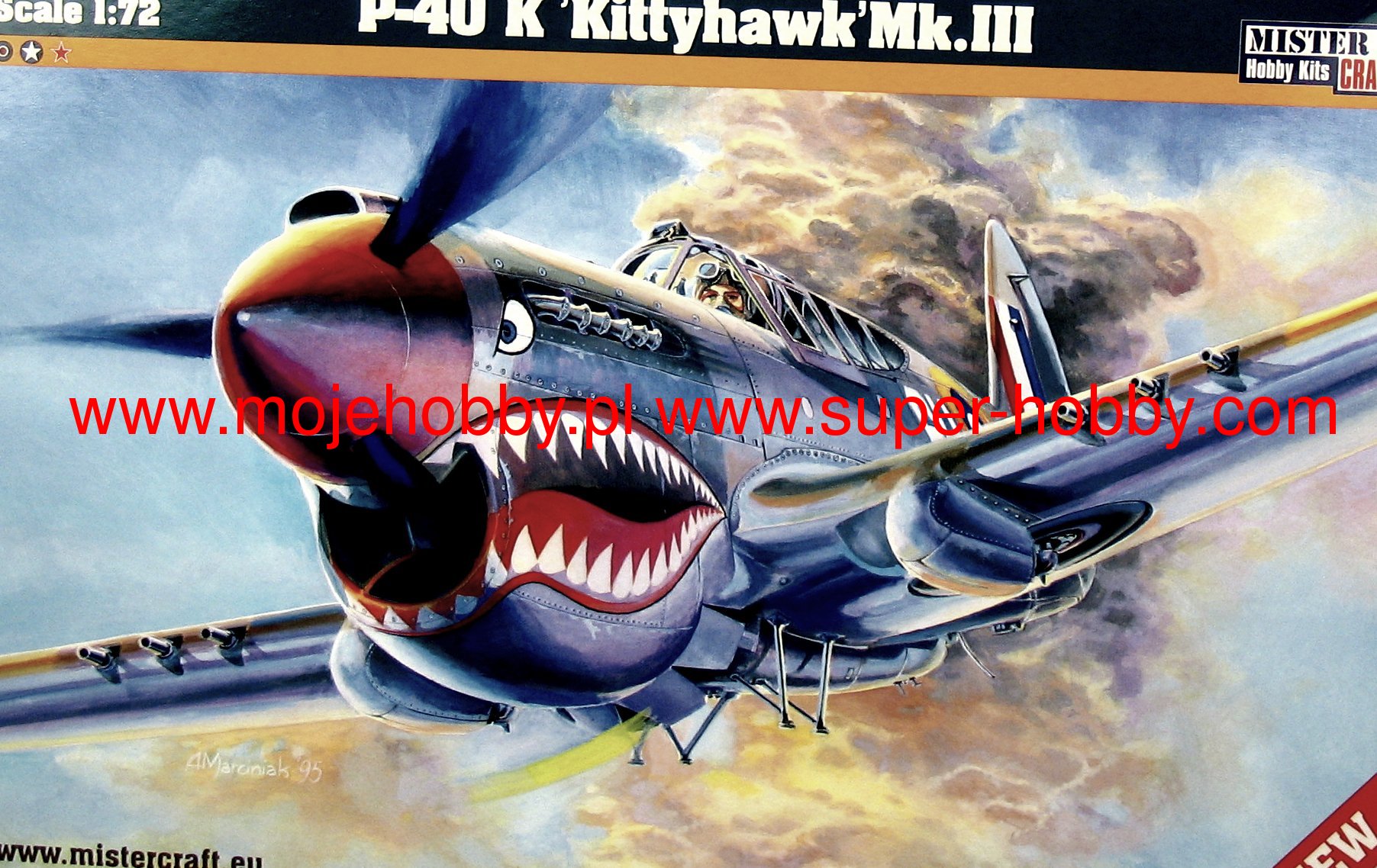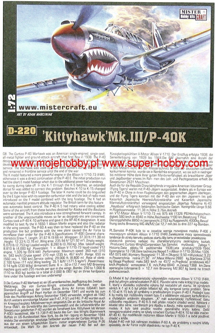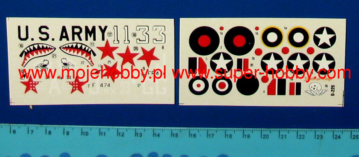 Note: Comany Mistercraft frequently changes, without any notice, the decals that come with the model, so they may differ from the photos and descriptions on our website. If you need a specific version, please let us know about that by entering the appropriate notice in the comments field when placing the order. The Curtiss P-40 Warhawk is an American, single-engine, metal fighter-attack aircraft in a low wing configuration with a classic tail. The flight of the prototype took place in 1938, and serial production was carried out in the years 1938-1944. The last of the Hawk family of planes - the Curtiss P-40 Warhawk was, apart from the Republic P-47 and the North American P-51 Mustang, the most widely built American fighter. At the end of production in December 1944, the number of machines exceeded 15,000. The development of the design began in 1937, when the prototype airframe of version 75 was adapted to the installation of the 1167HP Allison V-1710-11 in-line engine. The plane became the first American construction capable of flying at speeds over 483 km / h. The version for the RAF was called the Tomahawk Mk IIA. The planes had self-sealing fuel tanks and two wing-mounted 7.7mm machine guns. The Tomahawk MkIIB were equipped with American radio hardware and armed with six 7.7mm machine guns. Some American P-40s were modernized in 1941 for reconnaissance tasks. They received the designation RP-40. Meanwhile, work on the Hawk 81-A was underway at the Curtiss facility. The changes included the installation of the Allison V-1710-39 engine with a capacity of 1167KM, providing constant power up to a height of 3563 meters, adaptation for installation in the wing of four 12.7mm machine guns and the installation of a fuselage node that could carry one bomb weighing 227 kg or thrown back additional fuel tank. The US Army placed an order for these machines in September 1940, awarding them the designation P-40D. Over the next three years, Curtiss made every effort to expand the application possibilities of the P-40, creating numerous new versions of the aircraft. Despite these efforts, Warhawk's performance was lower than that of contemporary Allied and Axis fighters. Technical data (P-40E version): length: 9.66m, wingspan: 11.38m, height: 3.76m, maximum speed: 580km / h, rate of climb: 11m / s, maximum range: 1100km, practical ceiling: 8800m, armament: fixed - 6 M2 machine guns, caliber 12.7 mm, suspended - up to 900 kg of cargo.