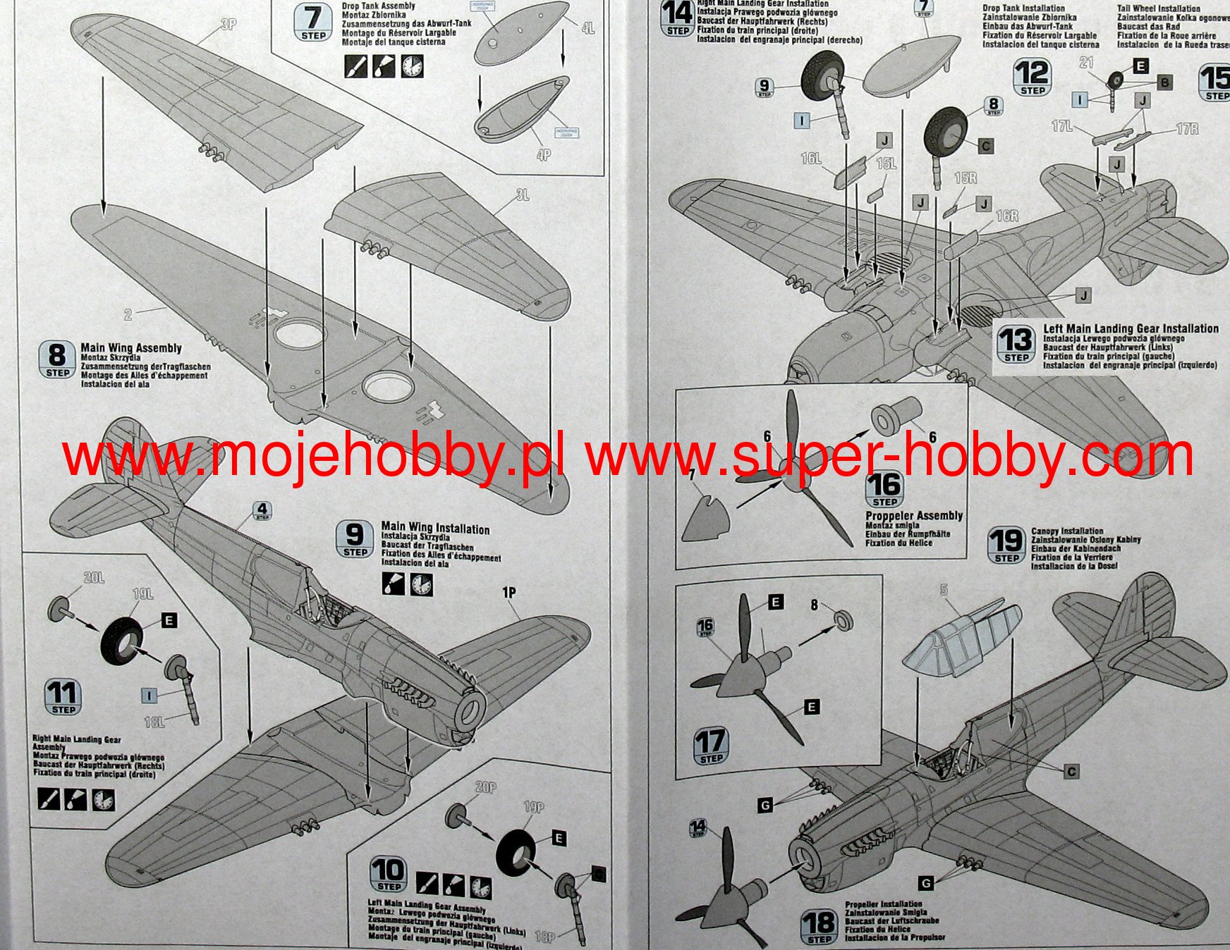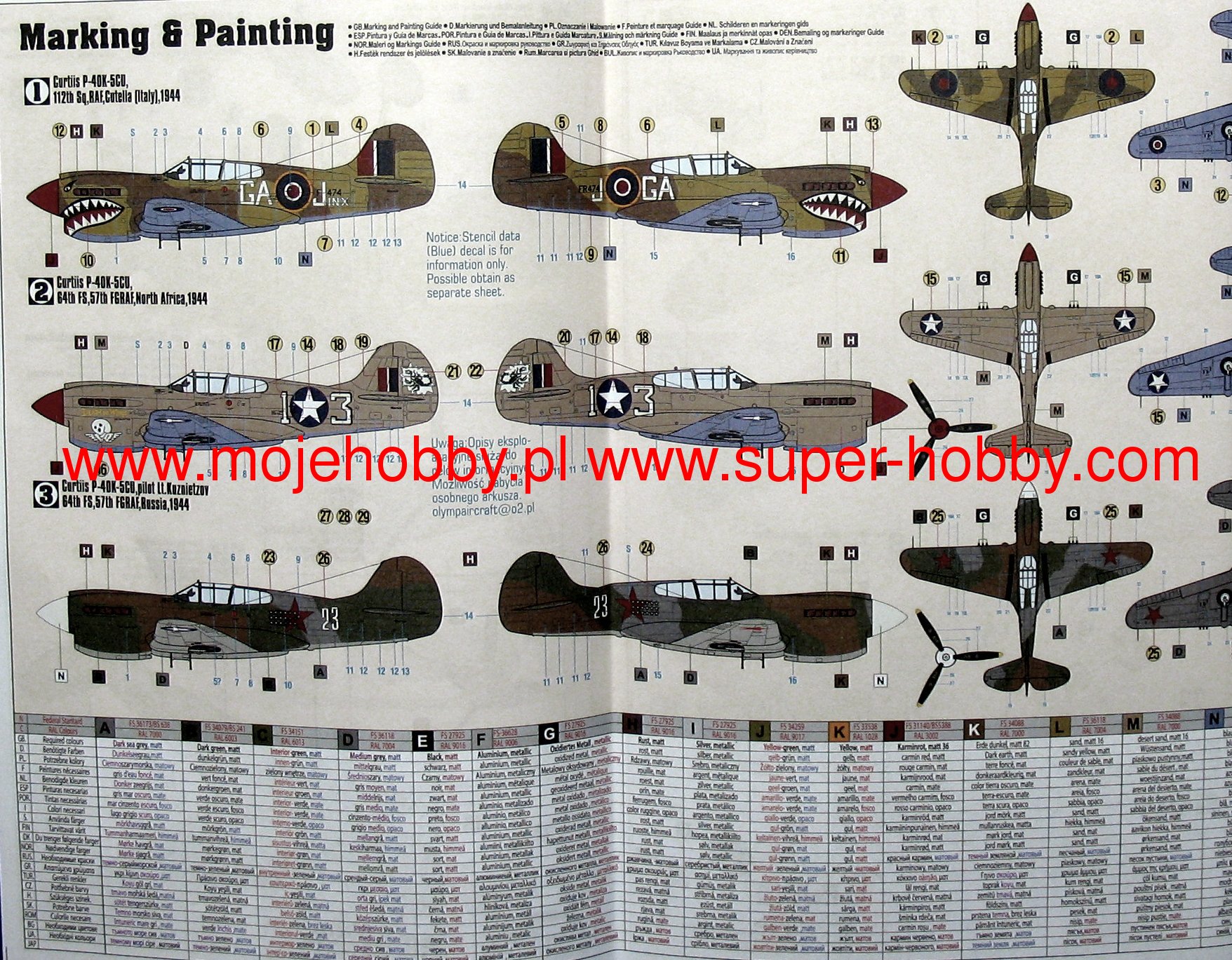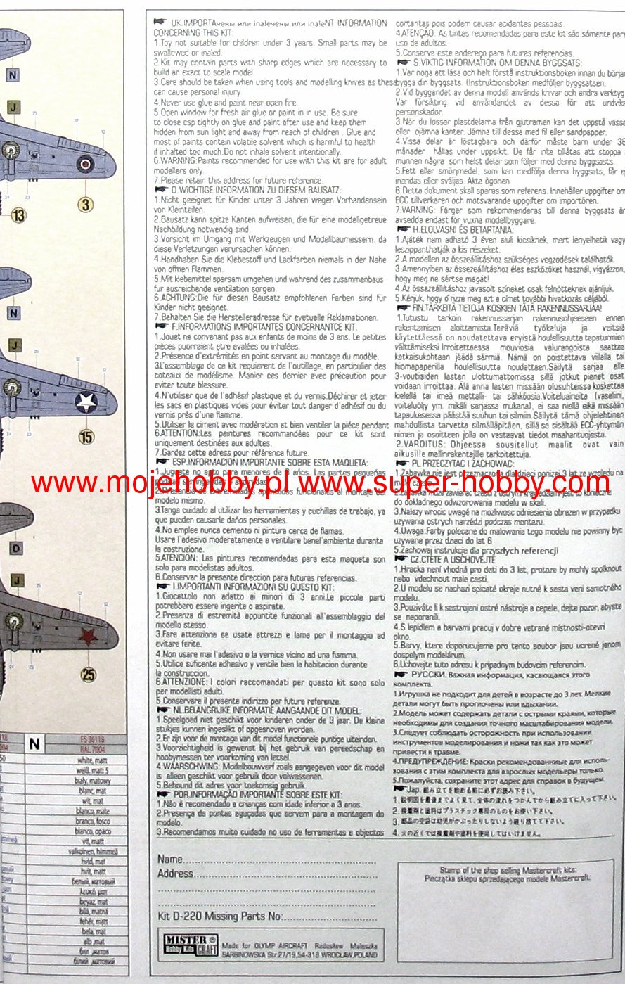 Note: Comany Mistercraft frequently changes, without any notice, the decals that come with the model, so they may differ from the photos and descriptions on our website. If you need a specific version, please let us know about that by entering the appropriate notice in the comments field when placing the order. The Curtiss P-40 Warhawk is an American, single-engine, metal fighter-attack aircraft in a low wing configuration with a classic tail. The flight of the prototype took place in 1938, and serial production was carried out in the years 1938-1944. The last of the Hawk family of planes - the Curtiss P-40 Warhawk was, apart from the Republic P-47 and the North American P-51 Mustang, the most widely built American fighter. At the end of production in December 1944, the number of machines exceeded 15,000. The development of the design began in 1937, when the prototype airframe of version 75 was adapted to the installation of the 1167HP Allison V-1710-11 in-line engine. The plane became the first American construction capable of flying at speeds over 483 km / h. The version for the RAF was called the Tomahawk Mk IIA. The planes had self-sealing fuel tanks and two wing-mounted 7.7mm machine guns. The Tomahawk MkIIB were equipped with American radio hardware and armed with six 7.7mm machine guns. Some American P-40s were modernized in 1941 for reconnaissance tasks. They received the designation RP-40. Meanwhile, work on the Hawk 81-A was underway at the Curtiss facility. The changes included the installation of the Allison V-1710-39 engine with a capacity of 1167KM, providing constant power up to a height of 3563 meters, adaptation for installation in the wing of four 12.7mm machine guns and the installation of a fuselage node that could carry one bomb weighing 227 kg or thrown back additional fuel tank. The US Army placed an order for these machines in September 1940, awarding them the designation P-40D. Over the next three years, Curtiss made every effort to expand the application possibilities of the P-40, creating numerous new versions of the aircraft. Despite these efforts, Warhawk's performance was lower than that of contemporary Allied and Axis fighters. Technical data (P-40E version): length: 9.66m, wingspan: 11.38m, height: 3.76m, maximum speed: 580km / h, rate of climb: 11m / s, maximum range: 1100km, practical ceiling: 8800m, armament: fixed - 6 M2 machine guns, caliber 12.7 mm, suspended - up to 900 kg of cargo.