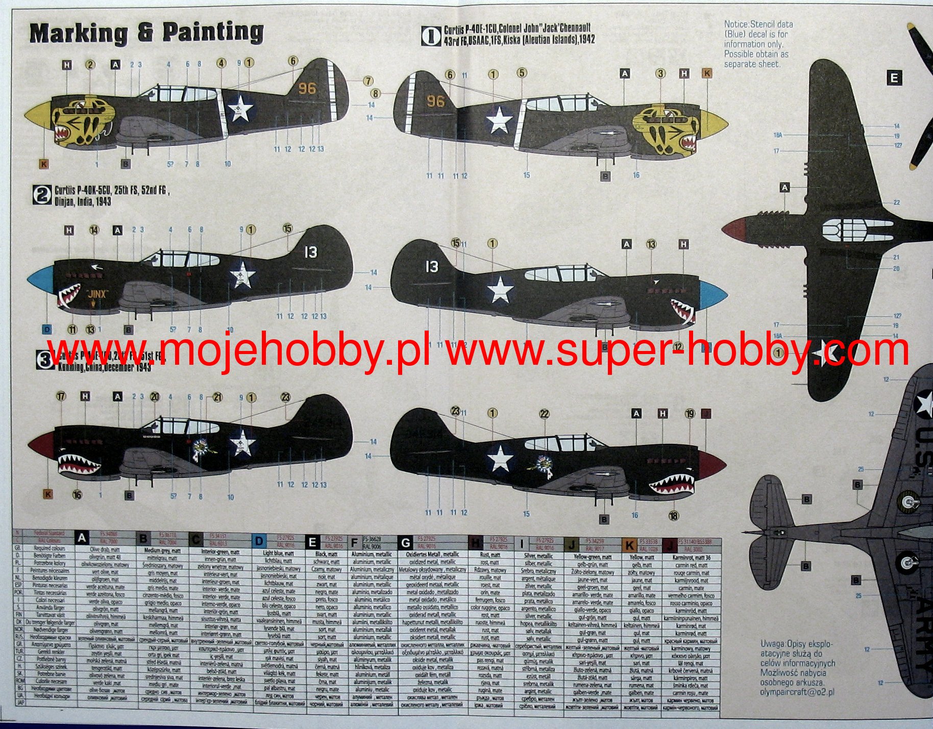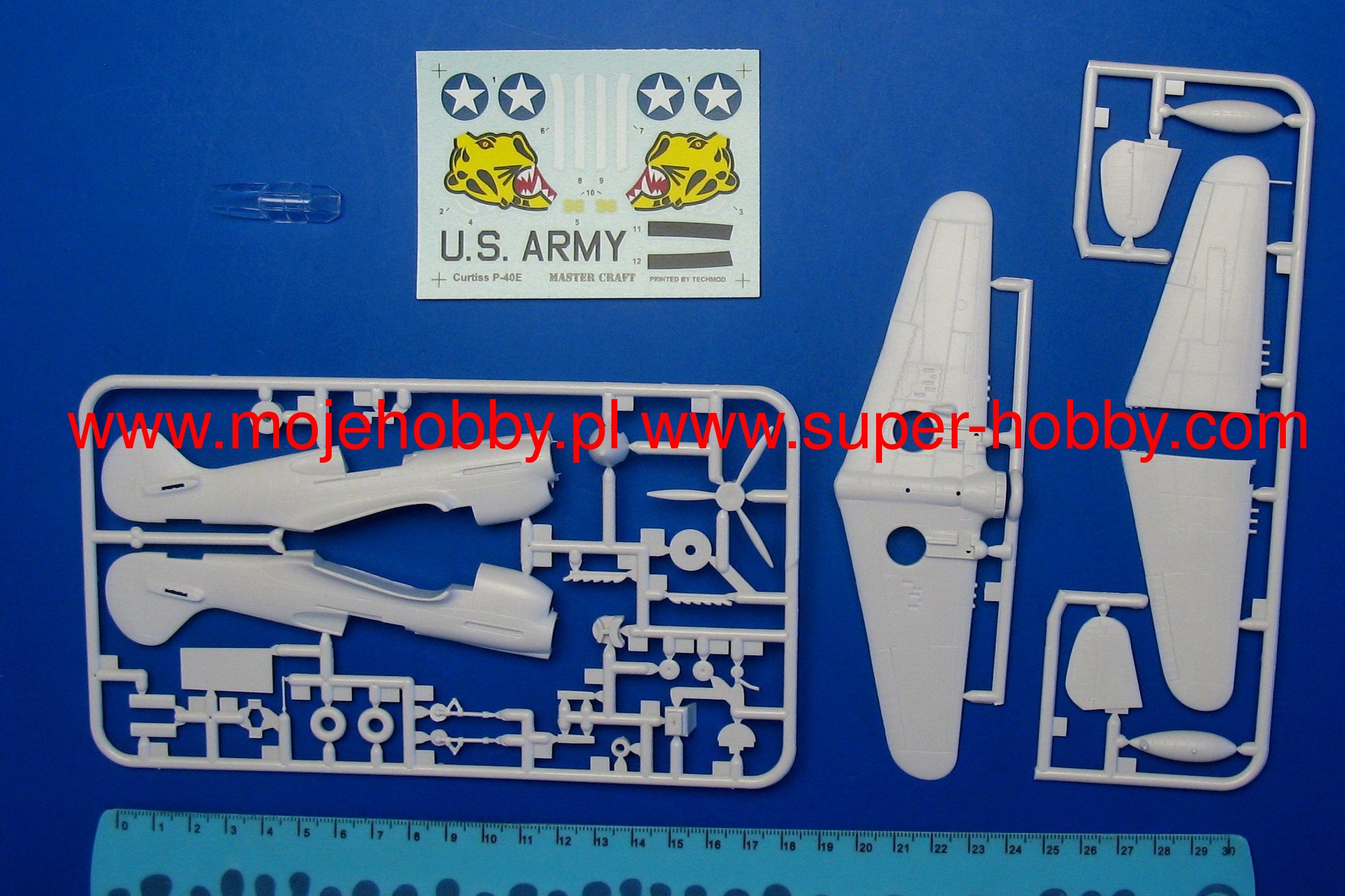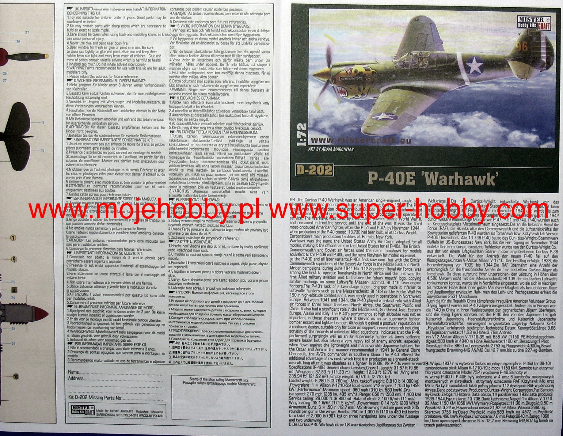 Note: Comany Mistercraft frequently changes, without any notice, the decals that come with the model, so they may differ from the photos and descriptions on our website. If you need a specific version, please let us know about that by entering the appropriate notice in the comments field when placing the order. The Curtiss P-40 Warhawk is an American, single-engine, metal fighter-attack aircraft in a low wing configuration with a classic tail. The flight of the prototype took place in 1938, and serial production was carried out in the years 1938-1944. The last of the Hawk family of planes - the Curtiss P-40 Warhawk was, apart from the Republic P-47 and the North American P-51 Mustang, the most widely built American fighter. At the end of production in December 1944, the number of machines exceeded 15,000. The development of the design began in 1937, when the prototype airframe of version 75 was adapted to the installation of the 1167HP Allison V-1710-11 in-line engine. The plane became the first American construction capable of flying at speeds over 483 km / h. The version for the RAF was called the Tomahawk Mk IIA. The planes had self-sealing fuel tanks and two wing-mounted 7.7mm machine guns. The Tomahawk MkIIB were equipped with American radio hardware and armed with six 7.7mm machine guns. Some American P-40s were modernized in 1941 for reconnaissance tasks. They received the designation RP-40. Meanwhile, work on the Hawk 81-A was underway at the Curtiss facility. The changes included the installation of the Allison V-1710-39 engine with a capacity of 1167KM, providing constant power up to a height of 3563 meters, adaptation for installation in the wing of four 12.7mm machine guns and the installation of a fuselage node that could carry one bomb weighing 227 kg or thrown back additional fuel tank. The US Army placed an order for these machines in September 1940, awarding them the designation P-40D. Over the next three years, Curtiss made every effort to expand the application possibilities of the P-40, creating numerous new versions of the aircraft. Despite these efforts, Warhawk's performance was lower than that of contemporary Allied and Axis fighters. Technical data (P-40E version): length: 9.66m, wingspan: 11.38m, height: 3.76m, maximum speed: 580km / h, rate of climb: 11m / s, maximum range: 1100km, practical ceiling: 8800m, armament: fixed - 6 M2 machine guns, caliber 12.7 mm, suspended - up to 900 kg of cargo.