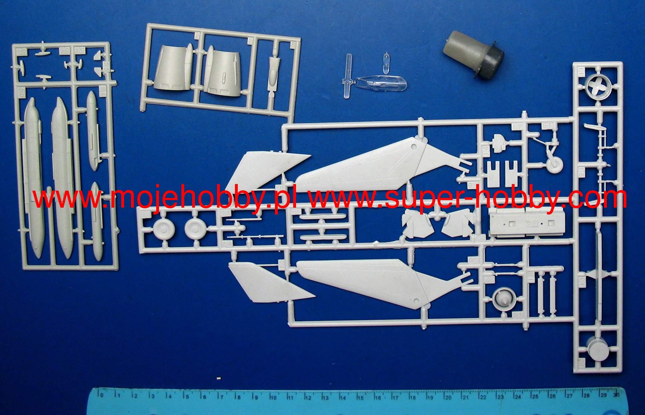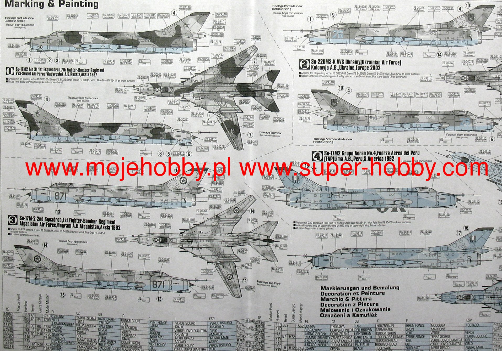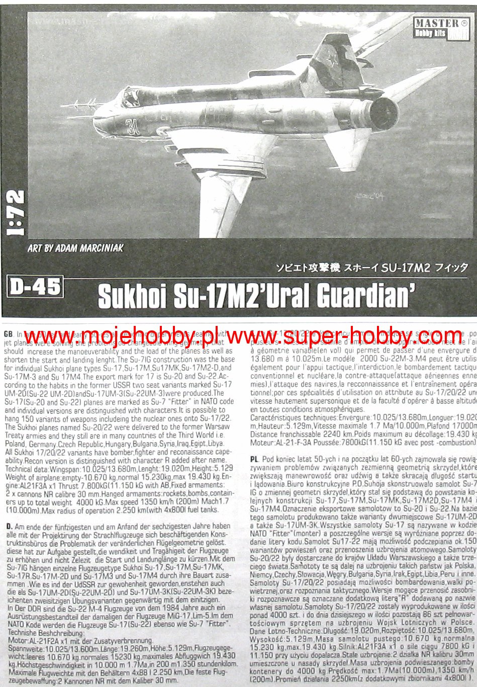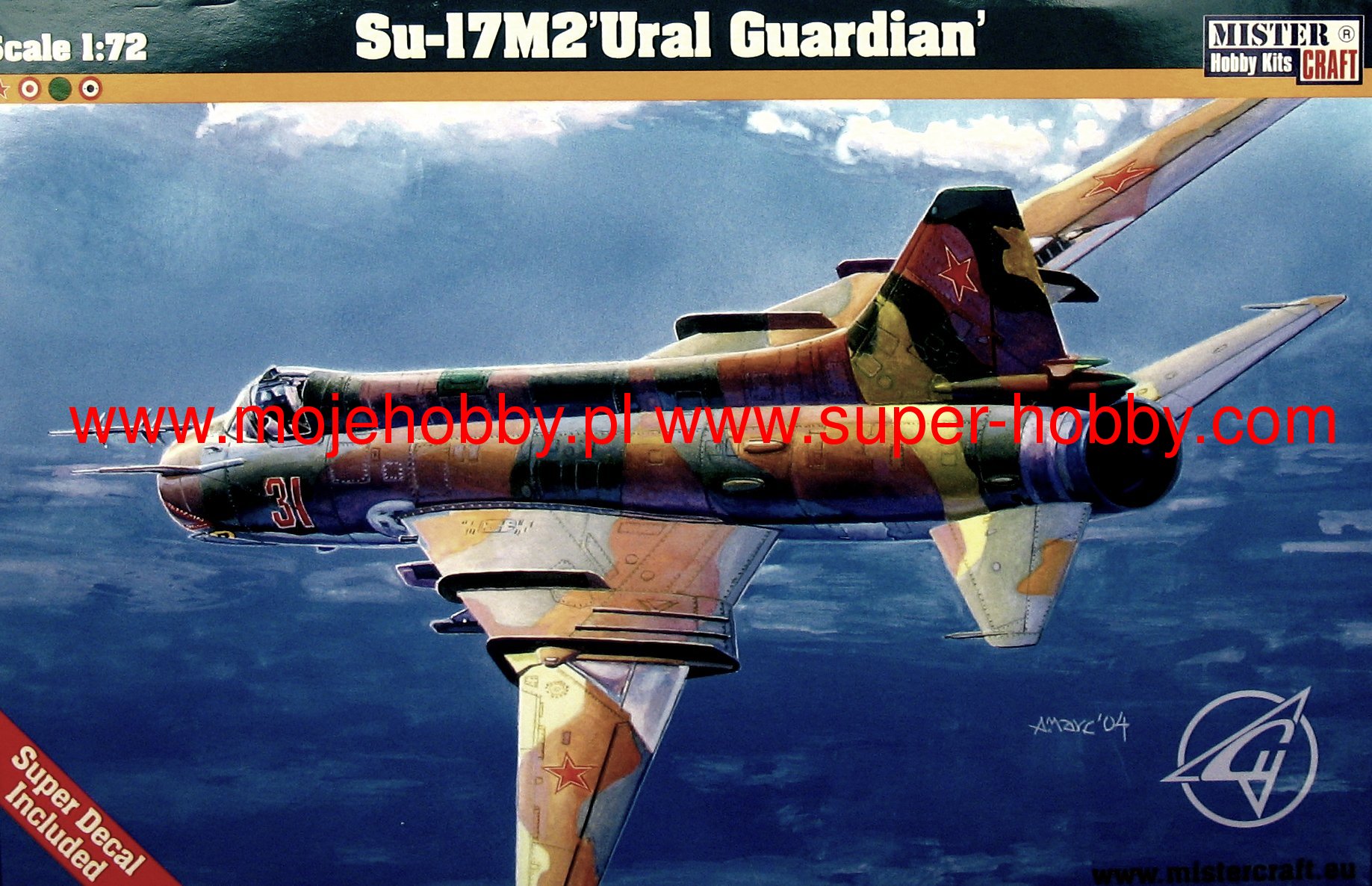 Note: Comany Mistercraft frequently changes, without any notice, the decals that come with the model, so they may differ from the photos and descriptions on our website. If you need a specific version, please let us know about that by entering the appropriate notice in the comments field when placing the order. The Sukhoi Su-17 Fitter is a Soviet single-engine attack bomber with variable wing geometry. The flight of the prototype took place on August 2, 1966. The line was entered in 1970. The Su-17 is a development of the Su-7 design, has the same fuselage, engine, landing gear and tail, but has different wings. Initially, the machine was designated as Su-7IG. A dozen or so versions of this aircraft were created, which under the designations Su-20 and Su-22 were massively exported to allied countries, including Poland. Technical data: length: 19.02m, wingspan (folded wings): 10.03m, height: 5.1m, maximum speed: 1.7Ma, rate of climb: 230m / s, practical ceiling: 17000m, maximum range (with additional): 2250 km, combat radius with full load: 180 km, armament: fixed - 2 NR-30 30mm cannons, suspended - up to 4070 kg of cargo.