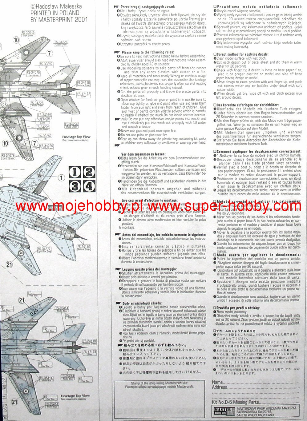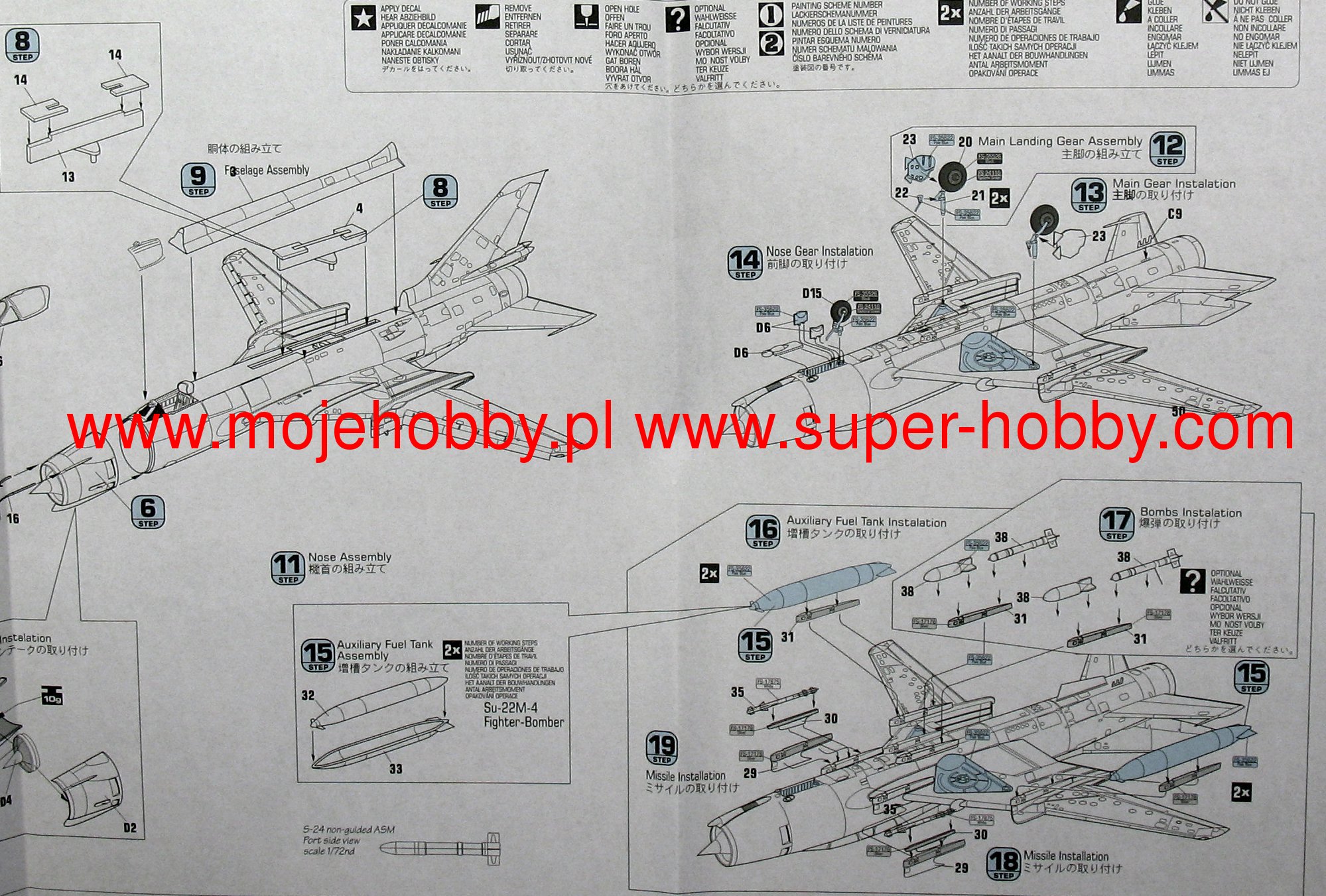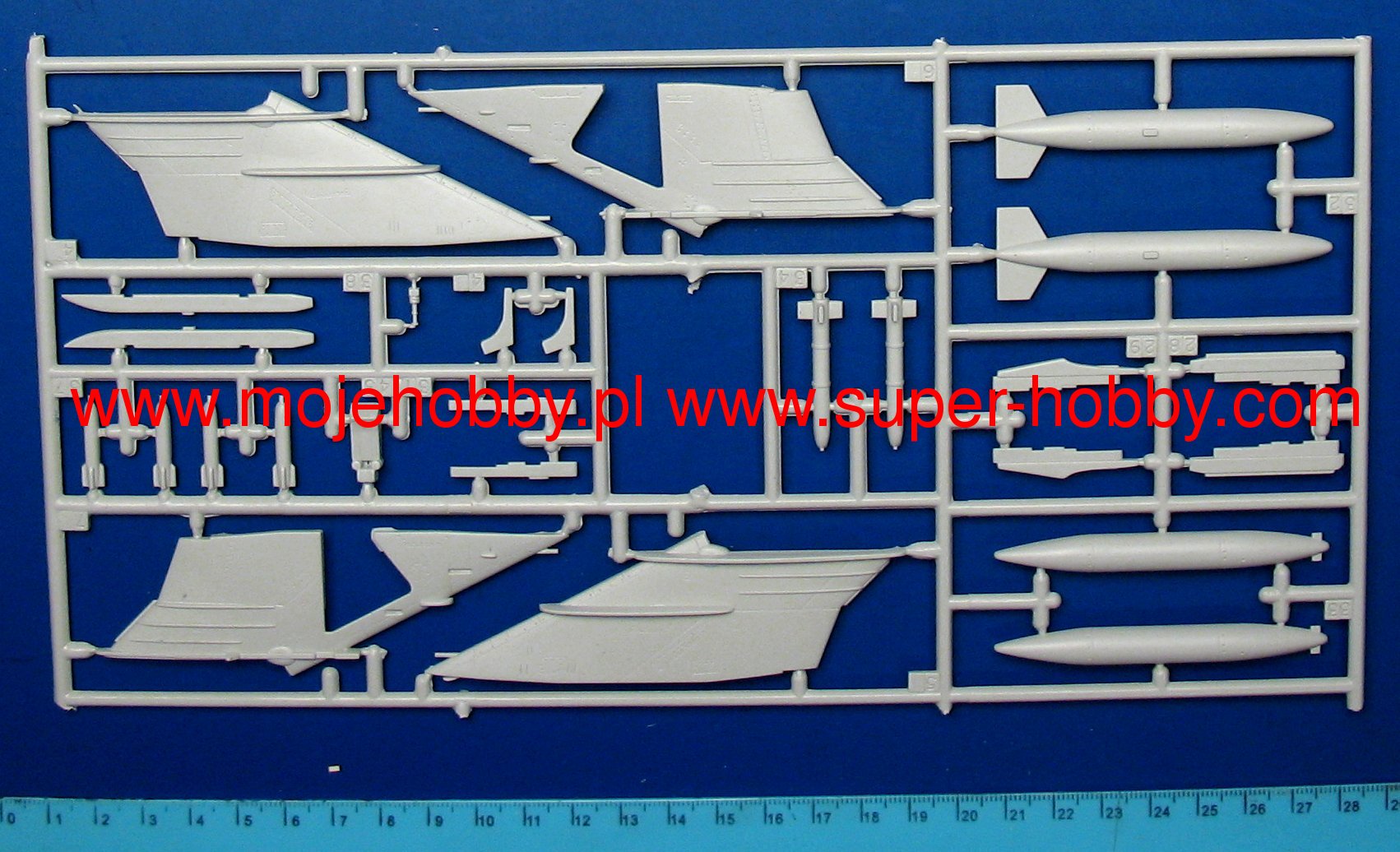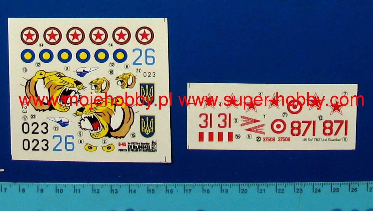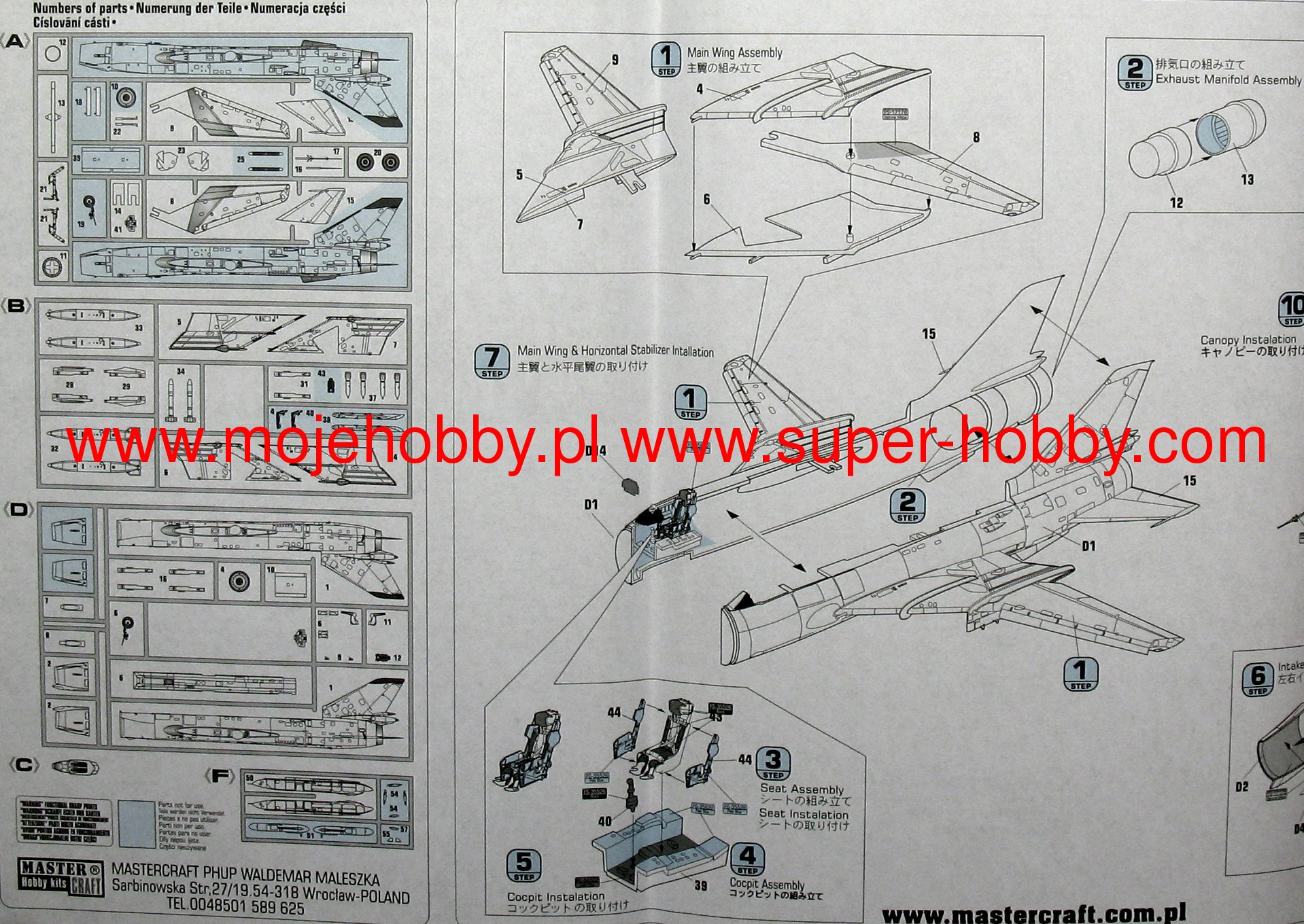 Note: Comany Mistercraft frequently changes, without any notice, the decals that come with the model, so they may differ from the photos and descriptions on our website. If you need a specific version, please let us know about that by entering the appropriate notice in the comments field when placing the order. The Sukhoi Su-17 Fitter is a Soviet single-engine attack bomber with variable wing geometry. The flight of the prototype took place on August 2, 1966. The line was entered in 1970. The Su-17 is a development of the Su-7 design, has the same fuselage, engine, landing gear and tail, but has different wings. Initially, the machine was designated as Su-7IG. A dozen or so versions of this aircraft were created, which under the designations Su-20 and Su-22 were massively exported to allied countries, including Poland. Technical data: length: 19.02m, wingspan (folded wings): 10.03m, height: 5.1m, maximum speed: 1.7Ma, rate of climb: 230m / s, practical ceiling: 17000m, maximum range (with additional): 2250 km, combat radius with full load: 180 km, armament: fixed - 2 NR-30 30mm cannons, suspended - up to 4070 kg of cargo.