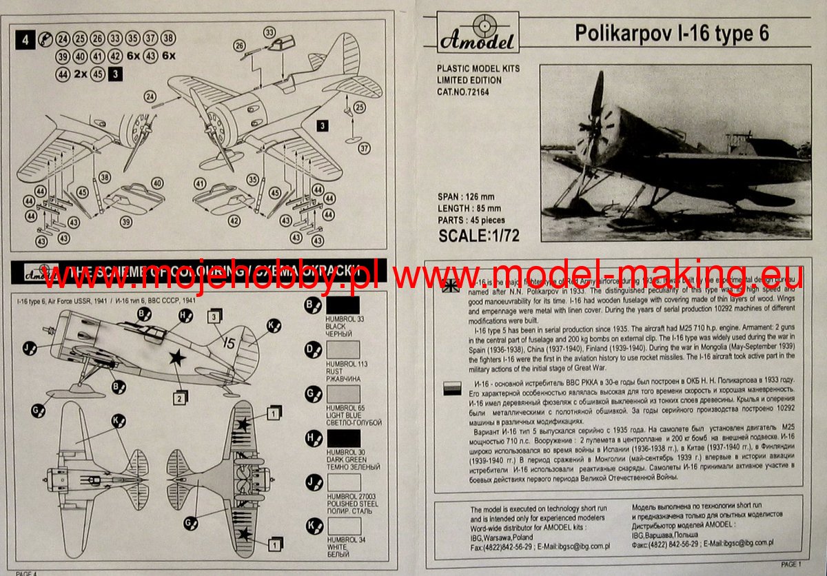 The Polikarpov I-16 is a Soviet, single-engine low-wing fighter in a mixed design with a classic tail. The prototype's flight took place in 1933. The I-16 turned out to be one of the most modern fighters of that period. It had retractable wheels, modern wing geometry and the ability to change the "turn" of the propeller. At the same time, however, due to its short hull, it was very difficult to pilot and required a lot of attention from the pilot. I-16 had its baptism of fire during the Spanish Civil War, where about 500 units were delivered to the republican troops. The plane surprised the Frankists with its incredible maneuverability, firepower and speed of climb. In 1939, the I-16s was sent to China, which was fighting against Japan, and there it surprised its opponents again. Initially, the M-22 engine was used as a power unit, but on subsequent versions it was replaced with other power units, min. M-25 or M-63. The I-16 remained in the line on the Eastern Front until 1942, serving as not only a fighter, but also an attack aircraft. Technical data (version I-16 Type 24): length: 6.13m, wingspan: 9m, height: 3.25m, maximum speed: 525km / h, rate of climb: 14.7m / s, practical ceiling: 9700m, range maximum: 700km, armament: fixed - two 7.62mm SzKAS machine guns and two 20mm ShWAK cannons, suspended - up to 500 kg of bombs.