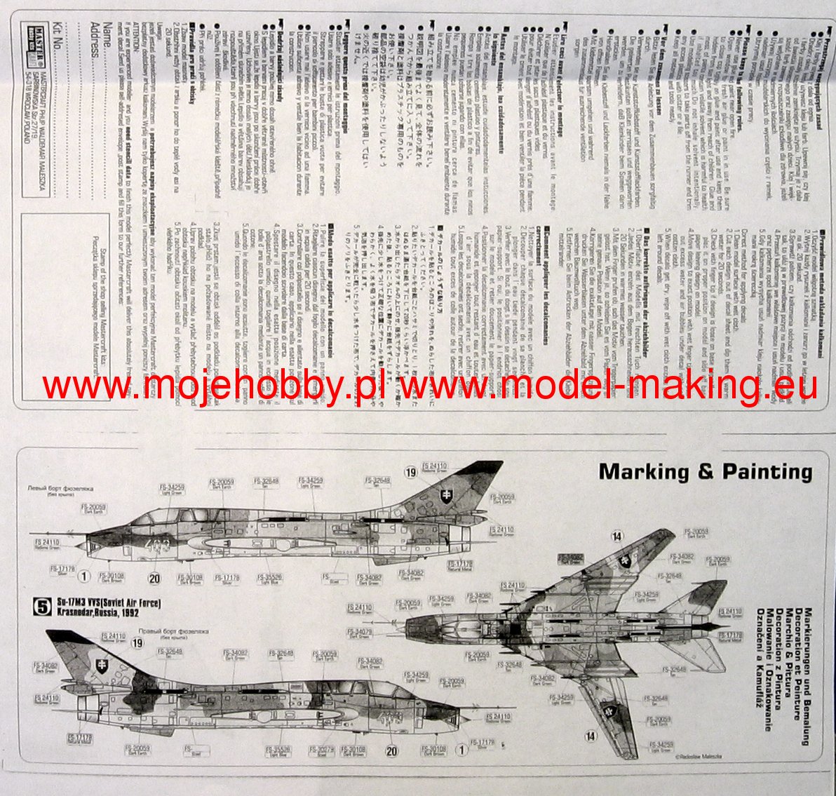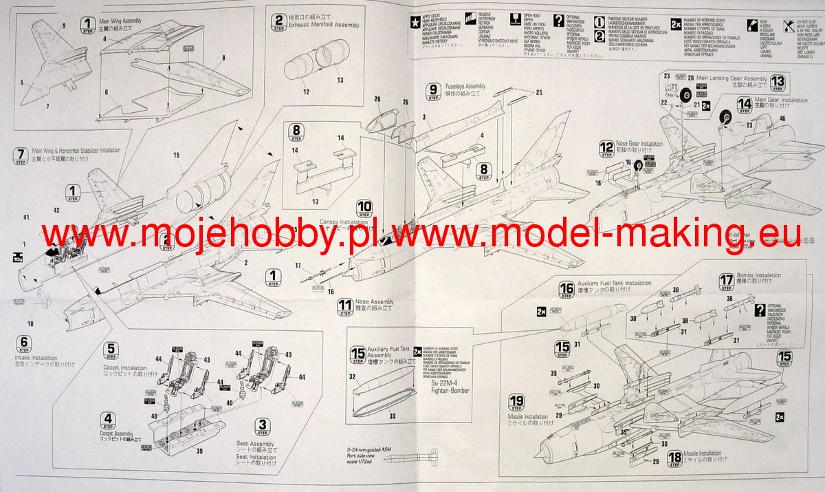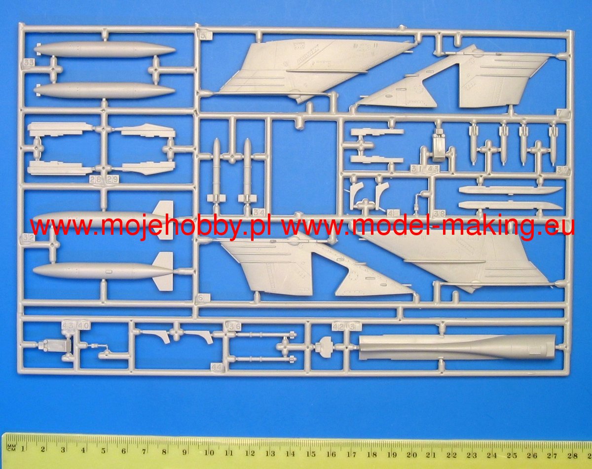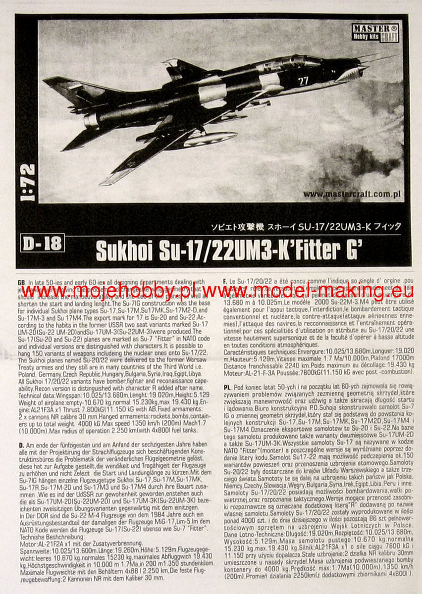 Note: Comany Mistercraft frequently changes, without any notice, the decals that come with the model, so they may differ from the photos and descriptions on our website. If you need a specific version, please let us know about that by entering the appropriate notice in the comments field when placing the order. The Sukhoi Su-17 Fitter is a Soviet single-engine attack bomber with variable wing geometry. The flight of the prototype took place on August 2, 1966. The line was entered in 1970. The Su-17 is a development of the Su-7 design, has the same fuselage, engine, landing gear and tail, but has different wings. Initially, the machine was designated as Su-7IG. A dozen or so versions of this aircraft were created, which under the designations Su-20 and Su-22 were massively exported to allied countries, including Poland. Technical data: length: 19.02m, wingspan (folded wings): 10.03m, height: 5.1m, maximum speed: 1.7Ma, rate of climb: 230m / s, practical ceiling: 17000m, maximum range (with additional): 2250 km, combat radius with full load: 180 km, armament: fixed - 2 NR-30 30mm cannons, suspended - up to 4070 kg of cargo.