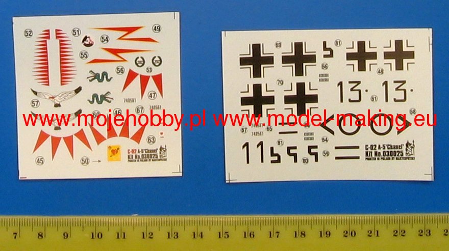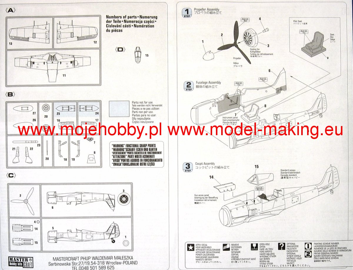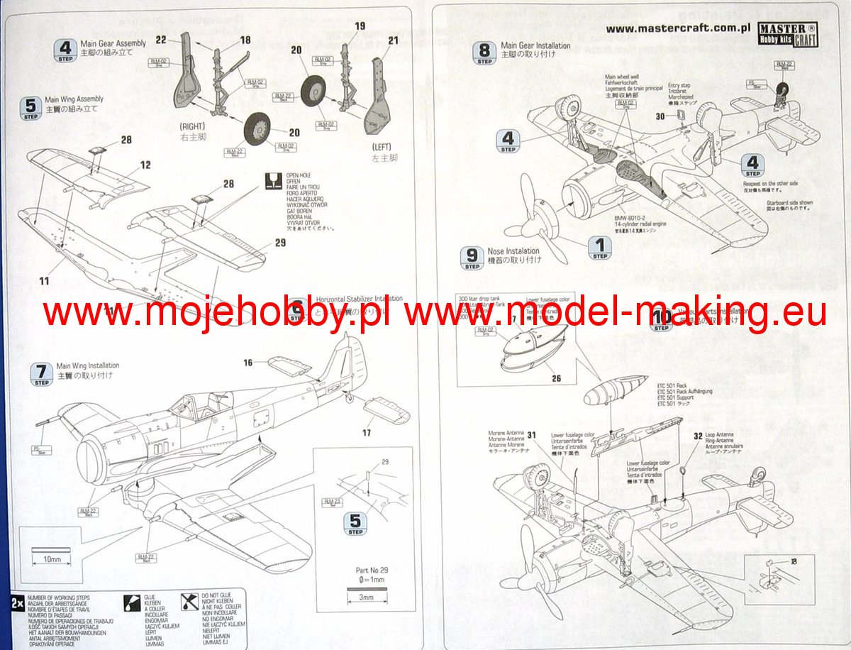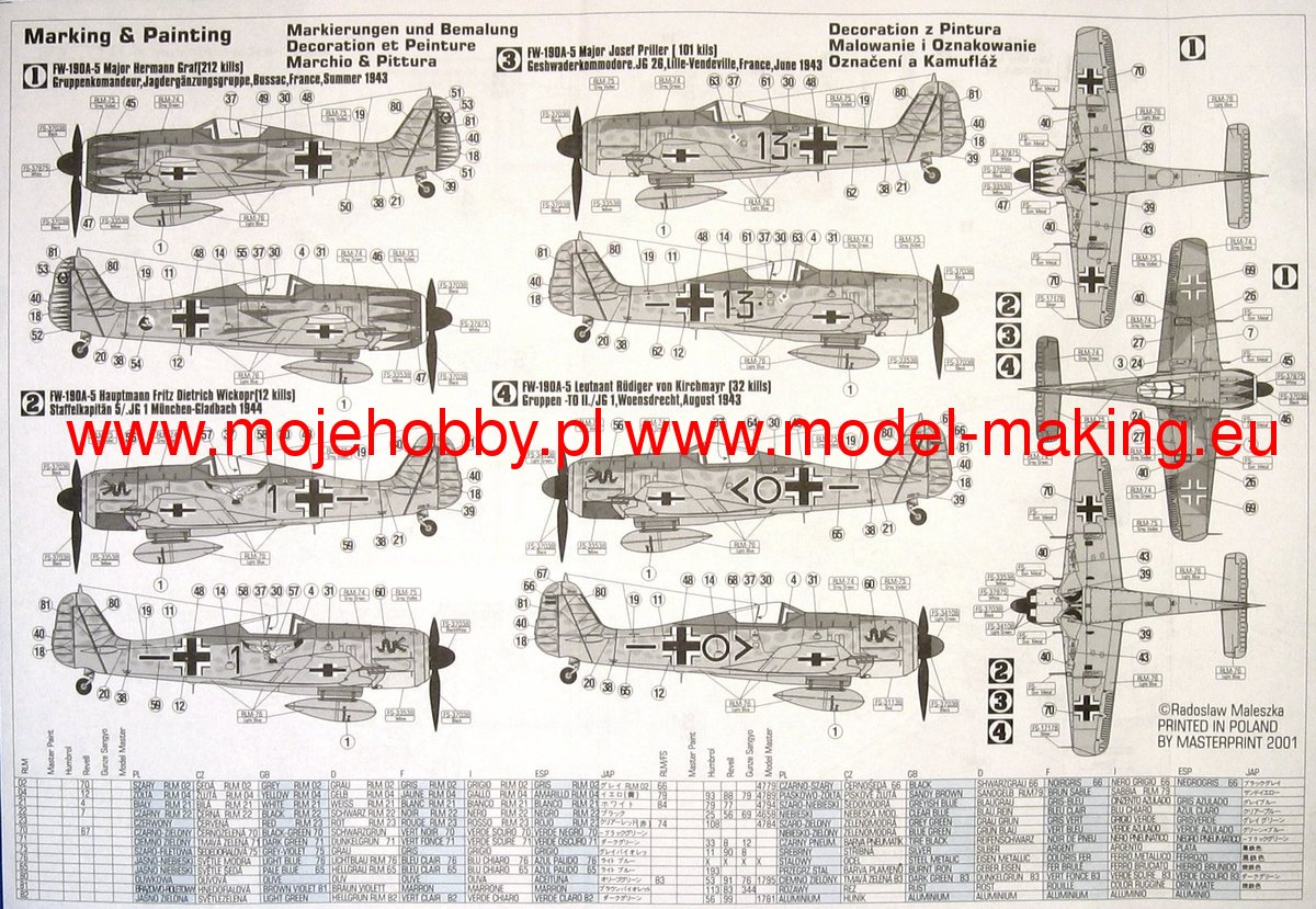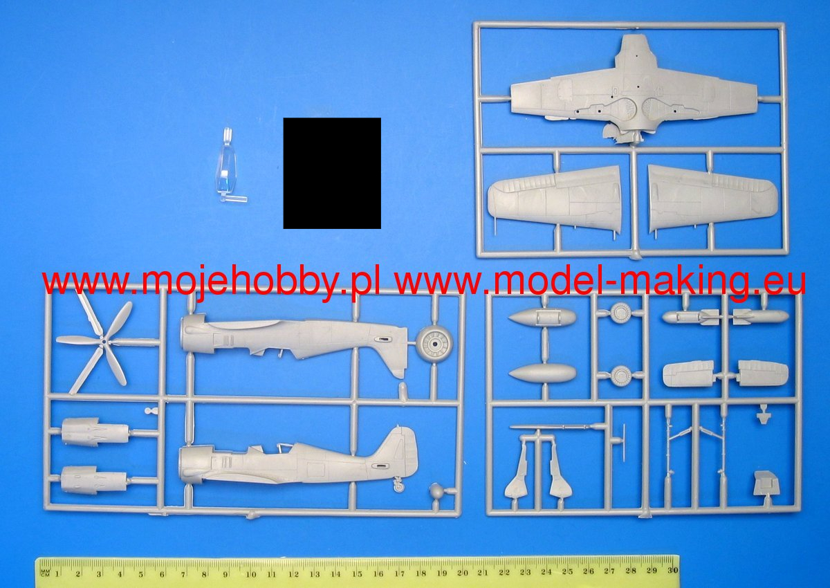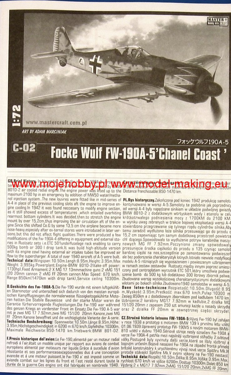 Note: Comany Mistercraft frequently changes, without any notice, the decals that come with the model, so they may differ from the photos and descriptions on our website. If you need a specific version, please let us know about that by entering the appropriate notice in the comments field when placing the order. The Focke-Wulf Fw-190 is a German, single-engine, full-metal fighter aircraft with a covered cabin in the low wing design of the Second World War. The pilots considered the Fw-190 to be a better aircraft than the Messerschmitt Bf-109. A self-supporting low wing with a working Fw-190 coating was commissioned by the Luftfahrtministerium, assembled in the fall of 1937. Kurt Tank submitted two propulsion proposals - the first with a liquid-cooled Daimler-Benz DB 601 engine, and the second with the new BMW 139 radial engine. The latter was chosen, and the work started in the spring of 1938 was headed by Obering R. Blaser. The first prototype of the Fw-190V1 was ready in May 1939, and it was flown in Bremen on June 1, 1939 by Captain Hans Sander. The second prototype, the FW-190V2, armed with two MG131 and two MG17 machine guns - all 7.92 mm caliber, was flew in October 1939. To reduce aerodynamic drag, both were equipped with a tunnel air inlet in the propeller cap, but problems with overheating of the engine resulted in a return to the proven NACA shield design. Before the tests of these prototypes began for good, the decision was already made to replace the BMW 139 engine with a stronger, but longer and heavier BMW 801. It required many changes, strengthening the structure and moving the cabin back, which later became a source of problems with the center of gravity. The advantage was the removal of problems with exhaust gas permeation and overheating of the cabin interior due to its direct vicinity to the BMW 139 engine. The third and fourth prototypes were abandoned, and the Fw-190V5 with the new engine was completed at the beginning of 1940. Later, it received wings with a wingspan enlarged by one meter (from the original 9.5 m), which made it 10 km / h slower, but it increased the rate of climb and improved maneuverability. It was marked Fw-190V5g, and the variant with the shorter wing was Fw-190V5k. The first seven machines of the Fw-190A-0 information series had a short wing, the rest - a longer one. The first operational unit equipped with the Fw-190 - 6./JG 26 stationed at Le Bourget, declared its operational readiness in August 1941 and from the first meeting of the new fighter with the British Supermarine Spitfire, its advantage over them became apparent. During the war, a dozen or so versions of this great plane were created. The machines of the "A" version, along with a dozen or so modernizations, served as fighter planes. The versions marked "B" and "C" were only prototypes of high-altitude fighters intended for fighting strategic bombers, but they did not enter into serial production. The "D" variant, as the only one of the Fw-190s, was powered by the new 1750HP Jumo 213A engine and was the German response to the P-51 Mustang. The new engine extended the fuselage by several dozen centimeters. This variant also performed mainly hunting and high-altitude fighter tasks. Numerous variants of the "F" version were used as fighter-bombers as direct support of the battlefield. The "G" version played the same role as the "F" version, but had a greater range. During the entire war, over 20,000 copies of this one of the best fighters of World War II were produced. Technical data (version Fw-190A-8): length: 9m, wingspan: 10.51m, height: 3.95m, maximum speed: 656km / h, rate of climb: 15m / s, maximum range: 800km, maximum ceiling 11410m , armament: fixed-2 MG131 13mm machine guns and 4 MG151 20mm cannons (2 MG 151 / 20E cannons for the D-9 version).