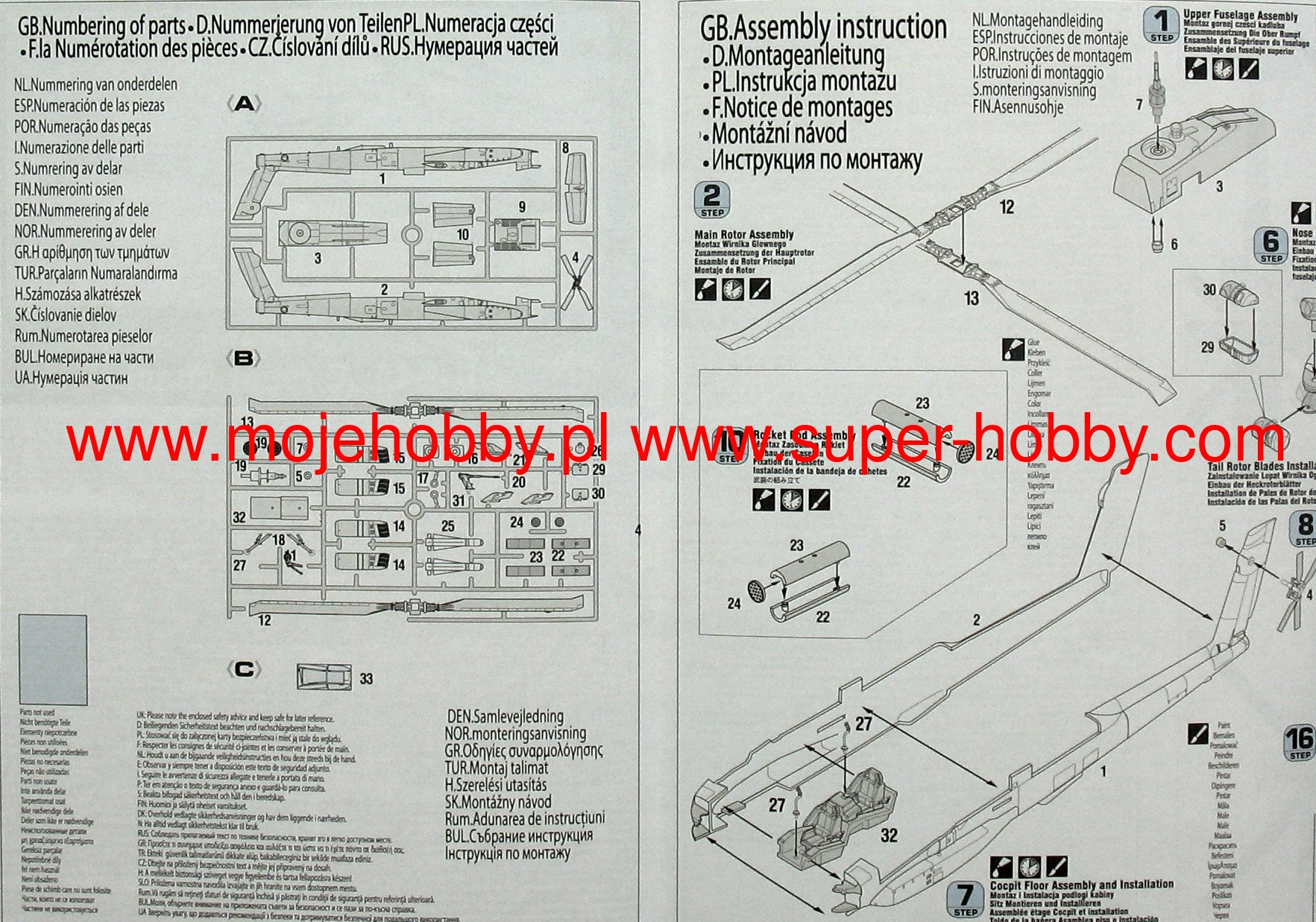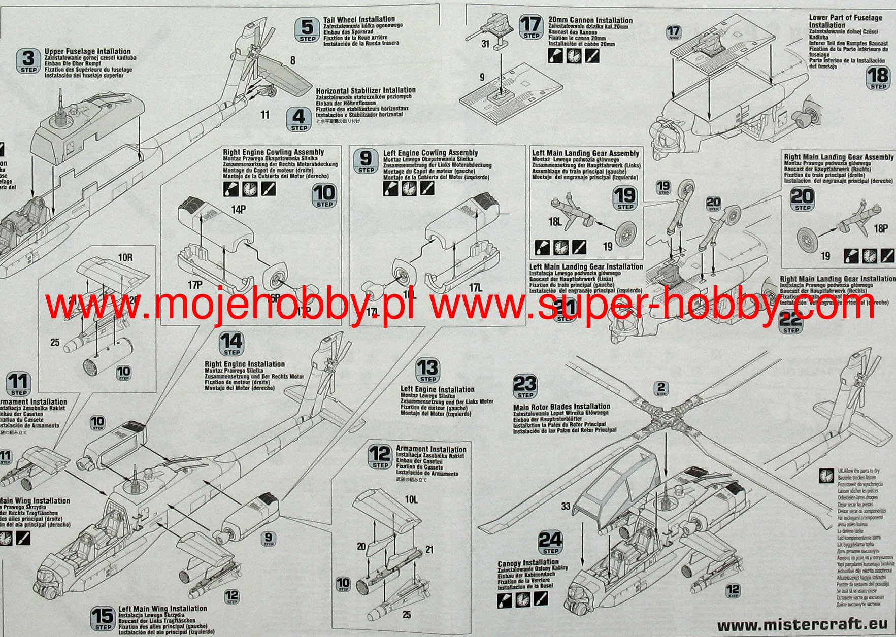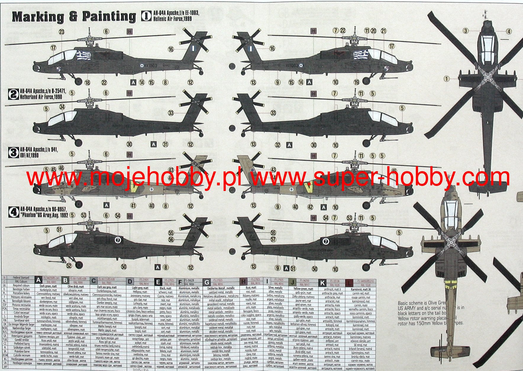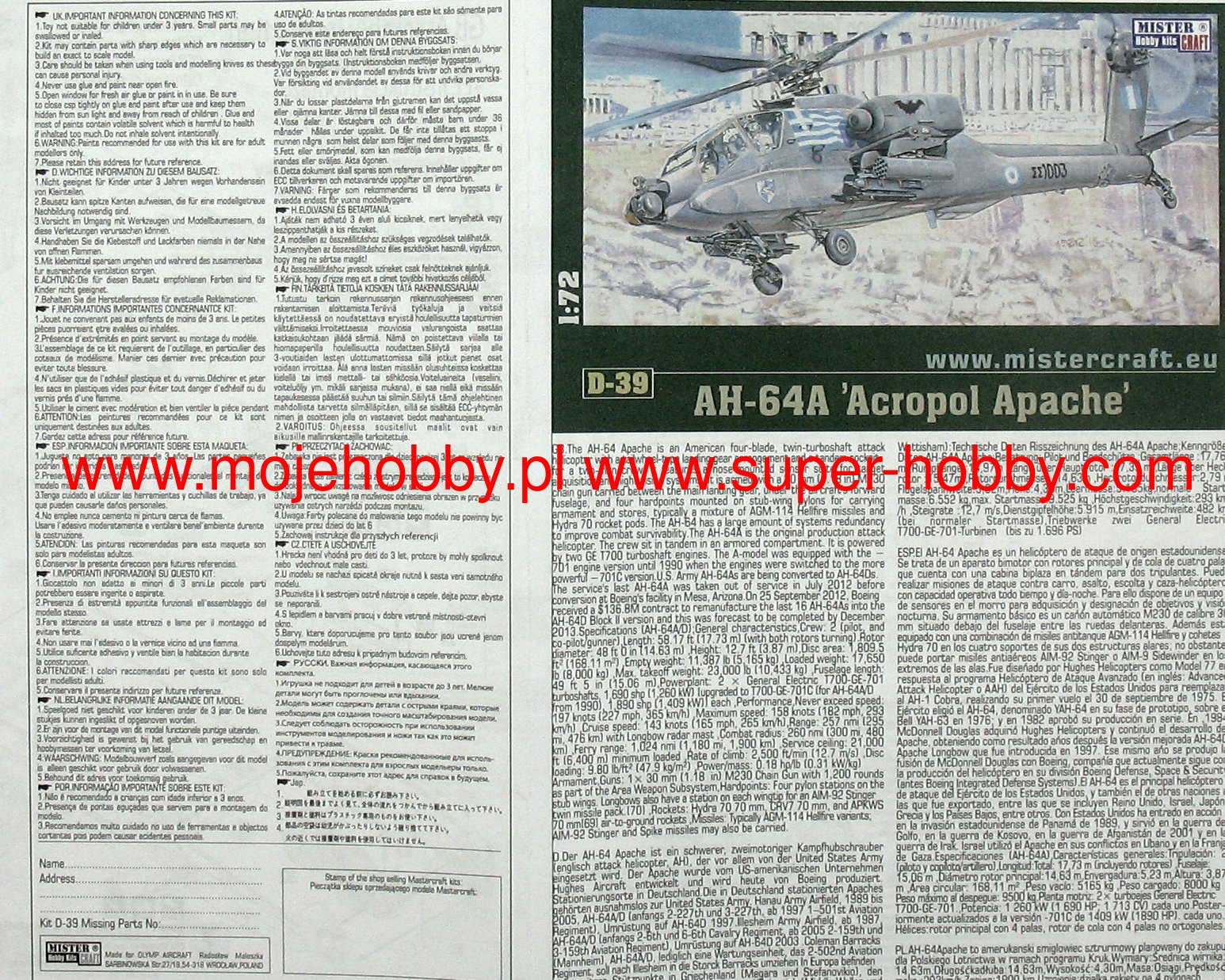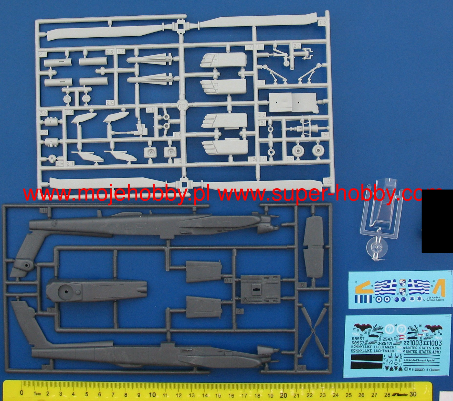 Note: Comany Mistercraft frequently changes, without any notice, the decals that come with the model, so they may differ from the photos and descriptions on our website. If you need a specific version, please let us know about that by entering the appropriate notice in the comments field when placing the order. The McDonnell-Douglas (Boeing) AH-64 helicopter was selected as the winner in the competition with Bell's YAH-63 in December 1976. The name Apache stuck to the helicopter in 1981. This highly efficient machine has four-blade rotors driven by two General Electric T700-701 turbine engines with a capacity of 1696HP. The vestigial wings are fitted with conventional trailing edge flaps, and a plate tail improves longitudinal steering. The two-man crew takes seats one after the other in the armored cabin. The pilot's seat is in the rear, and the weapon operator / gunner is in the front. The key to the universal use of the helicopter are the TADS systems on the gunner's stand and the PNVS systems used by the pilot. The TADS is a target-tracking laser marker and rangefinder set and a forward-facing infrared sensor that is duplicated by the normal optics. The PNVS system is a developed FLIR system that allows you to pilot a helicopter just above the ground in order to prevent or delay detection by the enemy's anti-aircraft defense. Apache helicopters took part in the operation in Panama in 1989, during the Desert Storm in 1991, or the last conflict in Iraq (2003). At the end of 1990, the construction of a new version of the helicopter began, equipped with a Martin / Westinghouse Longbow millimeter radar installed above the head to control the weapons. It is used to control the Rockwell AGM-114 Hellfire anti-tank missiles. Technical data: Top speed: 300 km / h; climb speed 12.7 m / s, maximum range (without external tanks): 689 km, armament: 30mm Hughes M230A1 Chain Gun fixed-1 cannon, and outboard armaments - most often Hellfire missiles.