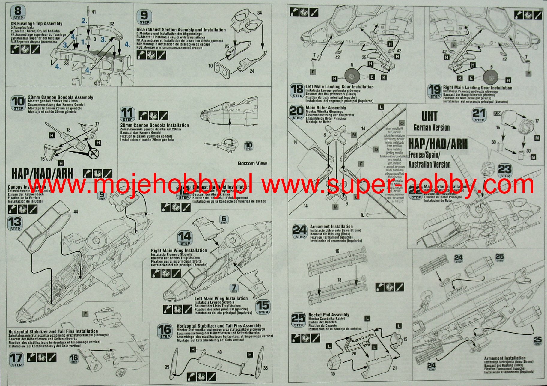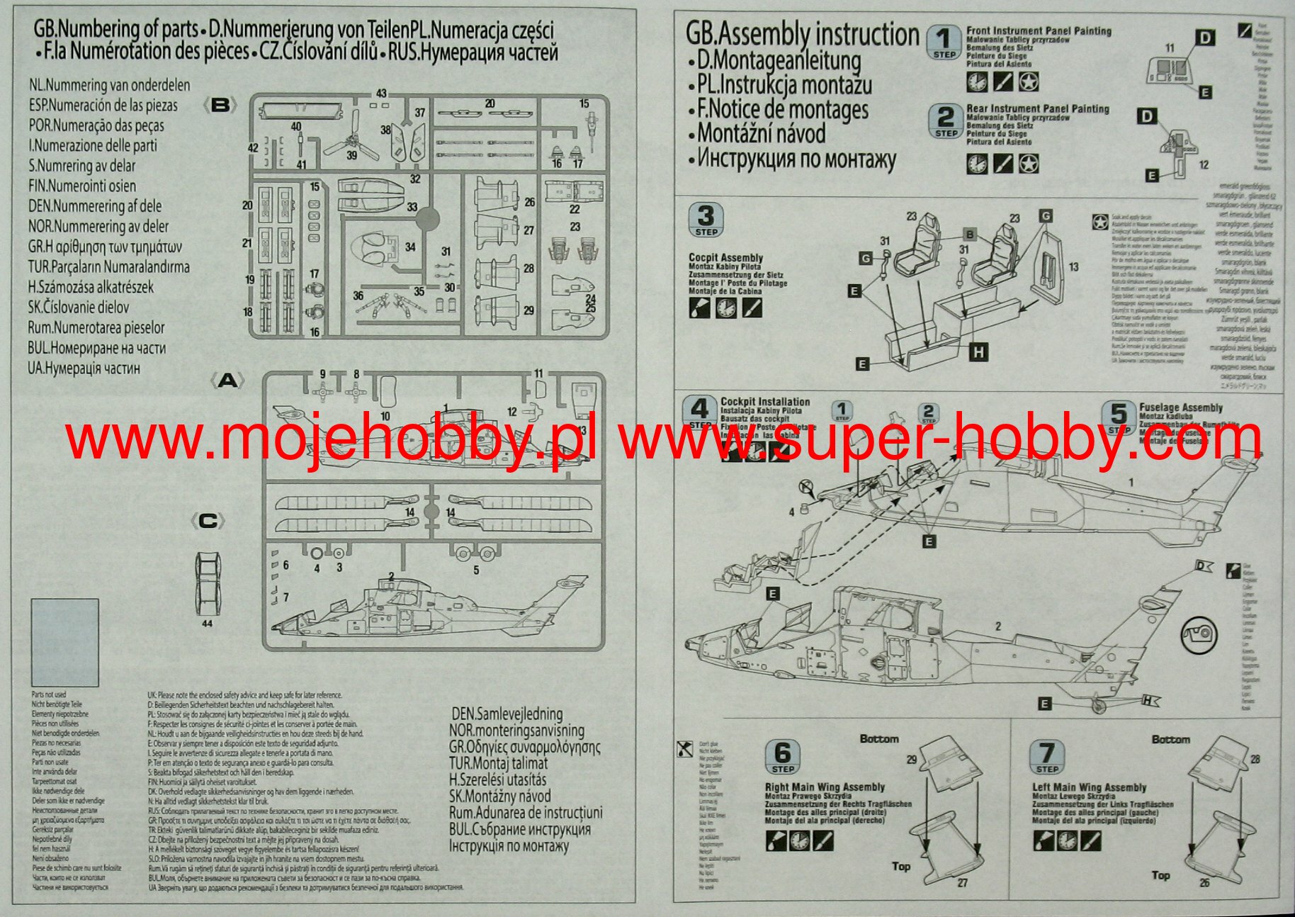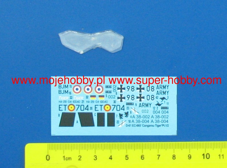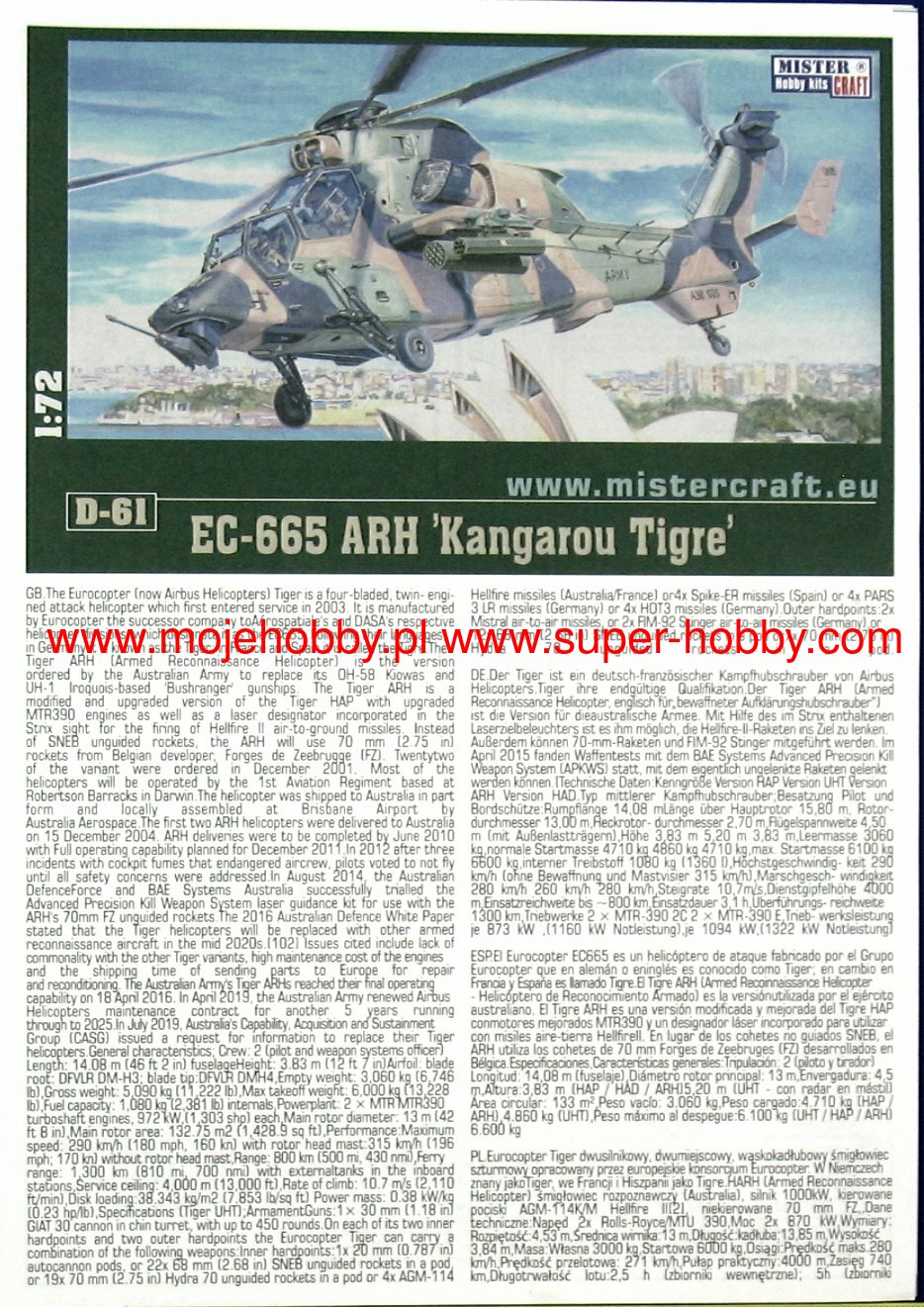 Note: Comany Mistercraft frequently changes, without any notice, the decals that come with the model, so they may differ from the photos and descriptions on our website. If you need a specific version, please let us know about that by entering the appropriate notice in the comments field when placing the order. Eurocopter Tiger is a twin-engine attack helicopter of German, Spanish and Italian production, with a metal structure in a classic arrangement with a main rotor and a tail rotor on the beam. In the basic version, the drive is provided by two Rolls-Royce / MTU 390 engines with 1183 HP each. The flight of the first prototype took place in 1991, and serial production, which only started in 2002, is still ongoing. At present (2017), it is estimated that approx. 100 copies of this helicopter have been produced. The Eurocopter Tiger was created in response to a competition announced in 1984 by the French and German Ministry of Defense for a new attack helicopter for the armies of both countries. In order to reduce costs, a consortium of Aerospatiale and MBB was established. In the course of serial production, four specialized development versions were created, produced in - so far - in relatively short batches. One of them is the UHT version used by the German army as an anti-tank helicopter. Interestingly - this version does not have a plot. Another is the version of the HAP used by the armies of France and Spain as a close support and escort helicopter. In general, all versions of the Eurocopter Tiger are very similar to each other and differ mainly in their weapons and avionics. Eurocopter Tiger have been used in combat in Afghanistan by France, Germany and Spain since 2009.
