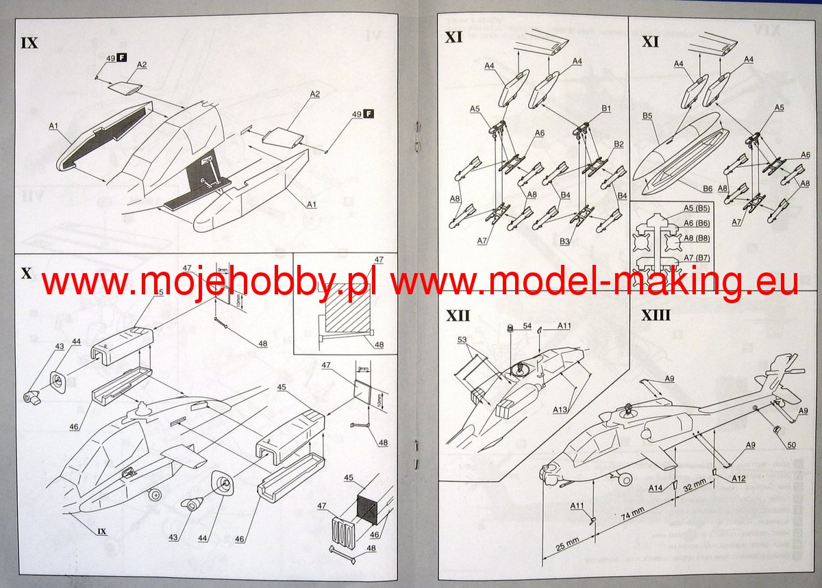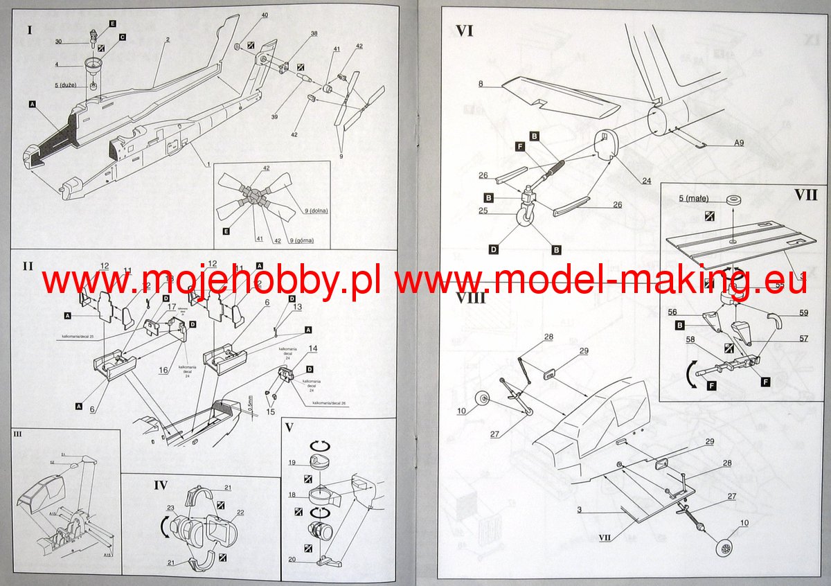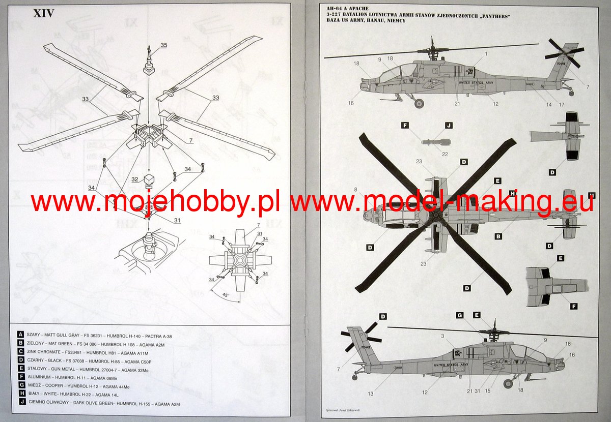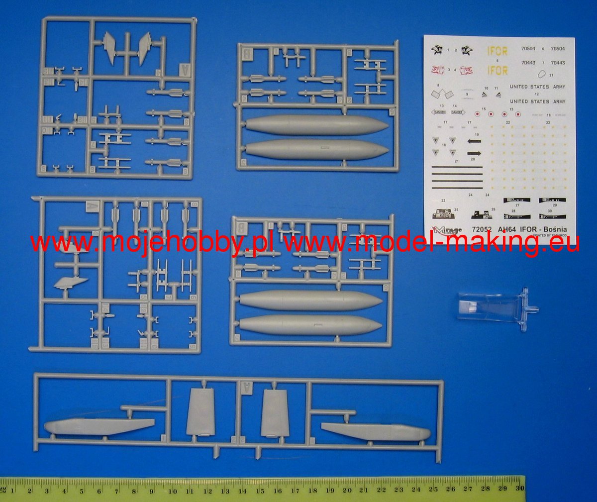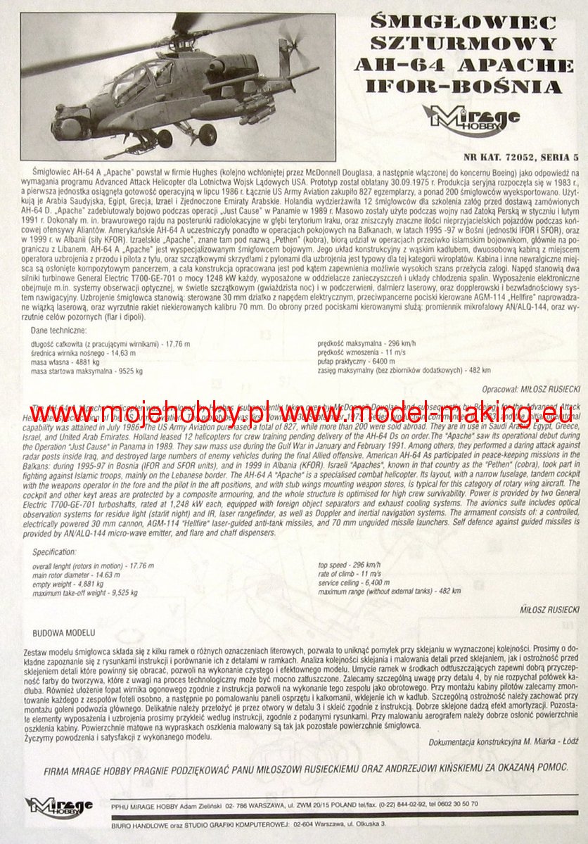 Download Mirage Hobby PDF catalogueThe McDonnell-Douglas (Boeing) AH-64 helicopter was selected as the winner in the competition with Bell's YAH-63 in December 1976. The name Apache stuck to the helicopter in 1981. This highly efficient machine has four-blade rotors driven by two General Electric T700-701 turbine engines with a capacity of 1696HP. The vestigial wings are fitted with conventional trailing edge flaps, and a plate tail improves longitudinal steering. The two-man crew takes seats one after the other in the armored cabin. The pilot's seat is in the rear, and the weapon operator / gunner is in the front. The key to the universal use of the helicopter are the TADS systems on the gunner's stand and the PNVS systems used by the pilot. The TADS is a target-tracking laser marker and rangefinder set and a forward-facing infrared sensor that is duplicated by the normal optics. The PNVS system is a developed FLIR system that allows you to pilot a helicopter just above the ground in order to prevent or delay detection by the enemy's anti-aircraft defense. Apache helicopters took part in the operation in Panama in 1989, during the Desert Storm in 1991, or the last conflict in Iraq (2003). At the end of 1990, the construction of a new version of the helicopter began, equipped with a Martin / Westinghouse Longbow millimeter radar installed above the head to control the weapons. It is used to control the Rockwell AGM-114 Hellfire anti-tank missiles. Technical data: Top speed: 300 km / h; climb speed 12.7 m / s, maximum range (without external tanks): 689 km, armament: 30mm Hughes M230A1 Chain Gun fixed-1 cannon, and outboard armaments - most often Hellfire missiles.