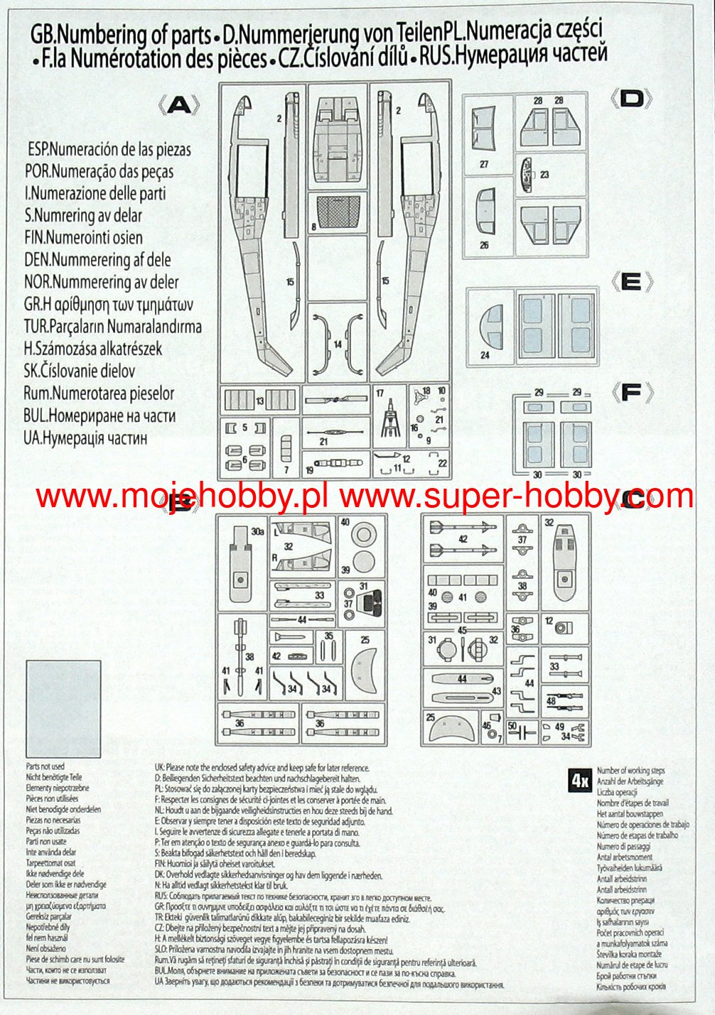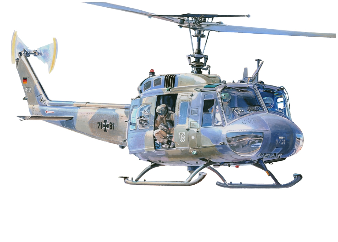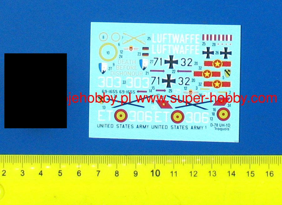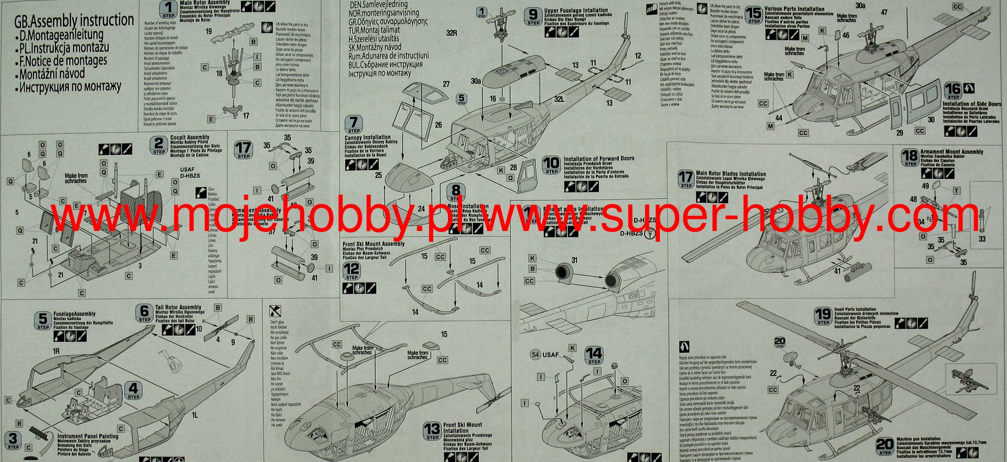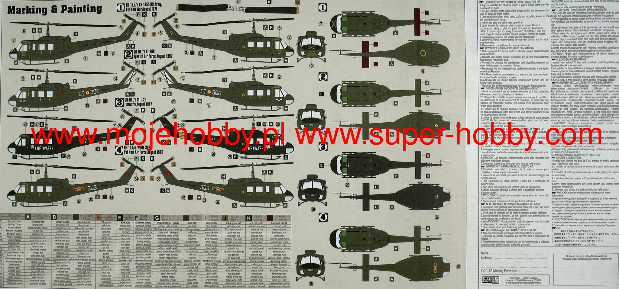 Note: Comany Mistercraft frequently changes, without any notice, the decals that come with the model, so they may differ from the photos and descriptions on our website. If you need a specific version, please let us know about that by entering the appropriate notice in the comments field when placing the order. Bell UH-1 Iroquois (commonly known as Huey) is a multirole helicopter of American production from the Cold War and modern times. The flight of the prototype took place in 1956, and the machine entered service in 1959. The helicopter - in the UH-1D version - has a total length of 17.4 m, and the diameter of its main rotor is 14.6 meters. The drive is provided by a single 1100 HP Lycoming T-53-L-11 engine. Its maximum speed in horizontal flight reaches 220 km / h. The helicopter has a classic layout with a single main rotor and a propeller on the tail boom. Work on the Bell UH-1 machine, commonly known as the Huey, started in the early 1950s, when the US Army reported a need for a new transport, medical evacuation (MEDAVAC) and multi-role helicopter. The emphasis is on the simplest and classic design as well as high reliability. Bell UH-1 helicopters performed very well during the Vietnam War (1964 / 1965-1975), where they underwent their baptism of fire. Due to their indiscriminate use in this conflict, they have almost become a symbol of this war. In the course of production, many development versions of this helicopter were created, among which the following can be indicated: UH-1 C (version adapted to take small arms and unguided rockets and with a more powerful engine compared to versions A and B), UH-1 D ( basic, transport, production version) or UH-1H (an improved D version with a more powerful drive unit). It is worth noting that the UH-1Y Venom version was also created, but due to the number of upgrades and improvements, it should rather be viewed as a separate helicopter model. The Bell UH-1 helicopter has gained enormous popularity and in various versions has been or is still operated by countries such as: Argentina, Brazil, Bolivia, Chile, Georgia, Japan, Germany and Italy.