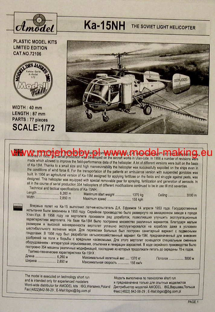 The Kamow Ka-15 (in NATO code: Hen) was a light, multi-role, metal-structure Soviet-made helicopter with a fixed, four-support landing gear in a very rare coaxial twin-rotor system. The drive was provided by a single star Ivchenko AI-14 V with a power of 255 HP. The flight of the first prototype took place in 1952, and the machine was introduced to the line in 1955. Serial production was undertaken by the Aviation Works in Ulan-Ude. It is estimated that no more than 400 machines of this type were built. All Ka-18 helicopters were withdrawn from the line in the early 1970s. The Kamow Ka-15 was produced in two versions. The first (Ka-15) was used by the Soviet Navy to patrol coastal waters. Then the civilian version (Ka-15M) was developed, which could take a pilot and one passenger or 250 kg. cargo. It was used primarily for patrolling forests, helping fishing boats, or it was also used in agriculture.