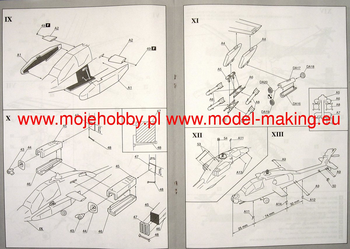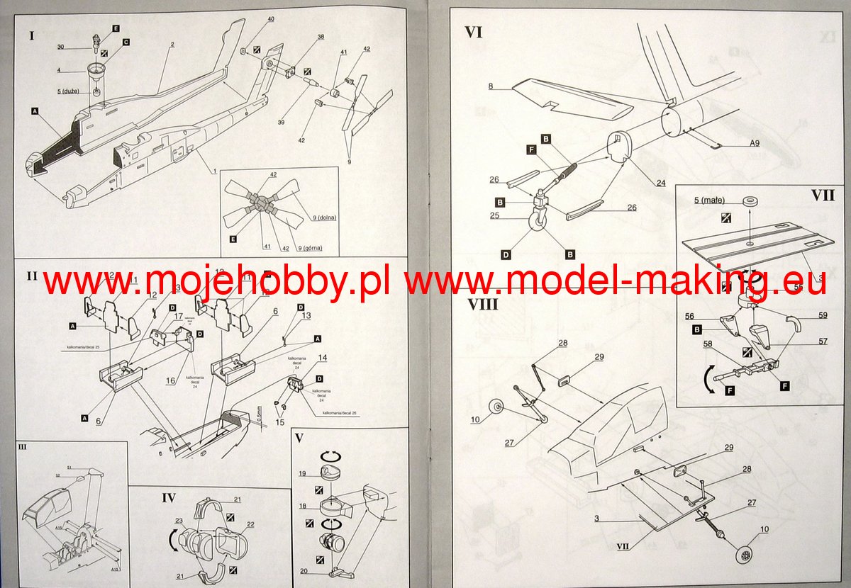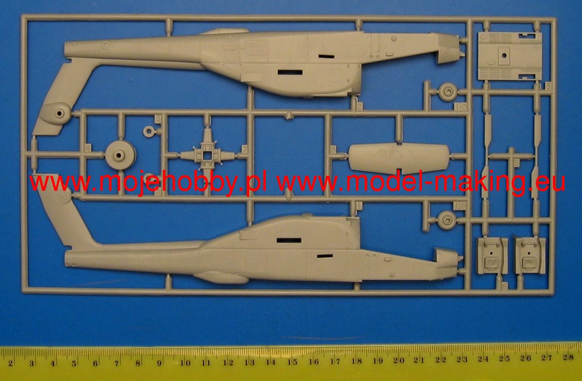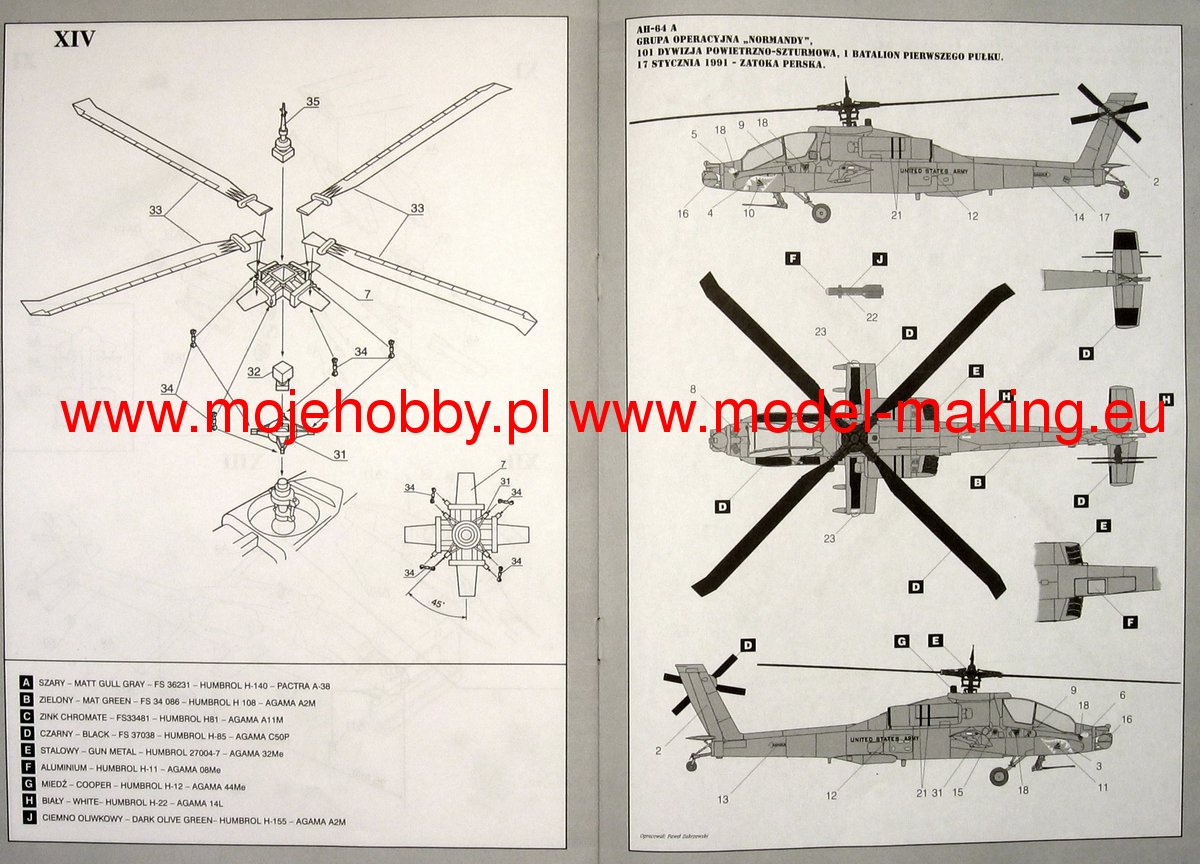 Download Mirage Hobby PDF catalogueThe McDonnell-Douglas (Boeing) AH-64 helicopter was selected as the winner in the competition with Bell's YAH-63 in December 1976. The name Apache stuck to the helicopter in 1981. This highly efficient machine has four-blade rotors driven by two General Electric T700-701 turbine engines with a capacity of 1696HP. The vestigial wings are fitted with conventional trailing edge flaps, and a plate tail improves longitudinal steering. The two-man crew takes seats one after the other in the armored cabin. The pilot's seat is in the rear, and the weapon operator / gunner is in the front. The key to the universal use of the helicopter are the TADS systems on the gunner's stand and the PNVS systems used by the pilot. The TADS is a target-tracking laser marker and rangefinder set and a forward-facing infrared sensor that is duplicated by the normal optics. The PNVS system is a developed FLIR system that allows you to pilot a helicopter just above the ground in order to prevent or delay detection by the enemy's anti-aircraft defense. Apache helicopters took part in the operation in Panama in 1989, during the Desert Storm in 1991, or the last conflict in Iraq (2003). At the end of 1990, the construction of a new version of the helicopter began, equipped with a Martin / Westinghouse Longbow millimeter radar installed above the head to control the weapons. It is used to control the Rockwell AGM-114 Hellfire anti-tank missiles. Technical data: Top speed: 300 km / h; climb speed 12.7 m / s, maximum range (without external tanks): 689 km, armament: 30mm Hughes M230A1 Chain Gun fixed-1 cannon, and outboard armaments - most often Hellfire missiles.