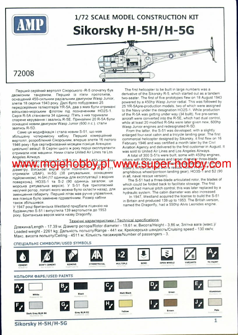 The Sikorsky R-5 (other designations: Sikorsky H-5, S-48 or S-51) was an American multipurpose helicopter from World War II and the post-war period. The flight of the prototype took place in 1943, and the machine was put into the line in 1945. In total, it is estimated that over 300 helicopters of this type were built. The drive was provided by a single Pratt and Whitney Wasp Junior engine with 450 HP. The hull length of this machine was 17.4 meters, and the main rotor diameter was 14.63 meters. The maximum take-off weight oscillated around 2,200 kilograms, and the maximum speed did not exceed 175 km / h. The Sikorsky R-5 was developed on the basis of the manufacturer's previous machine - the R-4 model. In relation to it, it was characterized primarily by the ability to carry loads of greater weight, but also by a higher speed or maximum and operational ceiling. It also used an engine with more than twice the power as a drive unit! Several versions of the Sikorsky R-5 helicopter were developed in the course of serial production, including: R-5A (medical evacuation version), R-5D (version with improved chassis) or H-5G (version with a four-person cabin and rescue equipment). The Sikorsky R-5 machines were used on a relatively large scale during the Korean War (1950-1953). It is worth adding that the machine was licensed in Great Britain under the name Westland-Sikorsky WS-51 Dragonfly.