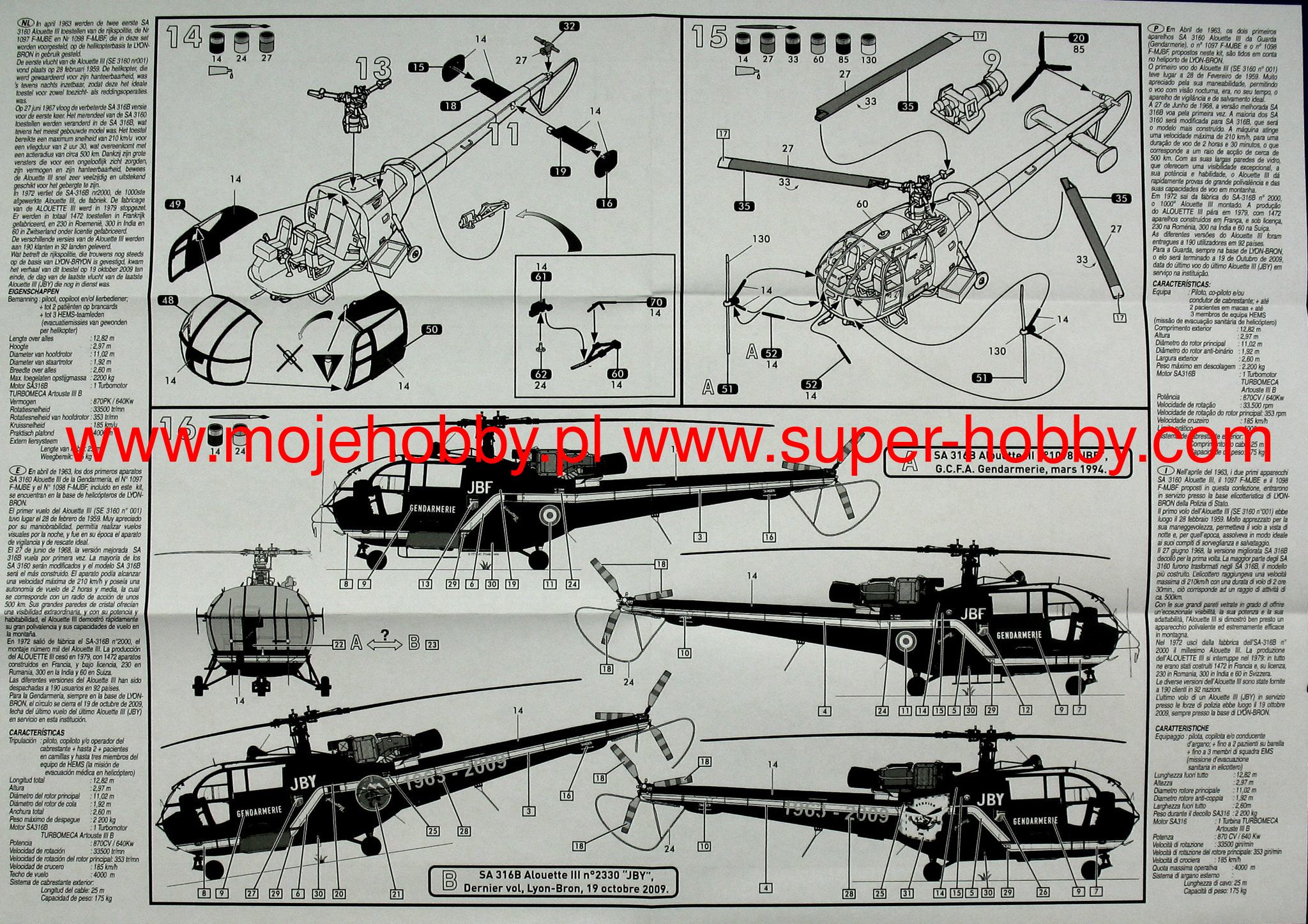 Aerospatiale Alouette III was a light, multi-role French-made helicopter. A prototype flight took place in 1959, and the machine entered production in 1960. More than 2,000 helicopters of this type, of all versions, were built in its course. The drive, in the basic version, was provided by a single engine Turbomeca Artouste IIIB with 570 HP. The length of the helicopter was 10.03 meters, with a main rotor diameter of 11.02 meters. The maximum take-off weight was 2,200 kilograms. The Aerospatiale Alouette III was created as a far-reaching development of the very successful Alouette II machine. Compared to its predecessor, however, it was clearly larger, as the drive used more powerful engines. It was also able to carry more people or cargo and had slightly better aerodynamic properties. Several versions of the helicopter were created in the course of production, among them: SA-316A Alouette III (basic version), SA-316B (version with improved transmission and greater take-off weight) or SA-319B (version powered by the engine Turbomeca Astazou XIV). Helicopter Aerospatiale Alouette III was quite commercially successful and has been or is still operated by countries such as Argentina, Austria, France, Ethiopia and Cameroon.