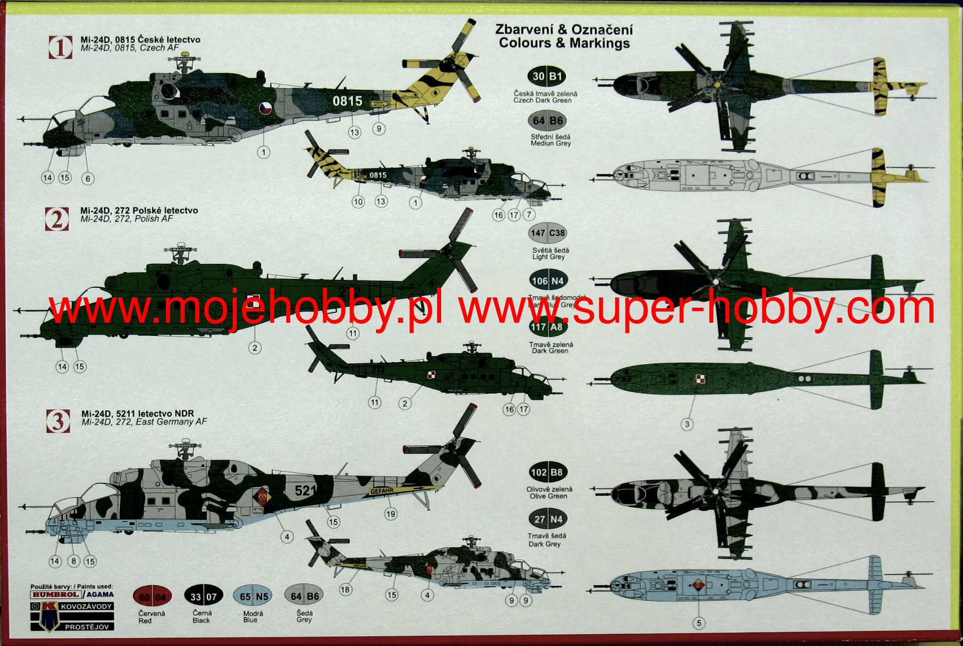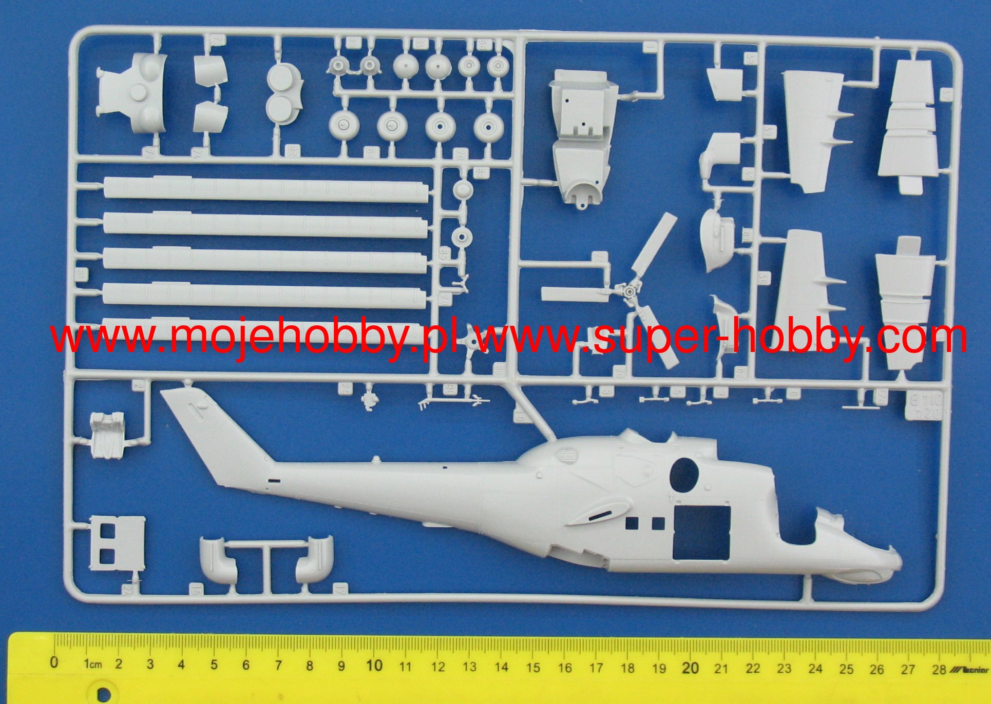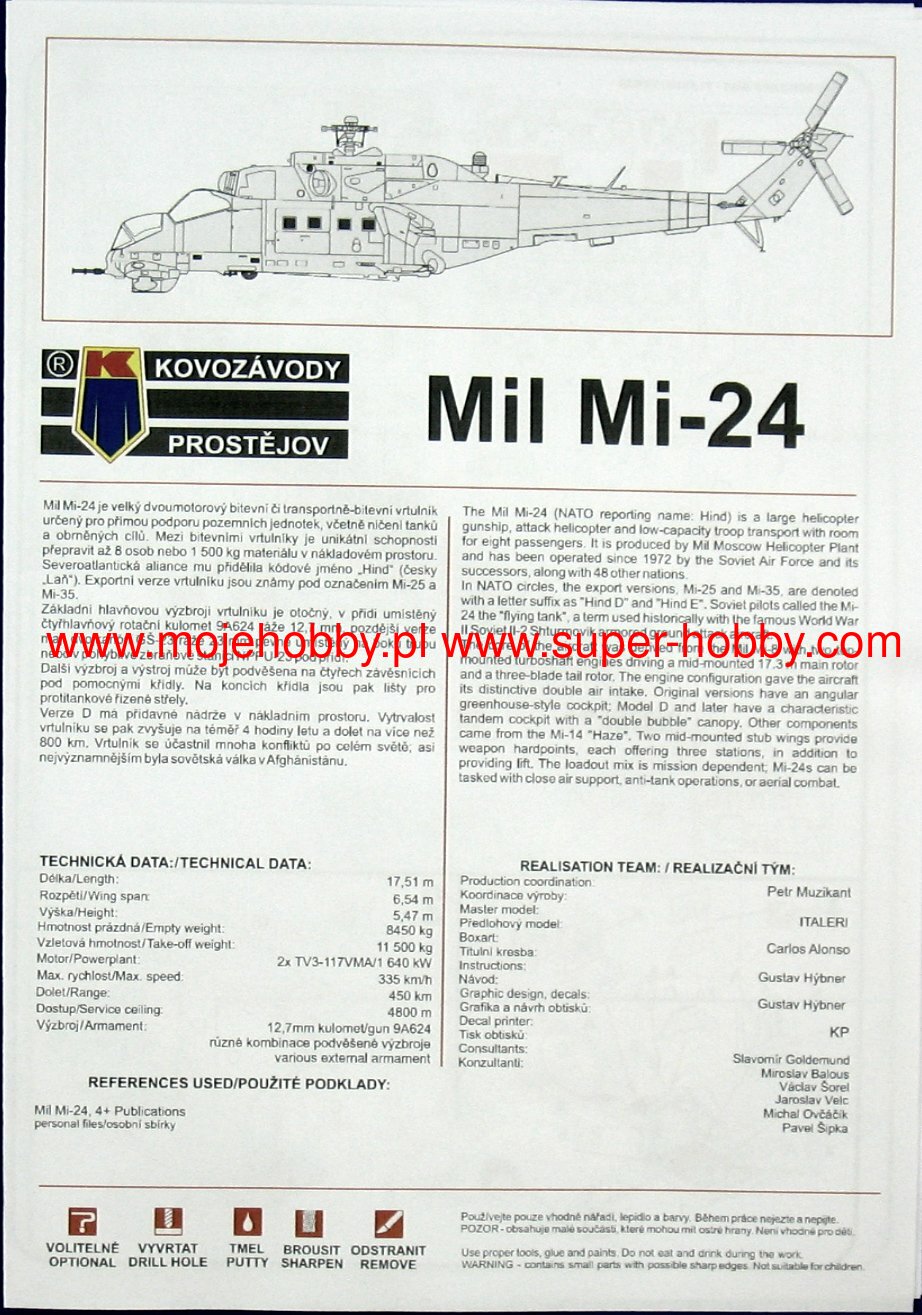 Ми-24 (код НАТО: Hind) тяжёлый боевой вертолёт советского производства с цельнометаллической полукорпусной конструкцией, с убирающимся шасси, классической компоновки с несущим и рулевым винтами на балке. . Привод обеспечивался двумя турбовальными двигателями ТВ-3-177МТ различных моделей мощностью по 2200 л.с. каждый. Первый прототип поднялся в воздух в сентябре 1969 года, а серийное производство продолжалось с 1970 по 1983 год. Основным импульсом развития Ми-24 стали новые тактические и оперативные установки Советской Армии, которая в конце 1960-х годов стала уделять большое внимание использованию ударных боевых вертолетов в своих наступательных операциях. Первоначально Ми-8 хорошо справлялся с этой ролью, но на основе его компонентов было решено создать тяжеловооружённый вертолёт, более быстрый и при этом способный перевозить до 8-10 десантников. Так родился Ми-24 - машина по-своему революционная, уникальная по своей концепции и на момент принятия на вооружение (начало 1970-х) превосходившая все западные разработки. Было создано множество модернизаций базовой версии (Ми-24). Первой по хронологии была версия Ми-24А, в которой была улучшена эргономика машины и добавлены более мощные двигатели. Позже была разработана модель Ми-24Д, имевшая другую форму кабины уже при тандемной компоновке и иное расположение рулевого винта. Также был создан экспортный вариант, получивший название Ми-35. Очень удачный Ми-24 широко экспортировался в страны Варшавского договора, а также, например, в Ливию и Эфиопию. Вертолеты Ми-24 принимали участие в многочисленных вооруженных конфликтах, в том числе: во время вьетнамской интервенции в Камбодже, но больше всего в войне в Афганистане (1979-1989 гг.), где Ми-24 стал рабочей лошадкой советских войск, в то же время, высокая эффективность. Вертолеты Ми-24 моджахеды прозвали дьявольскими колесницами.
