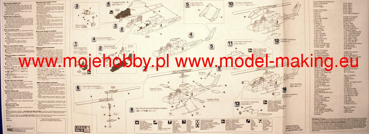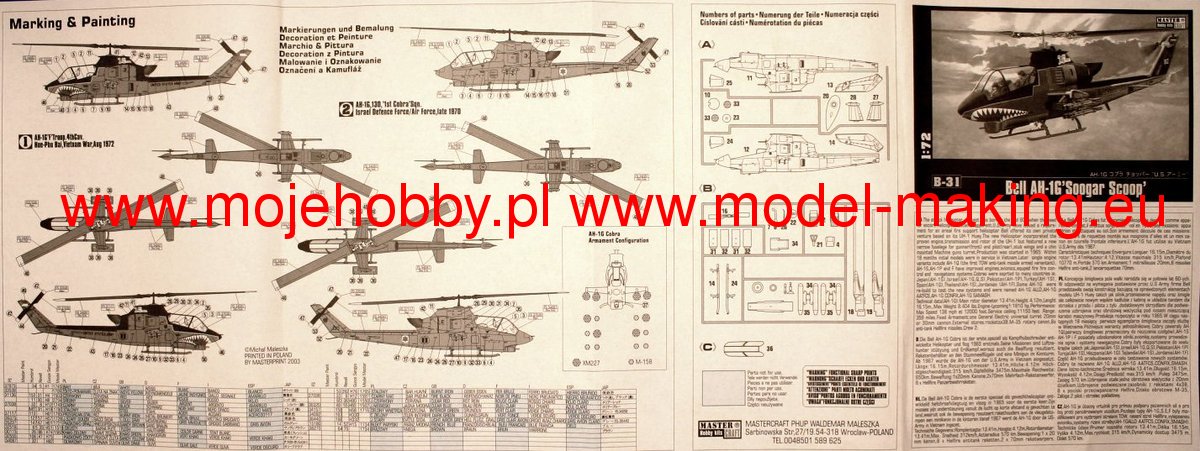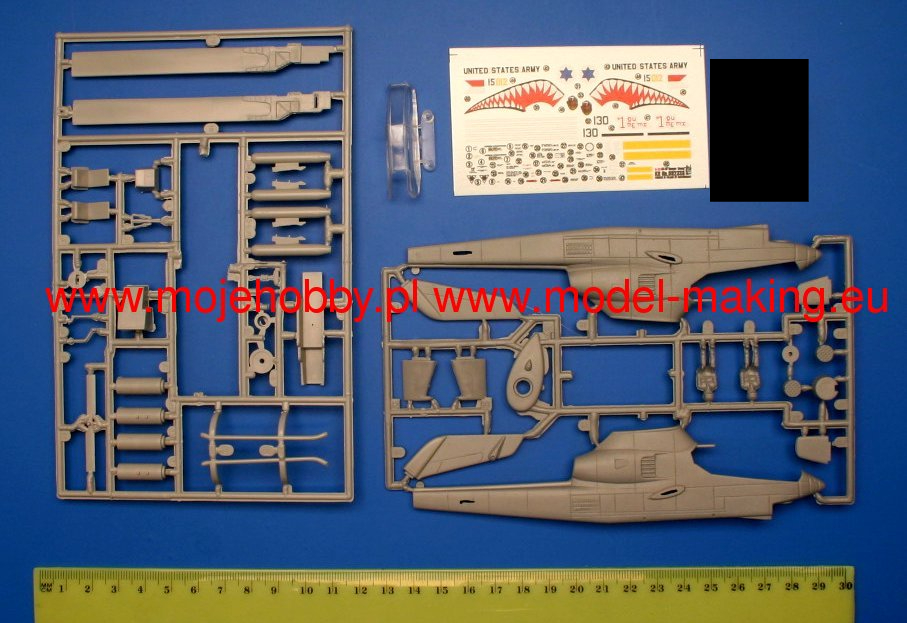 Note: Comany Mistercraft frequently changes, without any notice, the decals that come with the model, so they may differ from the photos and descriptions on our website. If you need a specific version, please let us know about that by entering the appropriate notice in the comments field when placing the order. The AH-1 Cobra helicopter (Bell 209) is an attack helicopter in the classic layout, using many components of its "big brother" UH-1 Huey. The first flight of the AH-1 prototype took place on September 7, 1965 and the helicopter entered mass production in the same year. During the Vietnam War, 1,126 machines of the G model were produced, of which 279 were lost in combat. Due to the very high reliability of the structure, small side profile and good performance, the helicopter remains in service to this day in the US Marine Corps. The AH-1 allowed the US Army to fully implement the theoretical assumption of airmobile infantry ("air cavalry") through the fire support of landing infantry units. Today, the AH-1 Cobra is primarily used against an armored celon. From 1965, several versions of this successful helicopter were created, including: AH-1G (basic version), AH-1J (two-engine version), AH-1Q (version armed with TOW missiles). Technical data: Top speed: 333 km / h; maximum range (depending on version): 507-574km, armament: fixed-1 20mm M197 three-barrel cannon, slung rockets, guided missiles, unguided missiles and cannon pods.