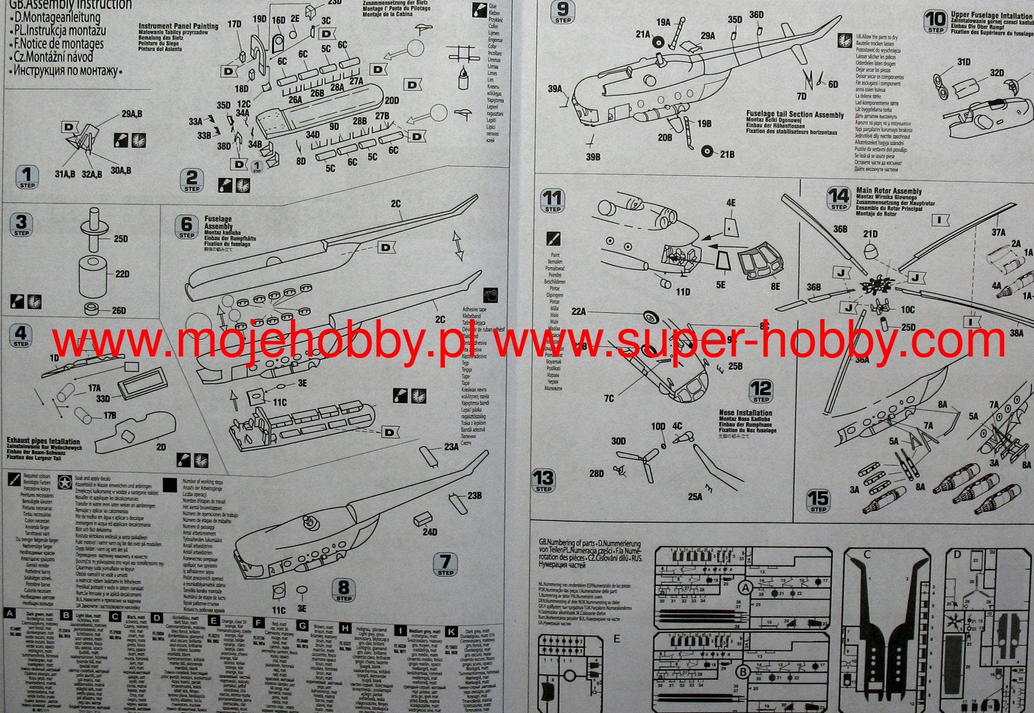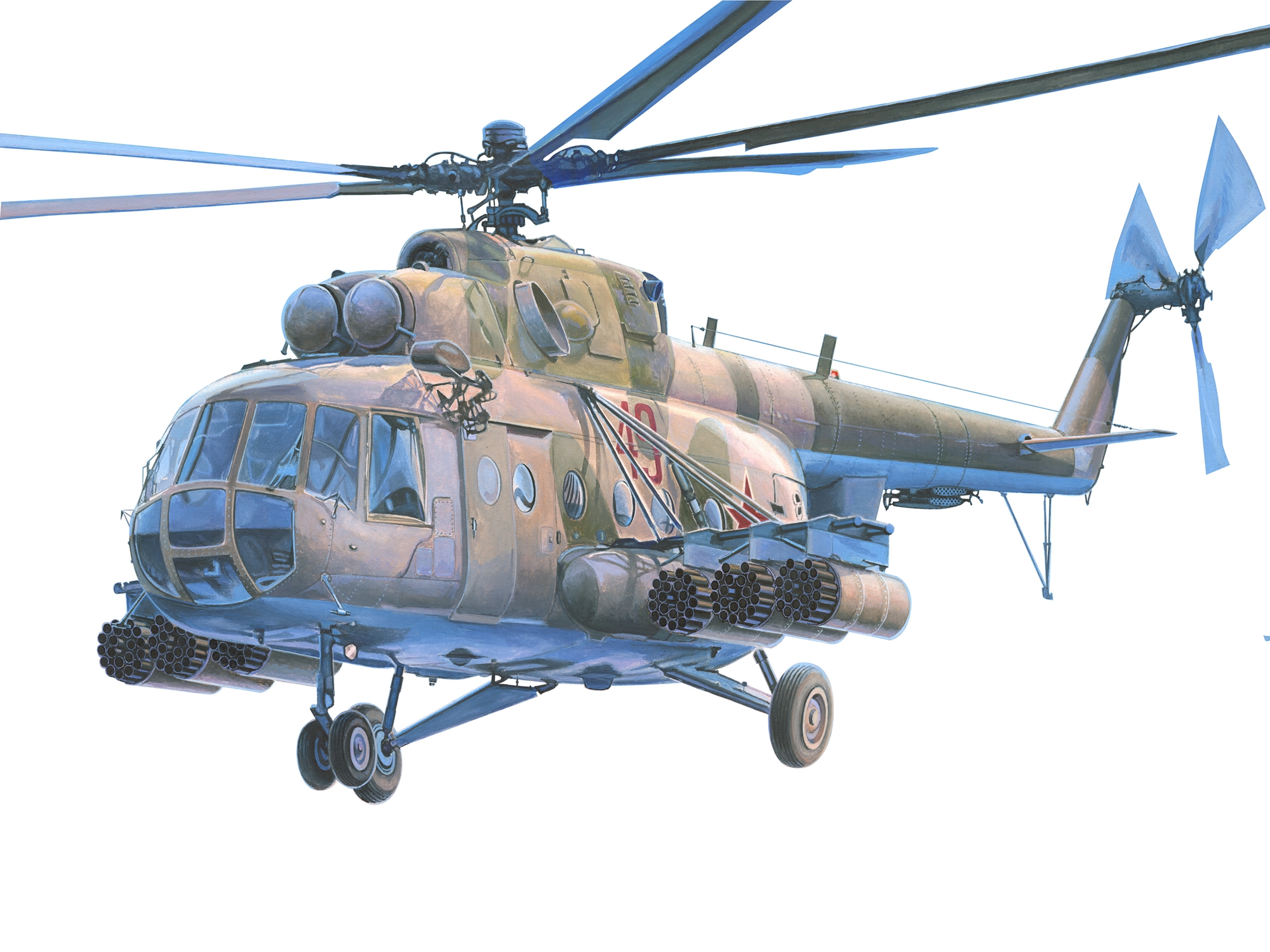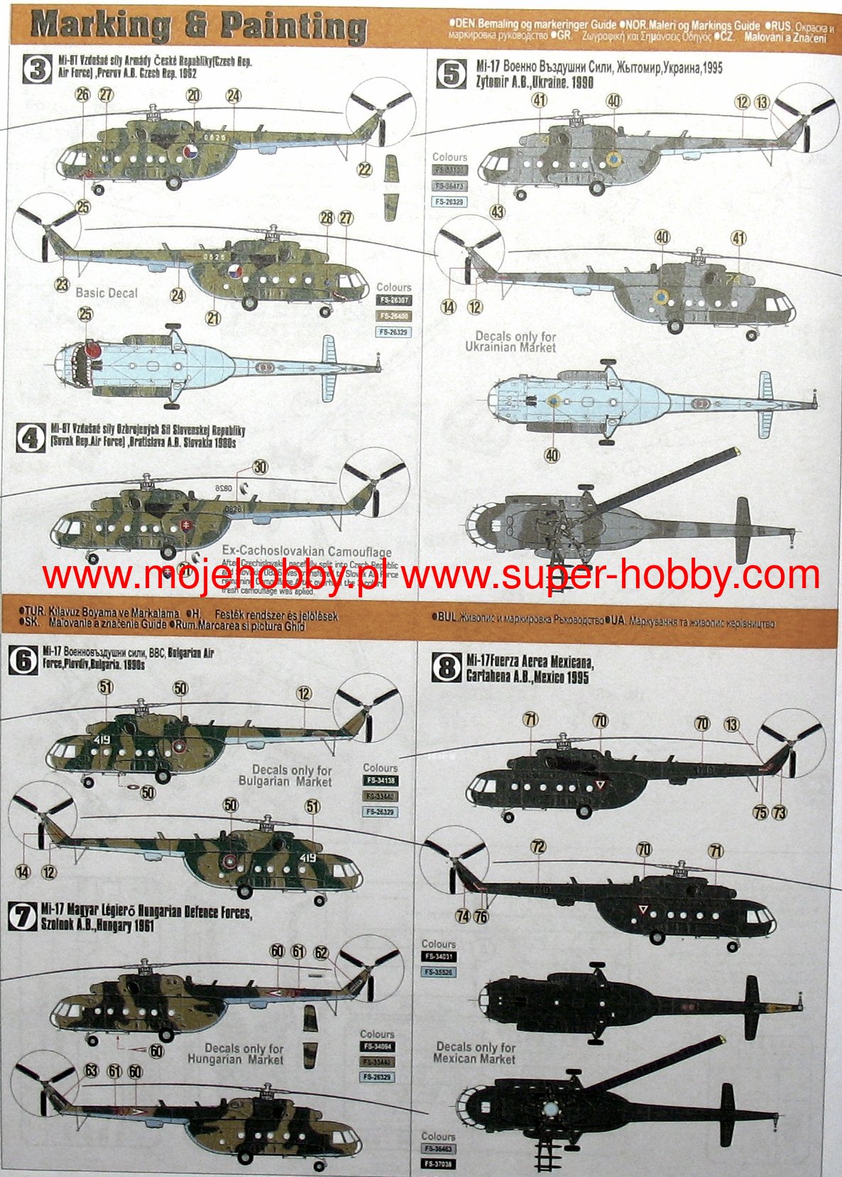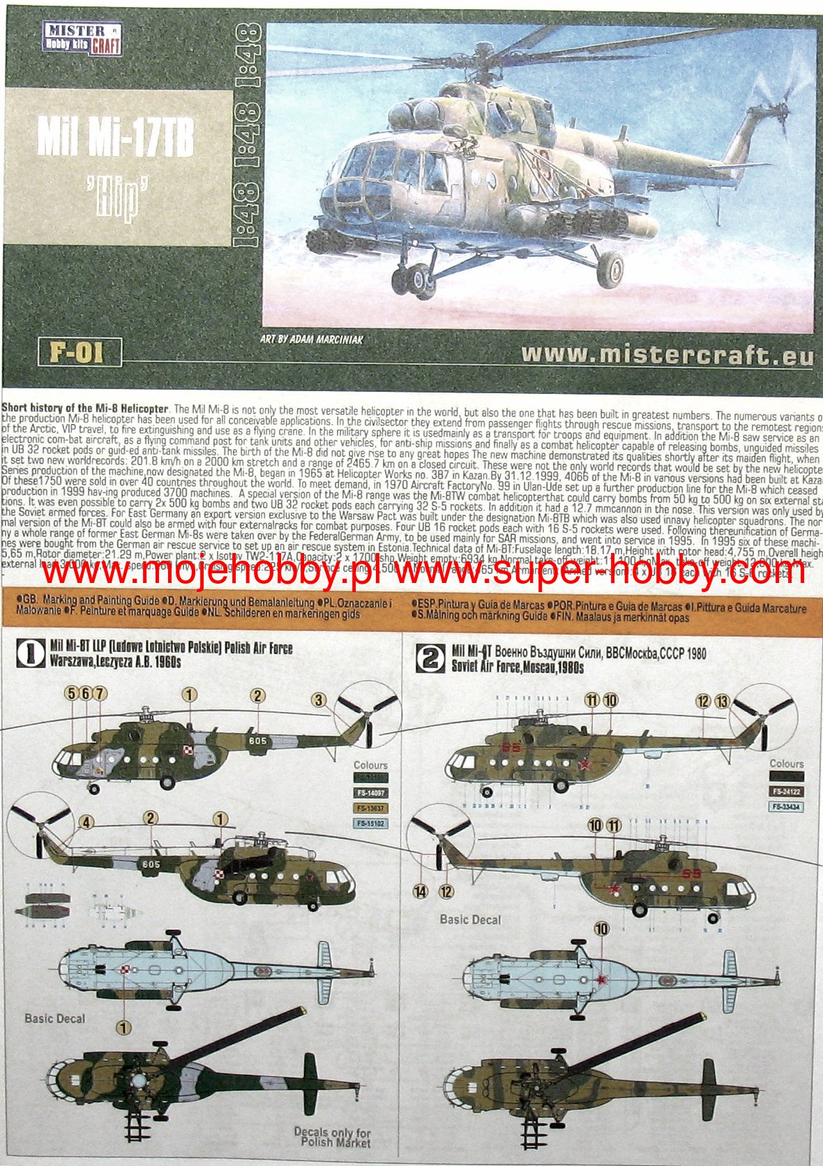 Note: Comany Mistercraft frequently changes, without any notice, the decals that come with the model, so they may differ from the photos and descriptions on our website. If you need a specific version, please let us know about that by entering the appropriate notice in the comments field when placing the order. The Mil Mi-8 (NATO code: Hip) was and still is a Soviet-made multipurpose helicopter with a full metal semi-shell structure, with a fixed undercarriage, in a classic arrangement with a main rotor and a tail rotor on the beam. The drive was provided by two Klimov-TW-2-117 turboshaft engines with a capacity of 1500 HP each. The flight of the first prototype took place in July 1961, and serial production started shortly thereafter and continues to this day. All over the world to date, more than 17,000 copies of this very successful and popular helicopter have been produced! A lot of modernization of the basic version was created. The first assault versions were the Mi-8TW and Mi-8TP helicopters, which could be armed with machine guns and unguided missiles. The Mi-24 attack helicopter later evolved from these versions. From 1981, new engines were installed in the Mi-8, thus changing the designation to Mi-17. Currently (2017) in the Russian Federation the designation of all machines of the Mi-8 / Mi-17 family has been unified to "Mi-8". The wildly successful Mi-8 was very widely exported to the countries of the Warsaw Pact, but also to many other countries of the world, such as India, Iraq and Turkey. Mi-8 helicopters took part in numerous armed conflicts, including the war in Afghanistan (1979-1989).The Mil Mi-17 (NATO code: Hip) was a Soviet, and is currently a Russian, all-metal multipurpose helicopter with a fixed, triple, retractable landing gear, in a classic arrangement with a main rotor and tail rotor on the beam. The drive - in the Mi-17 1A-2 version - is provided by two Klimow VK-2500PS-03 engines with a capacity of 2400 KM each. The flight of the first prototype took place in 1975, and serial production started two years later and continues (under the designation Mi-8MT). The machine is 18.47 meters long with a rotor diameter of 21.25 meters. The Mil Mi-17 was designed and put into production as a far-reaching development of the Mi-8 helicopter. Externally, it is very similar to it and was initially designated as the Mi-8MT, but since 1981 the designation Mi-17 has been used. The Mi-17 helicopter differs from the Mi-8 mainly by moving the propeller on the tail boom from right to left and the use of a completely new power unit with higher maximum power, which positively influenced the machine's performance. The changes also affected the main rotor, chassis and drive train. Many versions of this highly successful helicopter have appeared in the course of production, including the Mi-17 (basic version), Mi-17P (radio-electronic warfare version) and Mi-17-VA (flying hospital version). The Mi-17 machine was exported to many countries around the world, including: Algeria, Cuba and Egypt.