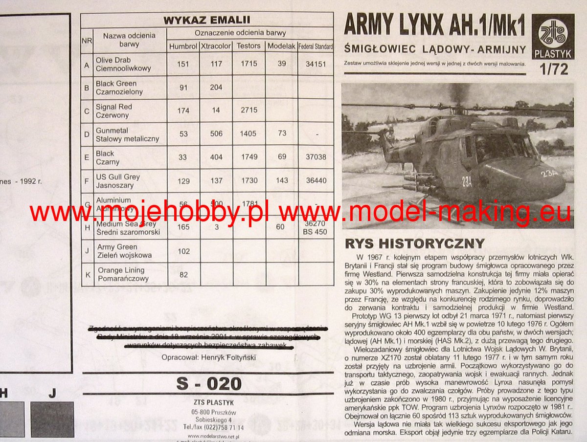 The Westland Lynx is a British-made multipurpose helicopter of full metal construction with a fixed undercarriage, in a classic layout with a main rotor and a tail rotor on the beam. The drive is provided by two Rolls-Royce 42-1 turboshaft engines with a capacity of 1015 HP each. The first prototype flew in 1971, and serial production started in 1978 and is still ongoing. By 2009, approximately 450 helicopters of this type had been manufactured. The machine was also manufactured under license in France by Aerospatiale. The Westland Lynx was created to replace the Westland Scout and Westland Wasp helicopters. When designing it, particular emphasis was placed on the high reliability of the entire machine, good performance, and efforts to maintain high susceptibility to modernization. These goals have been achieved. In the course of serial production, two main development versions of the helicopter were created: the first, designated as Lynx AH.1, was dedicated to the military aviation of the army and was used as a transport and anti-tank helicopter. There were also several versions of it, such as the Lynx AH.7 with a fuselage and rotor made to a greater extent from composites and with richer avionics. The second major version was designated as Lynx HAS.1 - it served as an anti-submarine helicopter (ZOP) and a search and rescue machine. This version has also undergone numerous modifications and has been revised several times, eg HAS.3. Westland Lynx helicopters successfully participated in many armed conflicts, including the Falklands War (1982) or in both wars with Iraq (1990-1991 and 2003). They were also exported to several countries, including Brazil, Denmark and Germany.