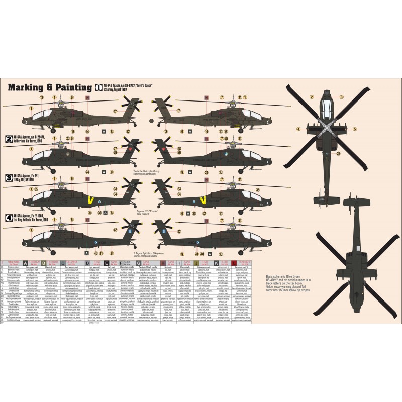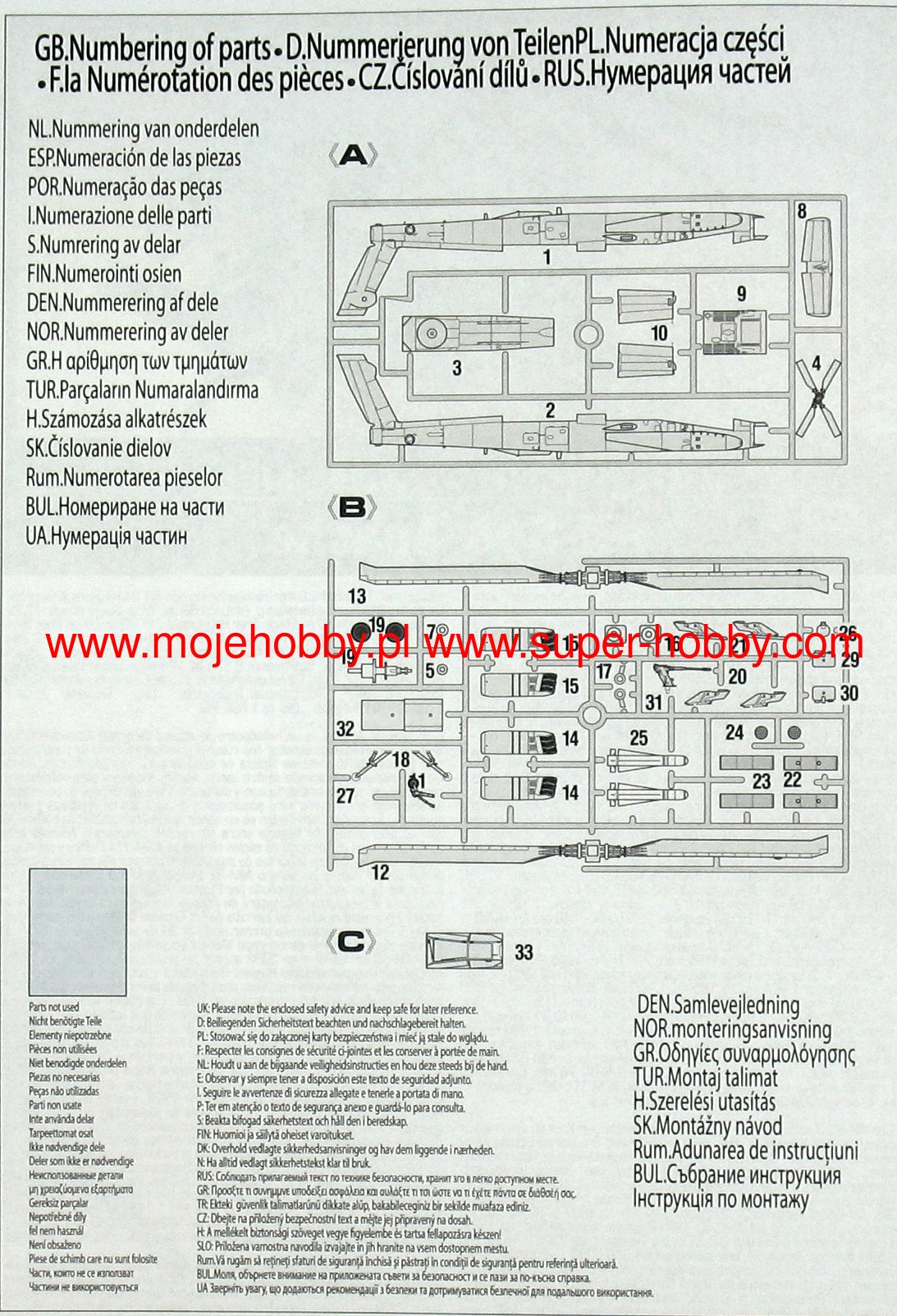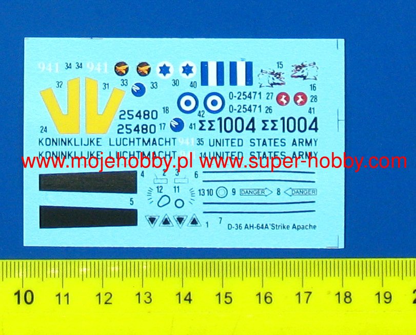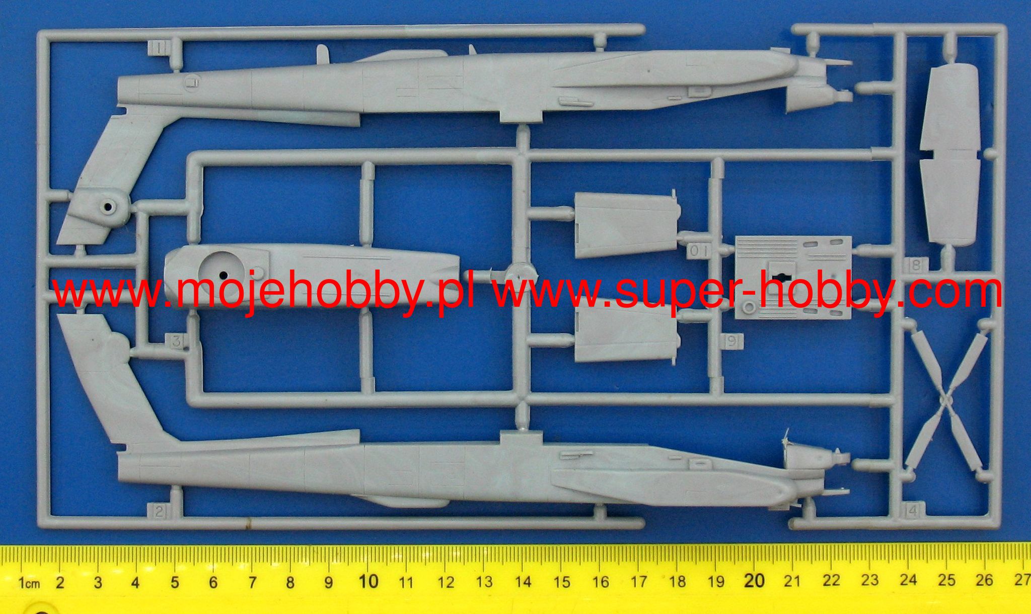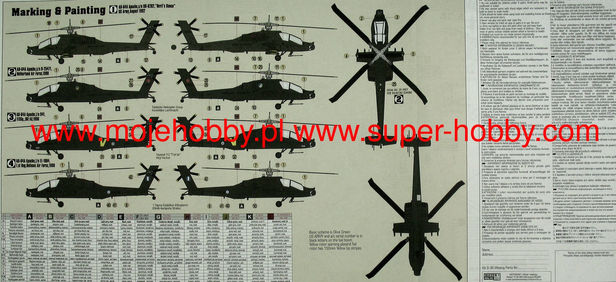 Note: Comany Mistercraft frequently changes, without any notice, the decals that come with the model, so they may differ from the photos and descriptions on our website. If you need a specific version, please let us know about that by entering the appropriate notice in the comments field when placing the order. The McDonnell-Douglas (Boeing) AH-64 helicopter was selected as the winner in the competition with Bell's YAH-63 in December 1976. The name Apache stuck to the helicopter in 1981. This highly efficient machine has four-blade rotors driven by two General Electric T700-701 turbine engines with a capacity of 1696HP. The vestigial wings are fitted with conventional trailing edge flaps, and a plate tail improves longitudinal steering. The two-man crew takes seats one after the other in the armored cabin. The pilot's seat is in the rear, and the weapon operator / gunner is in the front. The key to the universal use of the helicopter are the TADS systems on the gunner's stand and the PNVS systems used by the pilot. The TADS is a target-tracking laser marker and rangefinder set and a forward-facing infrared sensor that is duplicated by the normal optics. The PNVS system is a developed FLIR system that allows you to pilot a helicopter just above the ground in order to prevent or delay detection by the enemy's anti-aircraft defense. Apache helicopters took part in the operation in Panama in 1989, during the Desert Storm in 1991, or the last conflict in Iraq (2003). At the end of 1990, the construction of a new version of the helicopter began, equipped with a Martin / Westinghouse Longbow millimeter radar installed above the head to control the weapons. It is used to control the Rockwell AGM-114 Hellfire anti-tank missiles. Technical data: Top speed: 300 km / h; climb speed 12.7 m / s, maximum range (without external tanks): 689 km, armament: 30mm Hughes M230A1 Chain Gun fixed-1 cannon, and outboard armaments - most often Hellfire missiles.