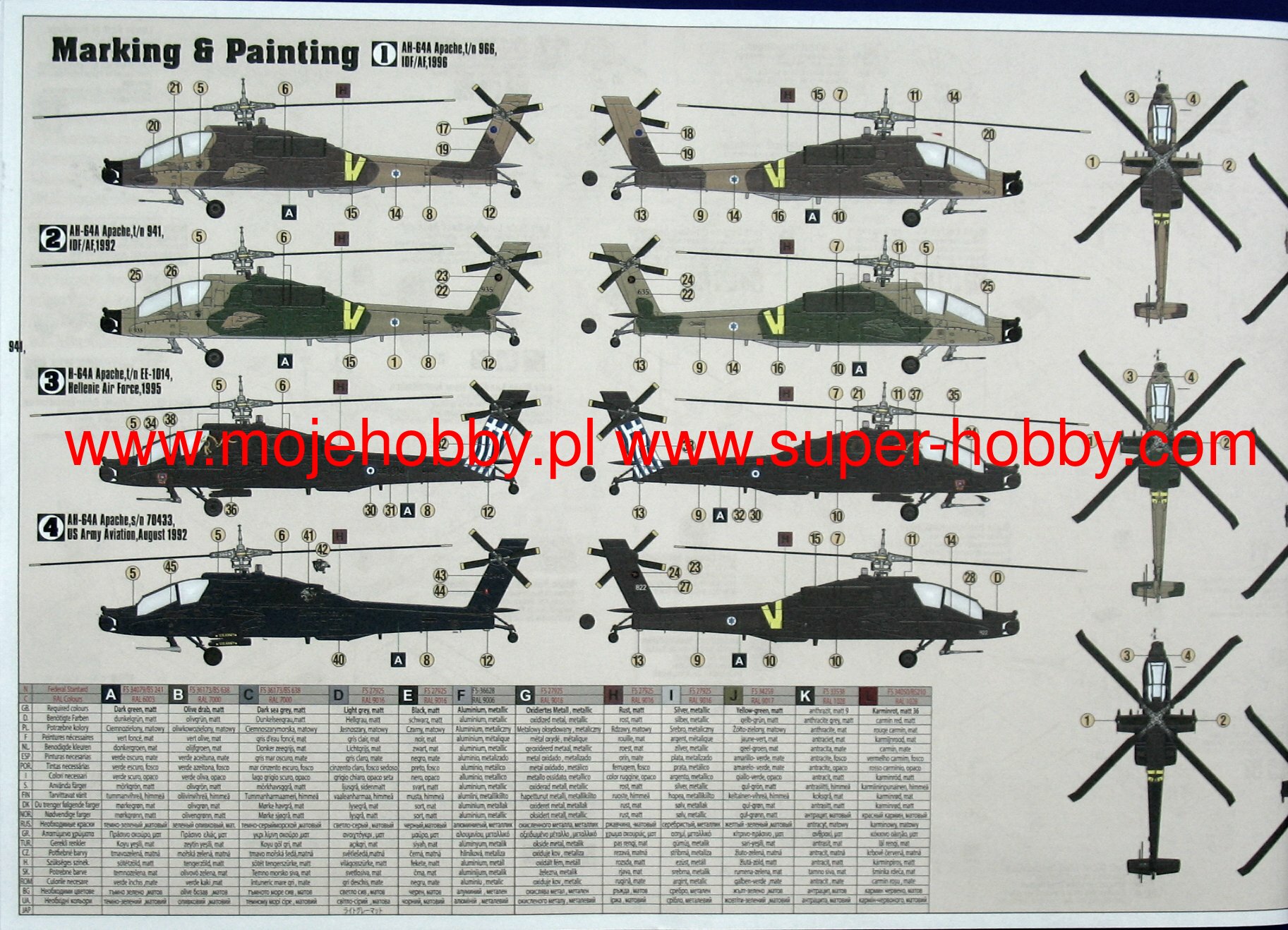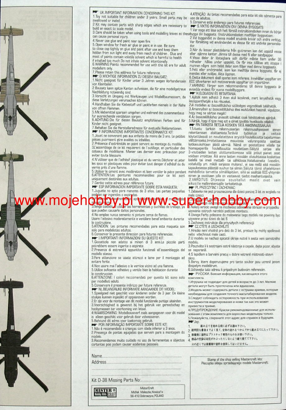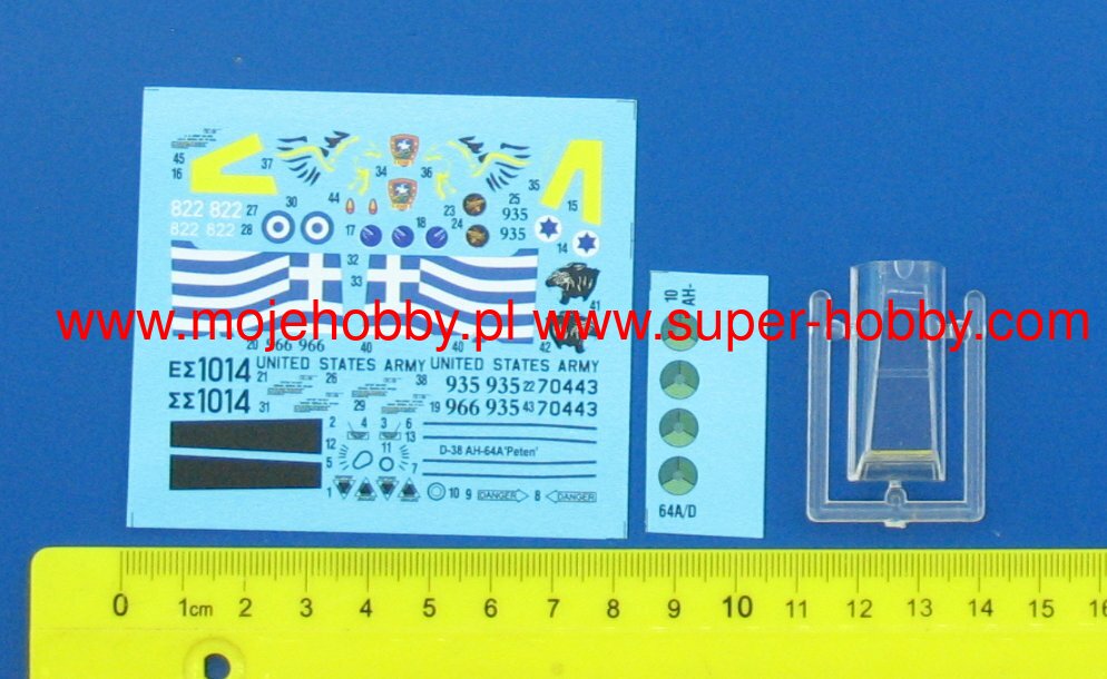 Note: Comany Mistercraft frequently changes, without any notice, the decals that come with the model, so they may differ from the photos and descriptions on our website. If you need a specific version, please let us know about that by entering the appropriate notice in the comments field when placing the order. The McDonnell-Douglas (Boeing) AH-64 helicopter was selected as the winner in the competition with Bell's YAH-63 in December 1976. The name Apache stuck to the helicopter in 1981. This highly efficient machine has four-blade rotors driven by two General Electric T700-701 turbine engines with a capacity of 1696HP. The vestigial wings are fitted with conventional trailing edge flaps, and a plate tail improves longitudinal steering. The two-man crew takes seats one after the other in the armored cabin. The pilot's seat is in the rear, and the weapon operator / gunner is in the front. The key to the universal use of the helicopter are the TADS systems on the gunner's stand and the PNVS systems used by the pilot. The TADS is a target-tracking laser marker and rangefinder set and a forward-facing infrared sensor that is duplicated by the normal optics. The PNVS system is a developed FLIR system that allows you to pilot a helicopter just above the ground in order to prevent or delay detection by the enemy's anti-aircraft defense. Apache helicopters took part in the operation in Panama in 1989, during the Desert Storm in 1991, or the last conflict in Iraq (2003). At the end of 1990, the construction of a new version of the helicopter began, equipped with a Martin / Westinghouse Longbow millimeter radar installed above the head to control the weapons. It is used to control the Rockwell AGM-114 Hellfire anti-tank missiles. Technical data: Top speed: 300 km / h; climb speed 12.7 m / s, maximum range (without external tanks): 689 km, armament: 30mm Hughes M230A1 Chain Gun fixed-1 cannon, and outboard armaments - most often Hellfire missiles.