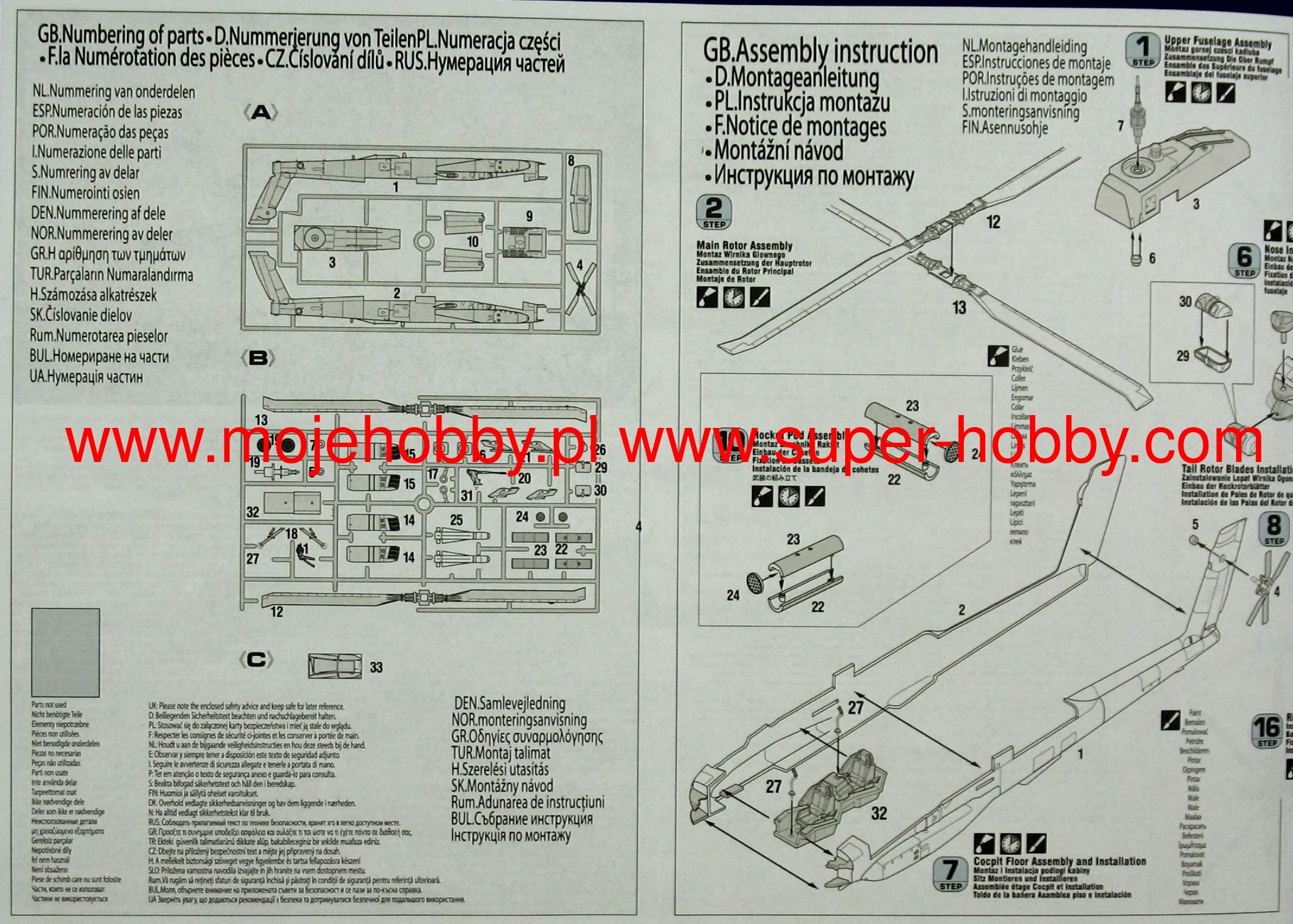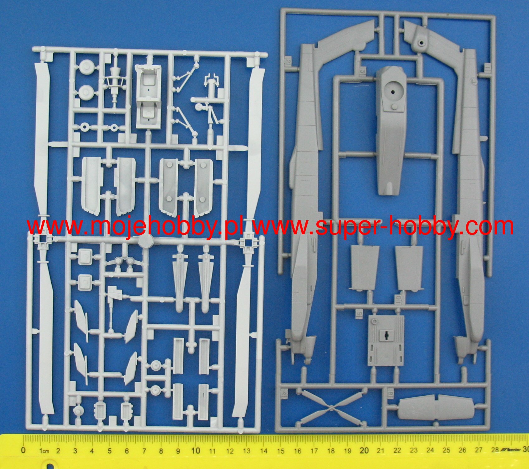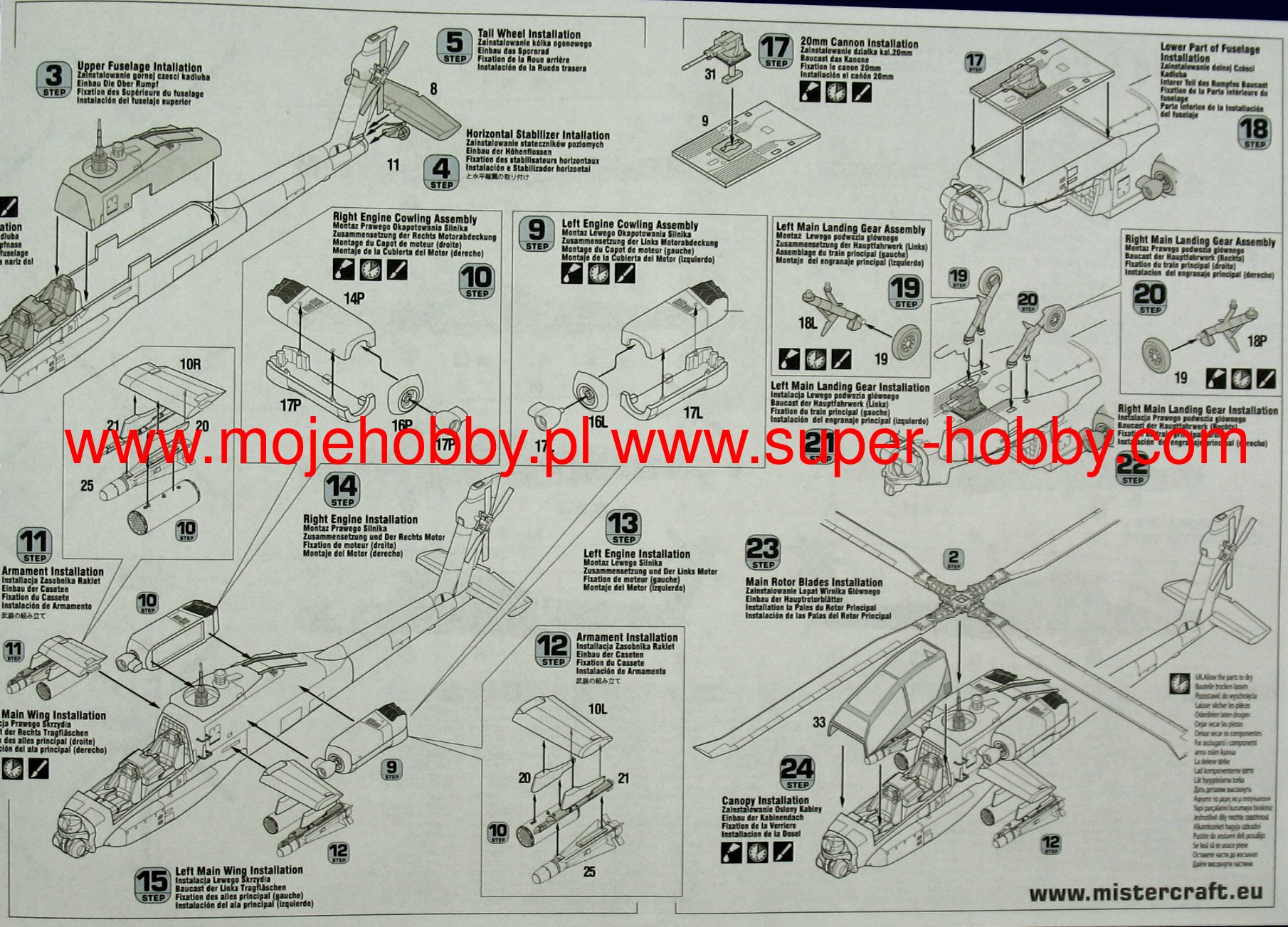 Note: Comany Mistercraft frequently changes, without any notice, the decals that come with the model, so they may differ from the photos and descriptions on our website. If you need a specific version, please let us know about that by entering the appropriate notice in the comments field when placing the order. The McDonnell-Douglas (Boeing) AH-64 helicopter was selected as the winner in the competition with Bell's YAH-63 in December 1976. The name Apache stuck to the helicopter in 1981. This highly efficient machine has four-blade rotors driven by two General Electric T700-701 turbine engines with a capacity of 1696HP. The vestigial wings are fitted with conventional trailing edge flaps, and a plate tail improves longitudinal steering. The two-man crew takes seats one after the other in the armored cabin. The pilot's seat is in the rear, and the weapon operator / gunner is in the front. The key to the universal use of the helicopter are the TADS systems on the gunner's stand and the PNVS systems used by the pilot. The TADS is a target-tracking laser marker and rangefinder set and a forward-facing infrared sensor that is duplicated by the normal optics. The PNVS system is a developed FLIR system that allows you to pilot a helicopter just above the ground in order to prevent or delay detection by the enemy's anti-aircraft defense. Apache helicopters took part in the operation in Panama in 1989, during the Desert Storm in 1991, or the last conflict in Iraq (2003). At the end of 1990, the construction of a new version of the helicopter began, equipped with a Martin / Westinghouse Longbow millimeter radar installed above the head to control the weapons. It is used to control the Rockwell AGM-114 Hellfire anti-tank missiles. Technical data: Top speed: 300 km / h; climb speed 12.7 m / s, maximum range (without external tanks): 689 km, armament: 30mm Hughes M230A1 Chain Gun fixed-1 cannon, and outboard armaments - most often Hellfire missiles.