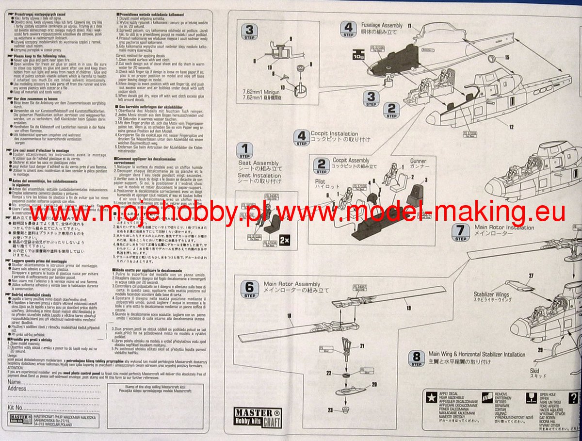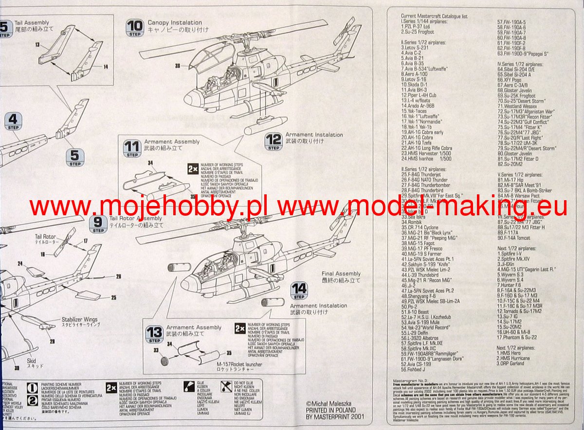 Note: Comany Mistercraft frequently changes, without any notice, the decals that come with the model, so they may differ from the photos and descriptions on our website. If you need a specific version, please let us know about that by entering the appropriate notice in the comments field when placing the order. The AH-1 Cobra helicopter (Bell 209) is an attack helicopter in the classic layout, using many components of its "big brother" UH-1 Huey. The first flight of the AH-1 prototype took place on September 7, 1965 and the helicopter entered mass production in the same year. During the Vietnam War, 1,126 machines of the G model were produced, of which 279 were lost in combat. Due to the very high reliability of the structure, small side profile and good performance, the helicopter remains in service to this day in the US Marine Corps. The AH-1 allowed the US Army to fully implement the theoretical assumption of airmobile infantry ("air cavalry") through the fire support of landing infantry units. Today, the AH-1 Cobra is primarily used against an armored celon. From 1965, several versions of this successful helicopter were created, including: AH-1G (basic version), AH-1J (two-engine version), AH-1Q (version armed with TOW missiles). Technical data: Top speed: 333 km / h; maximum range (depending on version): 507-574km, armament: fixed-1 20mm M197 three-barrel cannon, slung rockets, guided missiles, unguided missiles and cannon pods.