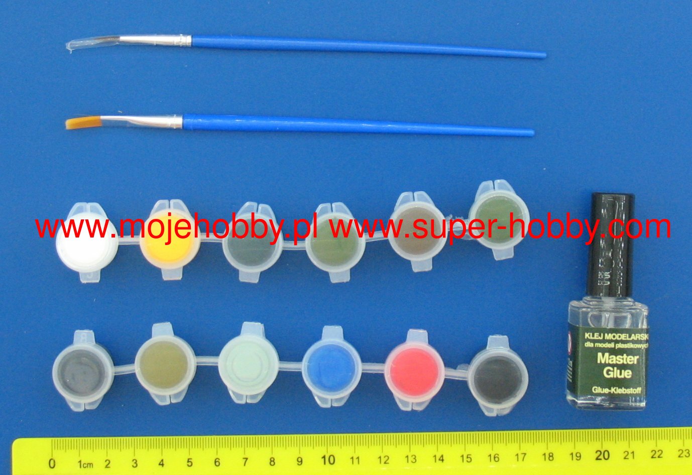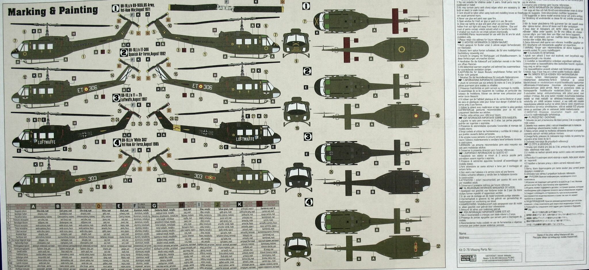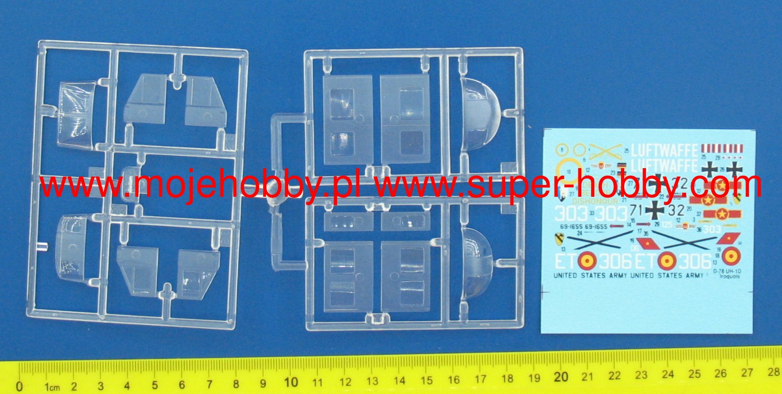 Note: Comany Mistercraft frequently changes, without any notice, the decals that come with the model, so they may differ from the photos and descriptions on our website. If you need a specific version, please let us know about that by entering the appropriate notice in the comments field when placing the order. Bell UH-1 Iroquois (commonly known as Huey) is a multirole helicopter of American production from the Cold War and modern times. The flight of the prototype took place in 1956, and the machine entered service in 1959. The helicopter - in the UH-1D version - has a total length of 17.4 m, and the diameter of its main rotor is 14.6 meters. The drive is provided by a single 1100 HP Lycoming T-53-L-11 engine. Its maximum speed in horizontal flight reaches 220 km / h. The helicopter has a classic layout with a single main rotor and a propeller on the tail boom. Work on the Bell UH-1 machine, commonly known as the Huey, started in the early 1950s, when the US Army reported a need for a new transport, medical evacuation (MEDAVAC) and multi-role helicopter. The emphasis is on the simplest and classic design as well as high reliability. Bell UH-1 helicopters performed very well during the Vietnam War (1964 / 1965-1975), where they underwent their baptism of fire. Due to their indiscriminate use in this conflict, they have almost become a symbol of this war. In the course of production, many development versions of this helicopter were created, among which the following can be indicated: UH-1 C (version adapted to take small arms and unguided rockets and with a more powerful engine compared to versions A and B), UH-1 D ( basic, transport, production version) or UH-1H (an improved D version with a more powerful drive unit). It is worth noting that the UH-1Y Venom version was also created, but due to the number of upgrades and improvements, it should rather be viewed as a separate helicopter model. The Bell UH-1 helicopter has gained enormous popularity and in various versions has been or is still operated by countries such as: Argentina, Brazil, Bolivia, Chile, Georgia, Japan, Germany and Italy.