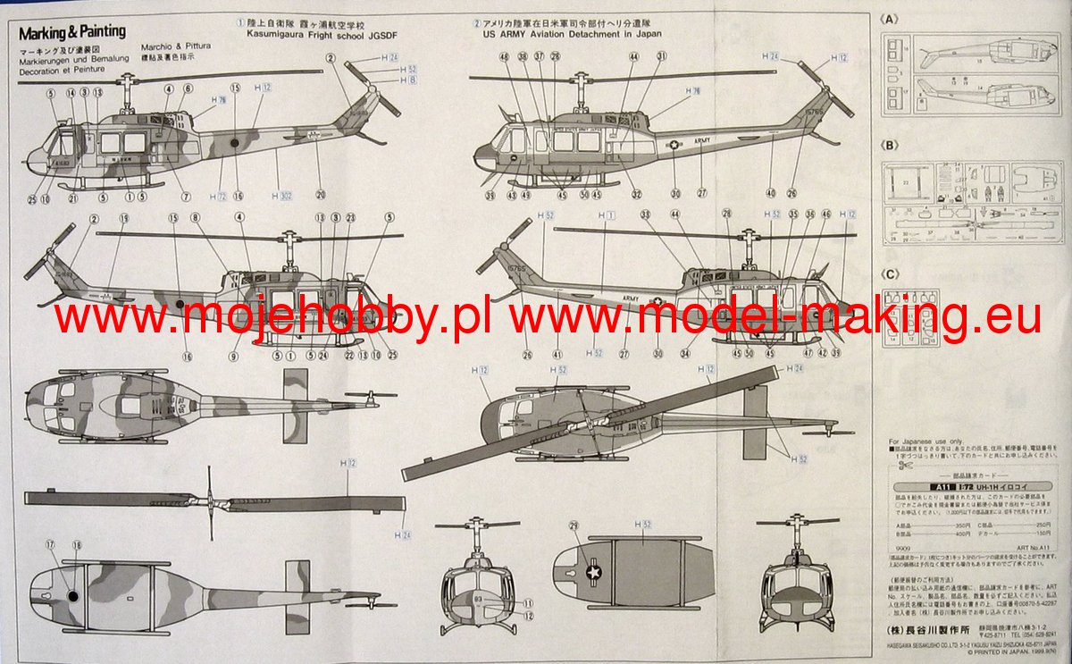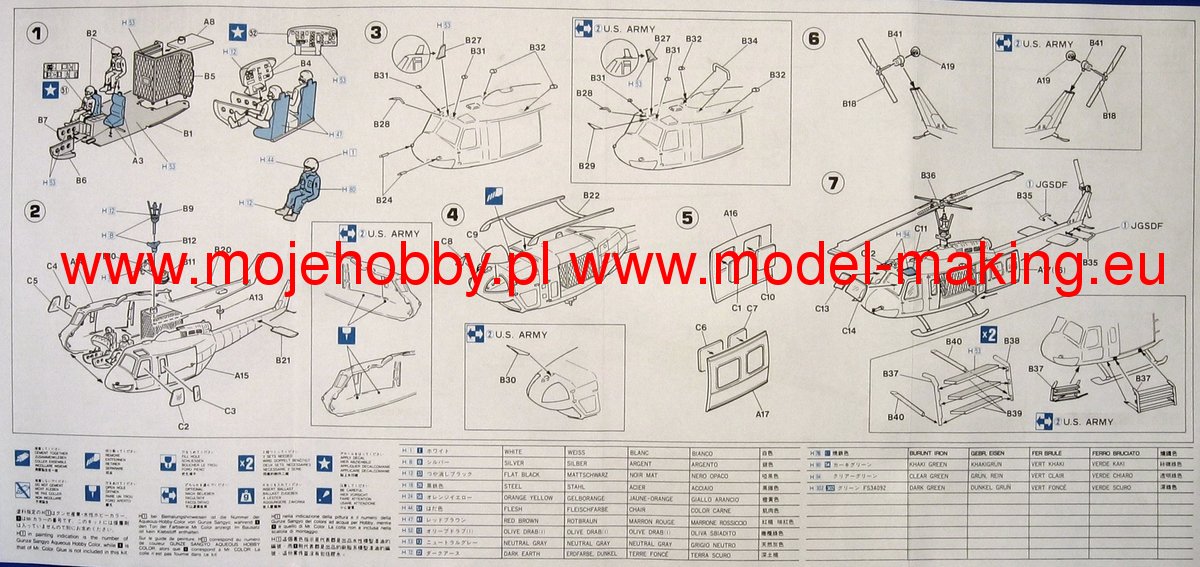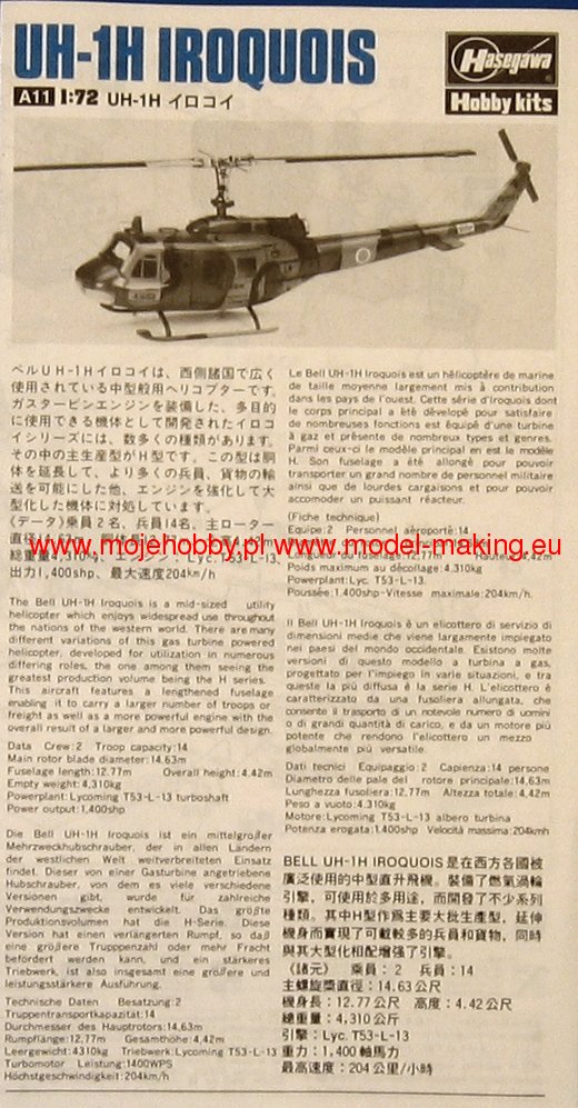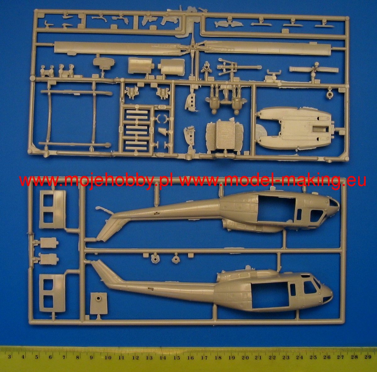 Bell UH-1 Iroquois (commonly known as Huey) is a multirole helicopter of American production from the Cold War and modern times. The flight of the prototype took place in 1956, and the machine entered service in 1959. The helicopter - in the UH-1D version - has a total length of 17.4 m, and the diameter of its main rotor is 14.6 meters. The drive is provided by a single 1100 HP Lycoming T-53-L-11 engine. Its maximum speed in horizontal flight reaches 220 km / h. The helicopter has a classic layout with a single main rotor and a propeller on the tail boom. Work on the Bell UH-1 machine, commonly known as the Huey, started in the early 1950s, when the US Army reported a need for a new transport, medical evacuation (MEDAVAC) and multi-role helicopter. The emphasis is on the simplest and classic design as well as high reliability. Bell UH-1 helicopters performed very well during the Vietnam War (1964 / 1965-1975), where they underwent their baptism of fire. Due to their indiscriminate use in this conflict, they have almost become a symbol of this war. In the course of production, many development versions of this helicopter were created, among which the following can be indicated: UH-1 C (version adapted to take small arms and unguided rockets and with a more powerful engine compared to versions A and B), UH-1 D ( basic, transport, production version) or UH-1H (an improved D version with a more powerful drive unit). It is worth noting that the UH-1Y Venom version was also created, but due to the number of upgrades and improvements, it should rather be viewed as a separate helicopter model. The Bell UH-1 helicopter has gained enormous popularity and in various versions has been or is still operated by countries such as: Argentina, Brazil, Bolivia, Chile, Georgia, Japan, Germany and Italy.