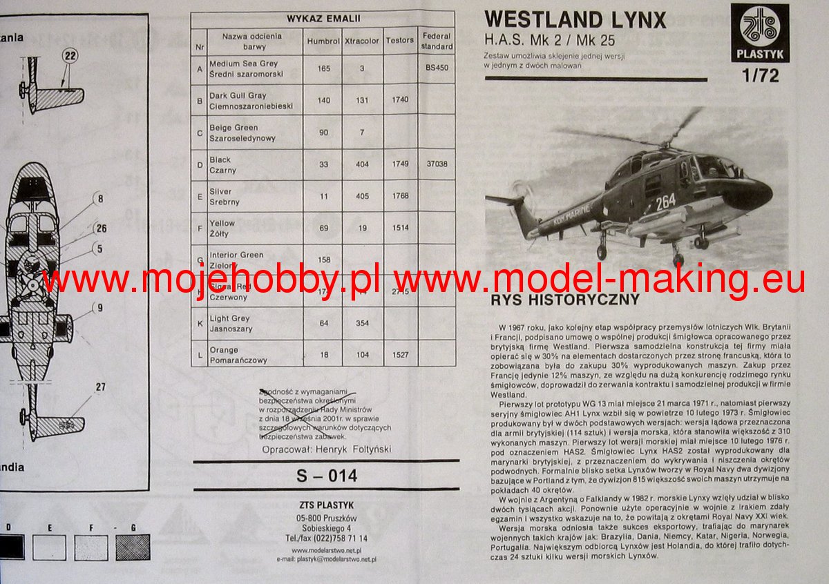 The Westland Lynx is a British-made multipurpose helicopter of full metal construction with a fixed undercarriage, in a classic layout with a main rotor and a tail rotor on the beam. The drive is provided by two Rolls-Royce 42-1 turboshaft engines with a capacity of 1015 HP each. The first prototype flew in 1971, and serial production started in 1978 and is still ongoing. By 2009, approximately 450 helicopters of this type had been manufactured. The machine was also manufactured under license in France by Aerospatiale. The Westland Lynx was created to replace the Westland Scout and Westland Wasp helicopters. When designing it, particular emphasis was placed on the high reliability of the entire machine, good performance, and efforts to maintain high susceptibility to modernization. These goals have been achieved. In the course of serial production, two main development versions of the helicopter were created: the first, designated as Lynx AH.1, was dedicated to the military aviation of the army and was used as a transport and anti-tank helicopter. There were also several versions of it, such as the Lynx AH.7 with a fuselage and rotor made to a greater extent from composites and with richer avionics. The second major version was designated as Lynx HAS.1 - it served as an anti-submarine helicopter (ZOP) and a search and rescue machine. This version has also undergone numerous modifications and has been revised several times, eg HAS.3. Westland Lynx helicopters successfully participated in many armed conflicts, including the Falklands War (1982) or in both wars with Iraq (1990-1991 and 2003). They were also exported to several countries, including Brazil, Denmark and Germany.