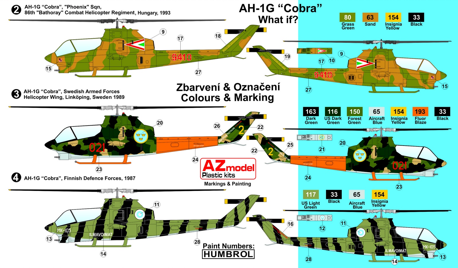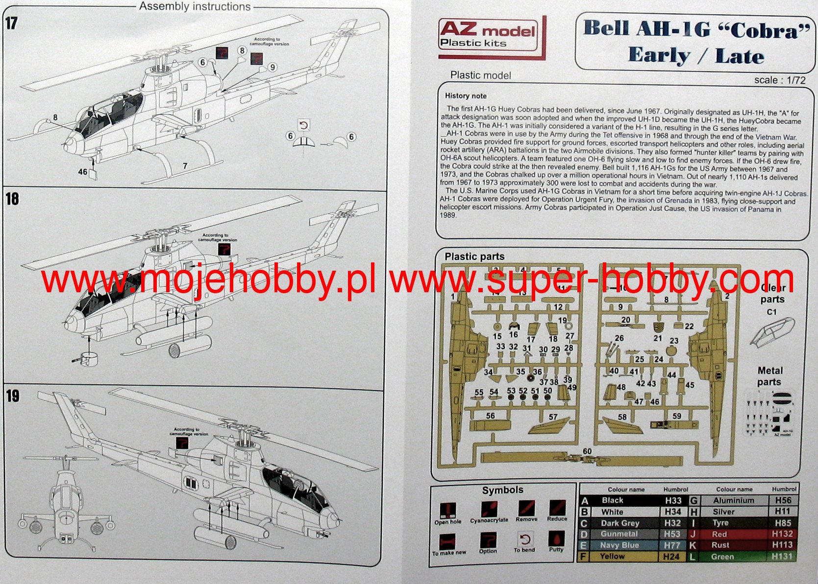 The AH-1 Cobra helicopter (Bell 209) is an attack helicopter in the classic layout, using many components of its "big brother" UH-1 Huey. The first flight of the AH-1 prototype took place on September 7, 1965 and the helicopter entered mass production in the same year. During the Vietnam War, 1,126 machines of the G model were produced, of which 279 were lost in combat. Due to the very high reliability of the structure, small side profile and good performance, the helicopter remains in service to this day in the US Marine Corps. The AH-1 allowed the US Army to fully implement the theoretical assumption of airmobile infantry ("air cavalry") through the fire support of landing infantry units. Today, the AH-1 Cobra is primarily used against an armored celon. From 1965, several versions of this successful helicopter were created, including: AH-1G (basic version), AH-1J (two-engine version), AH-1Q (version armed with TOW missiles). Technical data: Top speed: 333 km / h; maximum range (depending on version): 507-574km, armament: fixed-1 20mm M197 three-barrel cannon, slung rockets, guided missiles, unguided missiles and cannon pods.