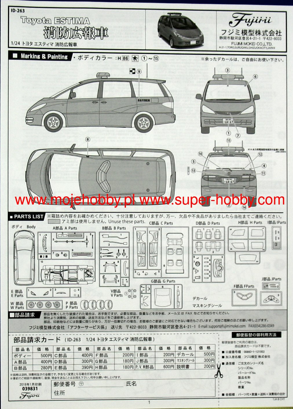 Сборная модель из пластика от японской фирмы Fujimi. Модель автомобиля Toyota Estima Fire Brigade Car в масштабе 1/24. Клей и краски в комплект не входят.