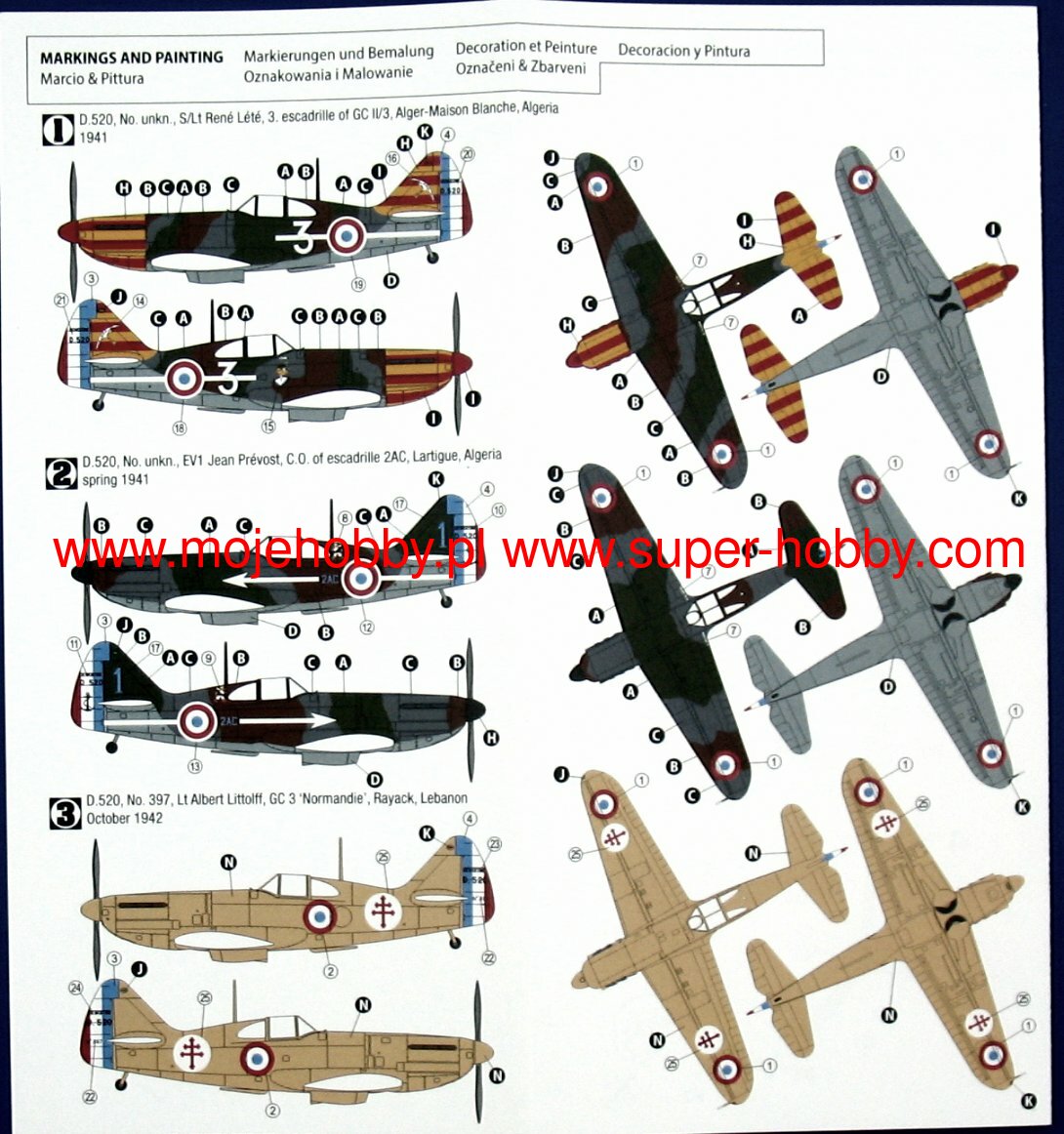The Dewoitine D520 is a French fighter, full-metal, half-shell low wing structure from the beginning of WWII manufactured by SNCA. The first flight of the prototype took place in 1938, and from the beginning of 1940, the D520 began to enter the linear units under the designation D.520C1. Initially, the French air force ordered in 1939 only 200 pieces, but its size was increased, until in April 1940 it was already for the delivery of 2,320 machines (military aviation and navy). The serial machine was powered by a Hispano-Suiza 12Y-45 engine with a capacity of 930KM. Despite the implementation of very modern for those times production methods, until May 1940, only 32 aircraft were delivered to line units, although several dozen machines were delivered to them during the course of the fighting. This was because one D.520 required 7,000 man-hours to complete, compared to 4,500 for the Me109E. The first vessel to receive the D.520 was the Groupe de Chasse I / 3. During the 1940 campaign, the plane turned out to be a bit slower than the Me109E, but definitely more maneuverable, and with at least a comparable rate of climb. He was, without a doubt, as formidable a fighter as his Luftwaffe opponent. Units armed with the D520 shot down a total of 114 enemy masses in May and June 1940. The quality of the D520 is evidenced by the fact that it served in the Vichy State aviation until 1942, as well as was used by the Luftwaffe and produced for the needs of the allies of the Third Reich - mainly Bulgaria and Romania. After 1945, the surviving D520 served as training planes in the French Air Force until 1953. Technical data: Maximum speed: 560 km / h, rate of climb: 14.3 m / s, maximum ceiling 10000 m, maximum range: 1250 km, armament: fixed - 1 20mm Hispano-Suiza HS.404 cannon and 4 machine guns MAC 1934 cal. 7.5 mm.