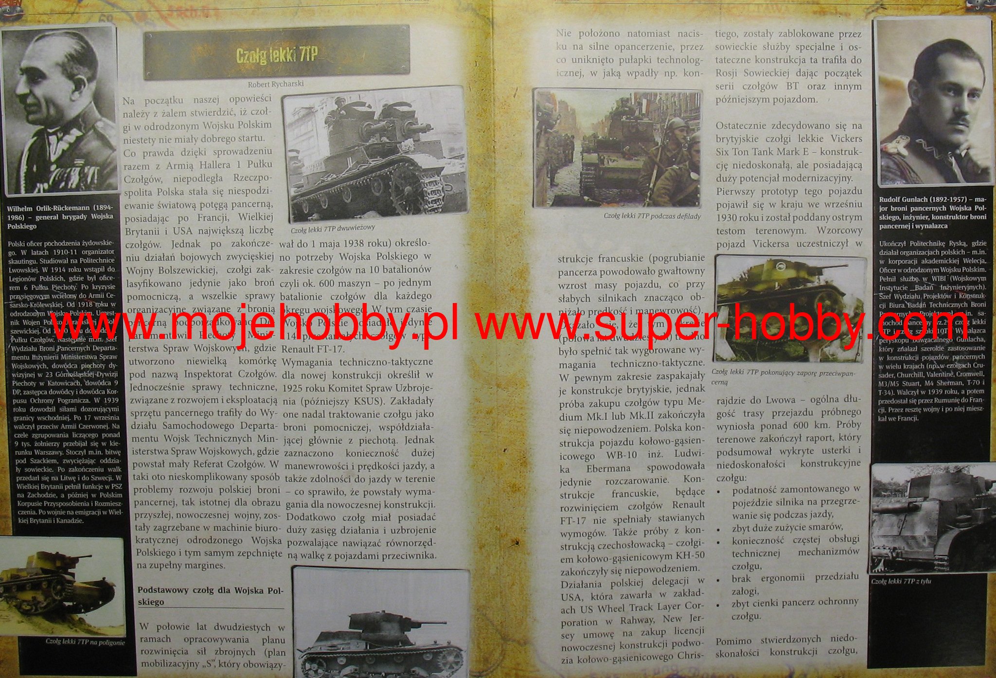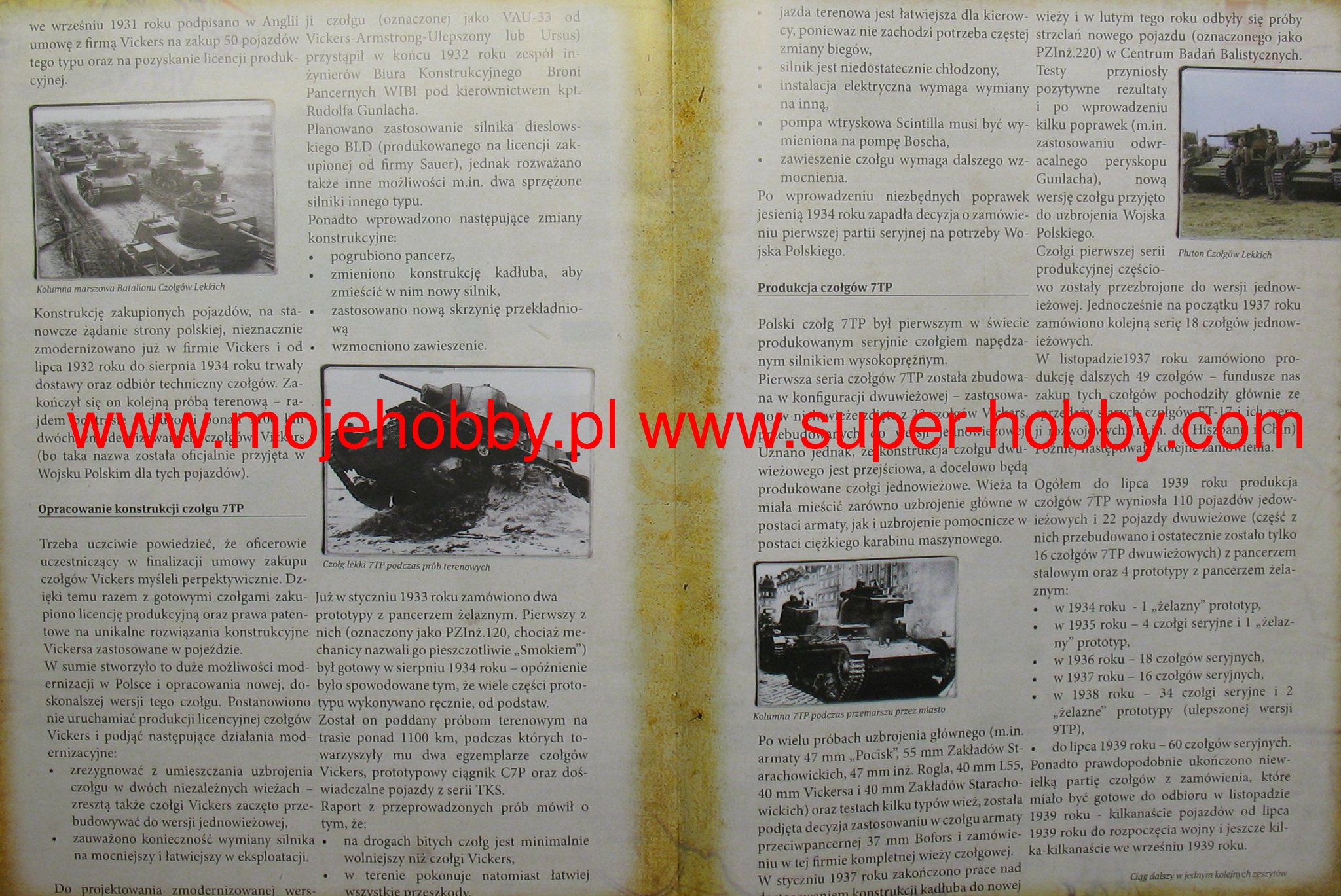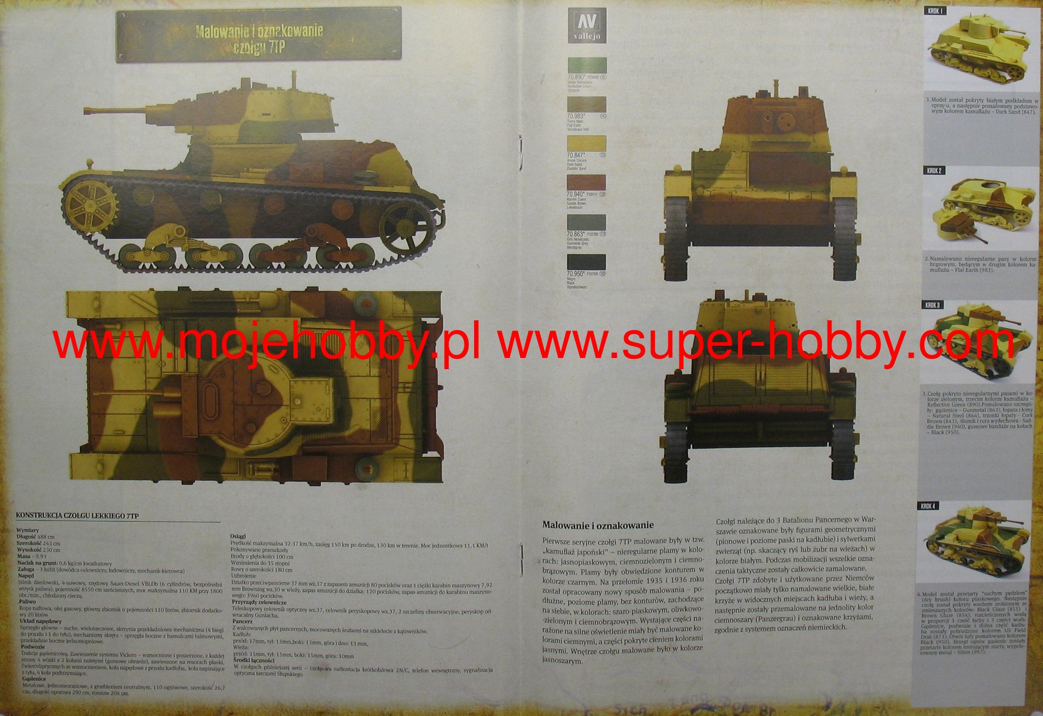 Polish light tank from the beginning of World War II. The 7TP tank, along with the tankettes (e.g. TKS), was the basic element of the Polish armored forces in 1939. 7 TP was designed at Państwowe Zakłady Inżynierii in Ursus, where it was also produced since 1935. The tank is a development of the British Vickers E, the license of which was acquired by Poland in the early 1930s. The first 24 examples of the 7TP were twin-turret vehicles, the next serial ones (built from 1937) already had one turret, and the main armament was the anti-tank gun. 37mm by Bofors. The 7TP tank was a technically advanced design for its time. It was one of the first in the world to have a diesel engine, a reversible periscope, and in some copies also radio stations (RKBc 2N / C) with a range of up to 25 km. During the September campaign, around 130 tanks of this type of all variants were used. The 7TP proved itself on the battlefields of September 1939 as an opponent towering over the German Pz.Kpfw I and II, and at least equal to the Pz.Kpfw III and IV. Technical data: weight 9.4-9.9t, engine power: 110HP, speed: 37km / h, armament (single turret version): 1 Bofors 37mm cannon, 1 machine gun wz. 30 cal. 7.92mm.
