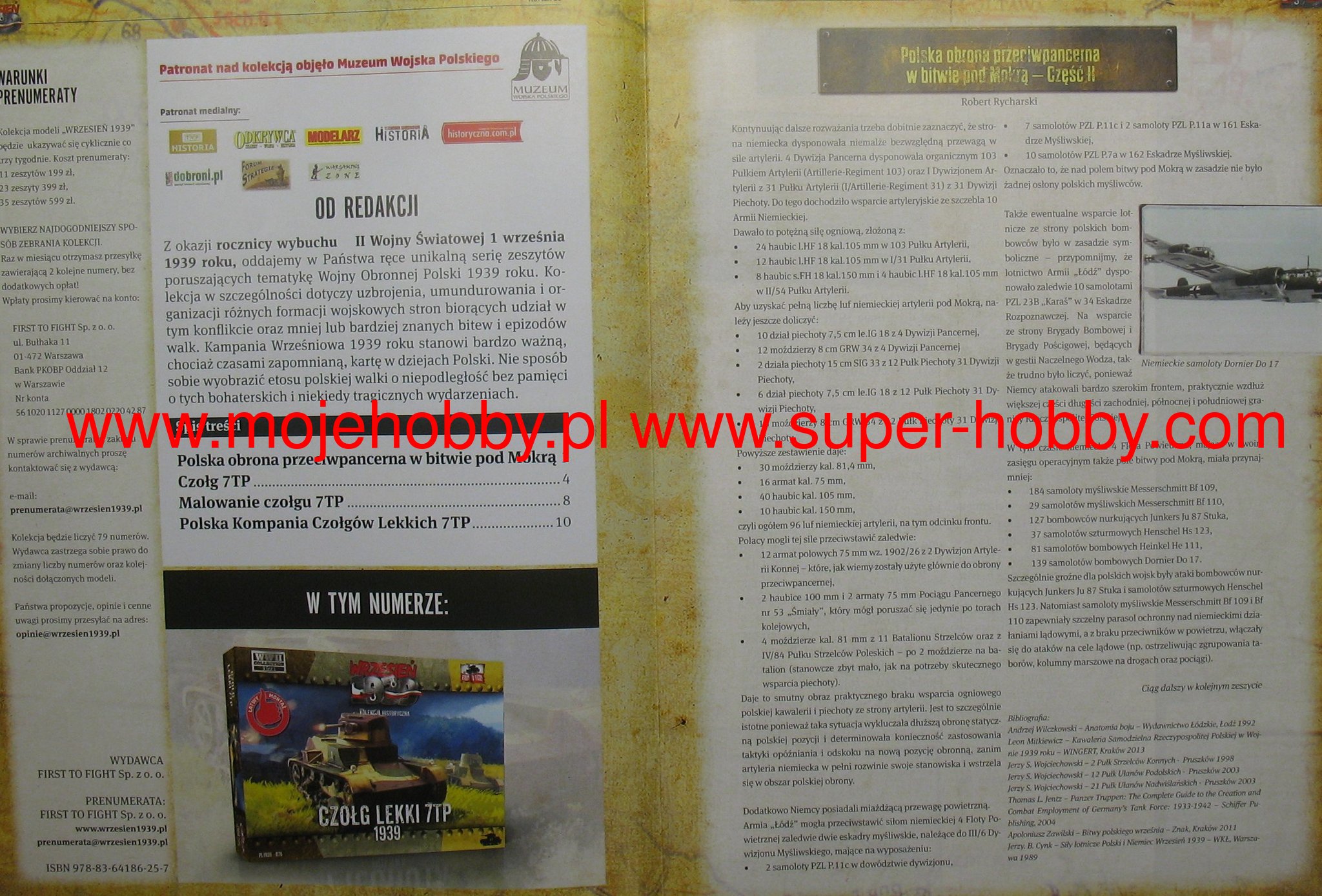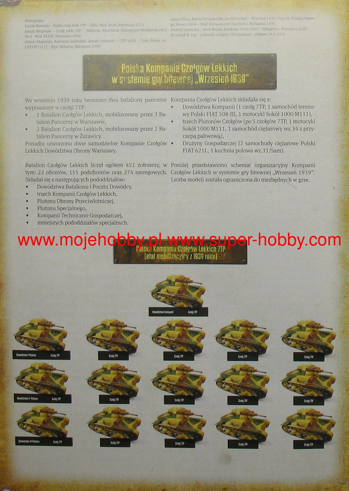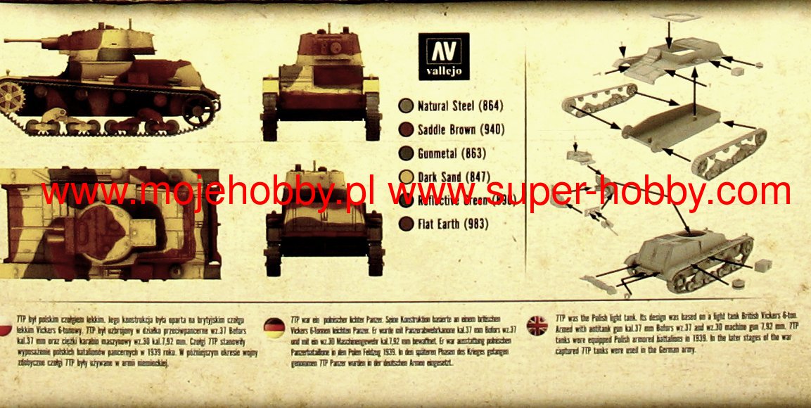 Polish light tank from the beginning of World War II. The 7TP tank, along with the tankettes (e.g. TKS), was the basic element of the Polish armored forces in 1939. 7 TP was designed at Państwowe Zakłady Inżynierii in Ursus, where it was also produced since 1935. The tank is a development of the British Vickers E, the license of which was acquired by Poland in the early 1930s. The first 24 examples of the 7TP were twin-turret vehicles, the next serial ones (built from 1937) already had one turret, and the main armament was the anti-tank gun. 37mm by Bofors. The 7TP tank was a technically advanced design for its time. It was one of the first in the world to have a diesel engine, a reversible periscope, and in some copies also radio stations (RKBc 2N / C) with a range of up to 25 km. During the September campaign, around 130 tanks of this type of all variants were used. The 7TP proved itself on the battlefields of September 1939 as an opponent towering over the German Pz.Kpfw I and II, and at least equal to the Pz.Kpfw III and IV. Technical data: weight 9.4-9.9t, engine power: 110HP, speed: 37km / h, armament (single turret version): 1 Bofors 37mm cannon, 1 machine gun wz. 30 cal. 7.92mm.