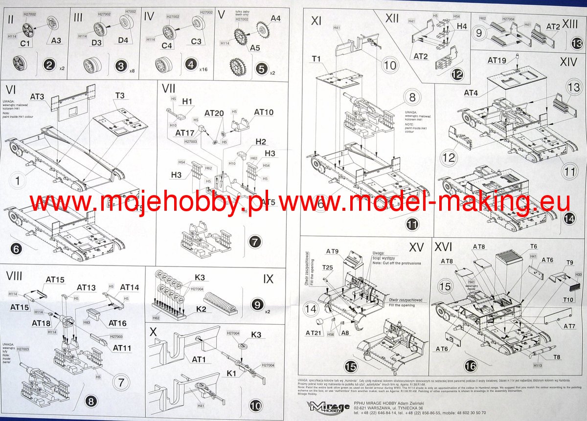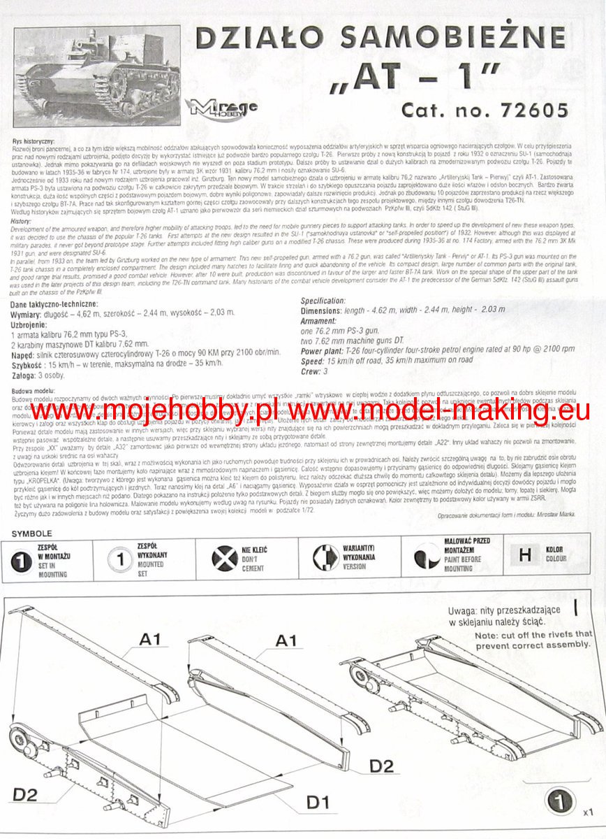The AT-1 was a prototype Soviet self-propelled gun from the Second World War. The first prototypes were built in 1935, but the car never entered mass production. The AT-1 was powered by a single engine carburetor with a power of 90 HP. The original version of the vehicle was armed with a single 76.2 mm PS-3 tank gun and a single 7.62 mm DT machine gun. At the turn of 1932 and 1933, in the design office at factory No.174 in Leningrad, the concept of creating a self-propelled gun using the chassis and hull of the T-26 tank was born. However, the first prototype was built relatively late, probably due to the desire to take into account the flaws revealed during field tests by a very similar design - the SU-1 gun. Nevertheless, the trials and tests of the AT-1 revealed many shortcomings of the design and the overall underdevelopment of the vehicle. It was decided to remove them and change the main armament to the L-10 cannon, also with a caliber of 76.2 mm. However, work on the AT-1 dragged on until 1938, and despite the initial order for 100 of this vehicle, it was canceled in favor of the modified BT-7.Download Mirage Hobby PDF catalogue