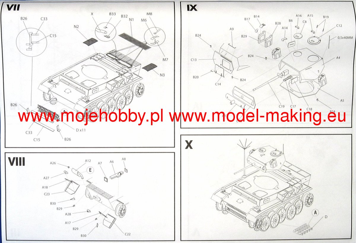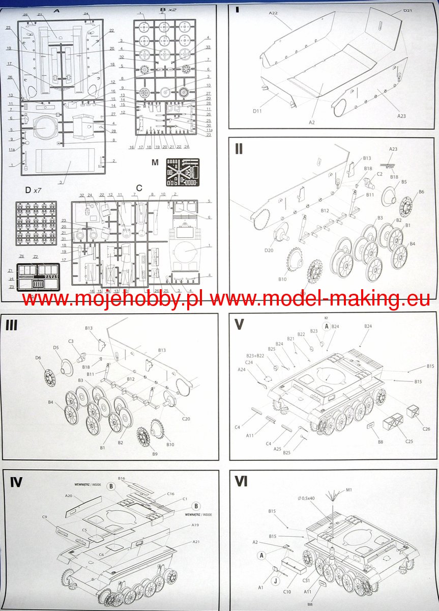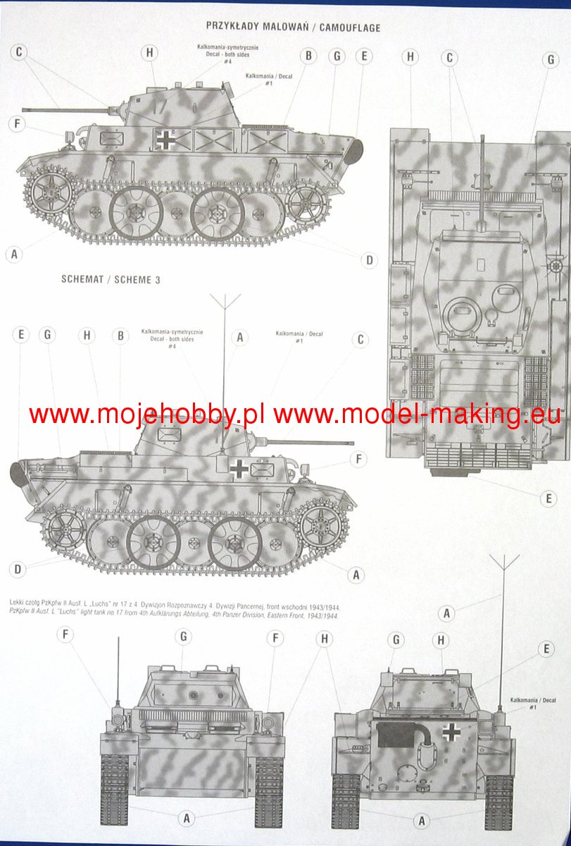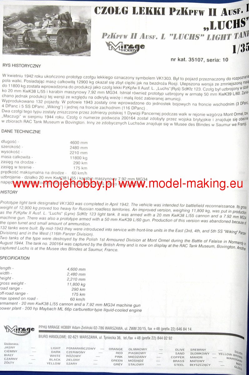The PzKpfw II (Panzerkampfwagen II) was a German light tank from the Second World War. The first prototypes of the vehicle were created in 1934, and serial production continued in the period 1935-1944, ending with the production of about 1,850 cars. The A version of the tank was powered by a single Maybach HL 57 TR engine with a capacity of 130 HP. It was armed with 1 20mm KwK 30 gun and 1 7.92mm MG 34 machine gun. placed in the tower. PzKpfw II was created as a result of a competition announced by the German Armaments Bureau for a light tank weighing up to 10 tons, armed with a 20 mm gun. The competition was won by MAN in cooperation with Daimler-Benz. Serial production started in 1935, and many variants of the PzKpfw II tank were created during it. Chronologically, the first was version A, but it was produced in relatively small quantities. Soon after, version B was created, which already had a new, more powerful engine and a changed chassis. Already in 1937, the C version was created, with a substantially changed chassis and reinforced frontal hull armor. At the end of 1940, the F version was created, which had stronger armor and a better gearbox than the C version. In 1942, the production of the L ("Luchs") version began, which had a completely new chassis, a new 180 HP engine and significantly increased speed maximum - from 40 km / h to 60 km / h. Numerous other vehicles were also built on the chassis of the PzKpfw II, such as the Wespe self-propelled howitzer or the Marder II tank destroyer. PzKpfw II tanks were used on almost all fronts of World War II, and from 1942 they were assigned to secondary tasks.Download Mirage Hobby PDF catalogue