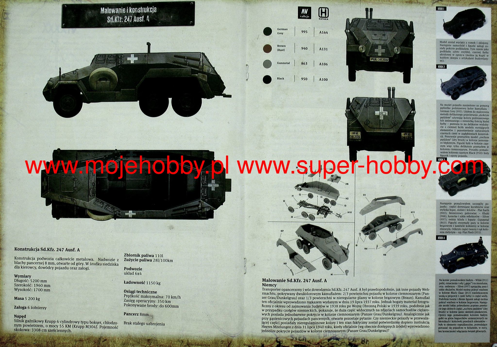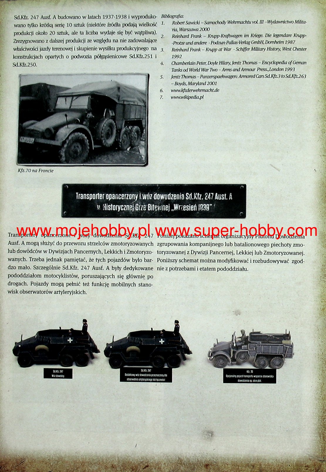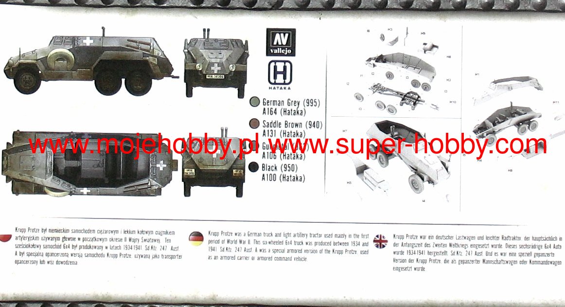 Sd.Kfz. The 247 was a German armored car and command vehicle from the Second World War. The first cars of this type were built in 1937 - in the same year, a small series production was also carried out, which resulted in the creation of about 10-15 cars of this type. The vehicle was powered by a single 65hp Krupp 4-cylinder engine. The maximum speed was up to 70 km / h, and the operating radius was about 350 kilometers. Most cars of this type did not have standard weapons. The Sd.Kfz vehicle. 247 was developed by the Krupp concern in connection with the Wehrmacht's 1936 order for a new command vehicle. In order to shorten the research and development work, the manufacturer based the new vehicle on the chassis and suspension of the Krupp Protze 6x4 truck. However, he built a completely new body made of armor plates up to 8 mm thick. The Sd.Kfz vehicle. 247 could be used both as a command vehicle, but also as an armored personnel carrier or an artillery observation vehicle. It should be added, however, that Sd.Kfz. The 247 had moderate off-road capability and was used primarily on dirt roads. Vehicles of this type were used during the September campaign (1939), the campaign in the West (1940) and in the initial phase of the fighting in the USSR (1941-1945). Few of them survived until the end of the war.