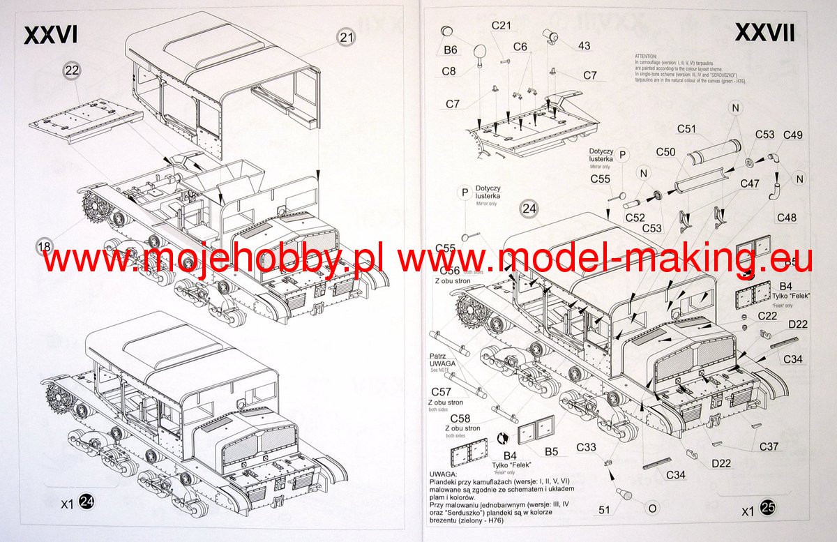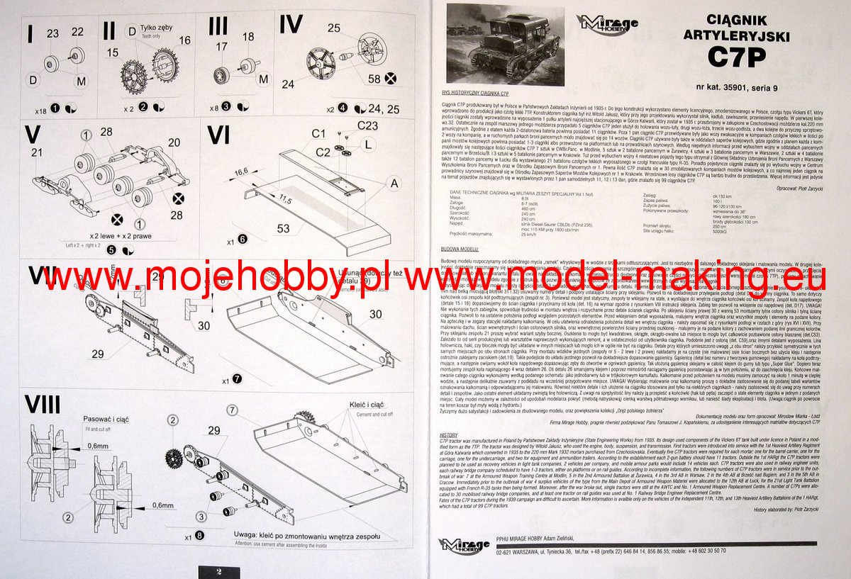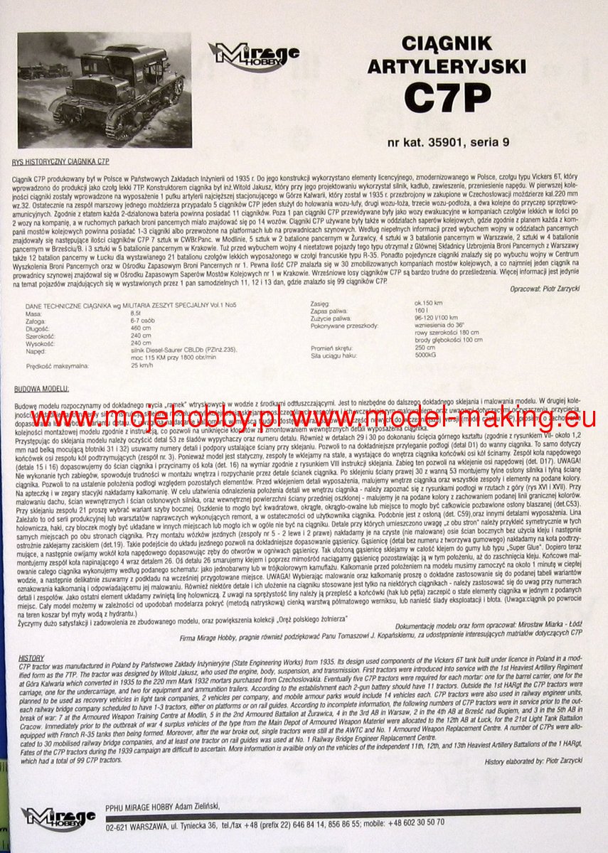 Download Mirage Hobby PDF catalogueThe C7P was a Polish tracked artillery tractor from the interwar period and World War II. The first prototypes of the vehicle were built in 1933, and serial production continued in the period 1934-1939, ending with the production of about 150 examples. The C7P was powered by an engine PZInż. 235 with 115 hp. The vehicle did not have any permanent weapons. Along with the slow motorization and mechanization of the Polish Army at the turn of the 1920s and 1930s, it was decided to increase the mobility of Polish artillery and use in some of its units new tracked tractors that would replace the vehicles used so far - such as the Holt tractor 75. In order to shorten the time needed for analytical and implementation works, it was decided to use the chassis and many components were developed at the same time for the 7TP tank. As a result, a vehicle with good off-road characteristics, low failure rate and relatively easy operation was created. C7P tractors were used primarily for towing heavy cannons, howitzers and mortars. The main target unit turned out to be the 1st Heaviest Artillery Regiment, which received a large part of the C7Ps produced. These vehicles also found their way to the armored forces, where they were used to tow and retrieve damaged tanks from the field. C7P tractors took part in the September campaign in 1939, and small numbers of them fell into the hands of the Wehrmacht and the Red Army.
