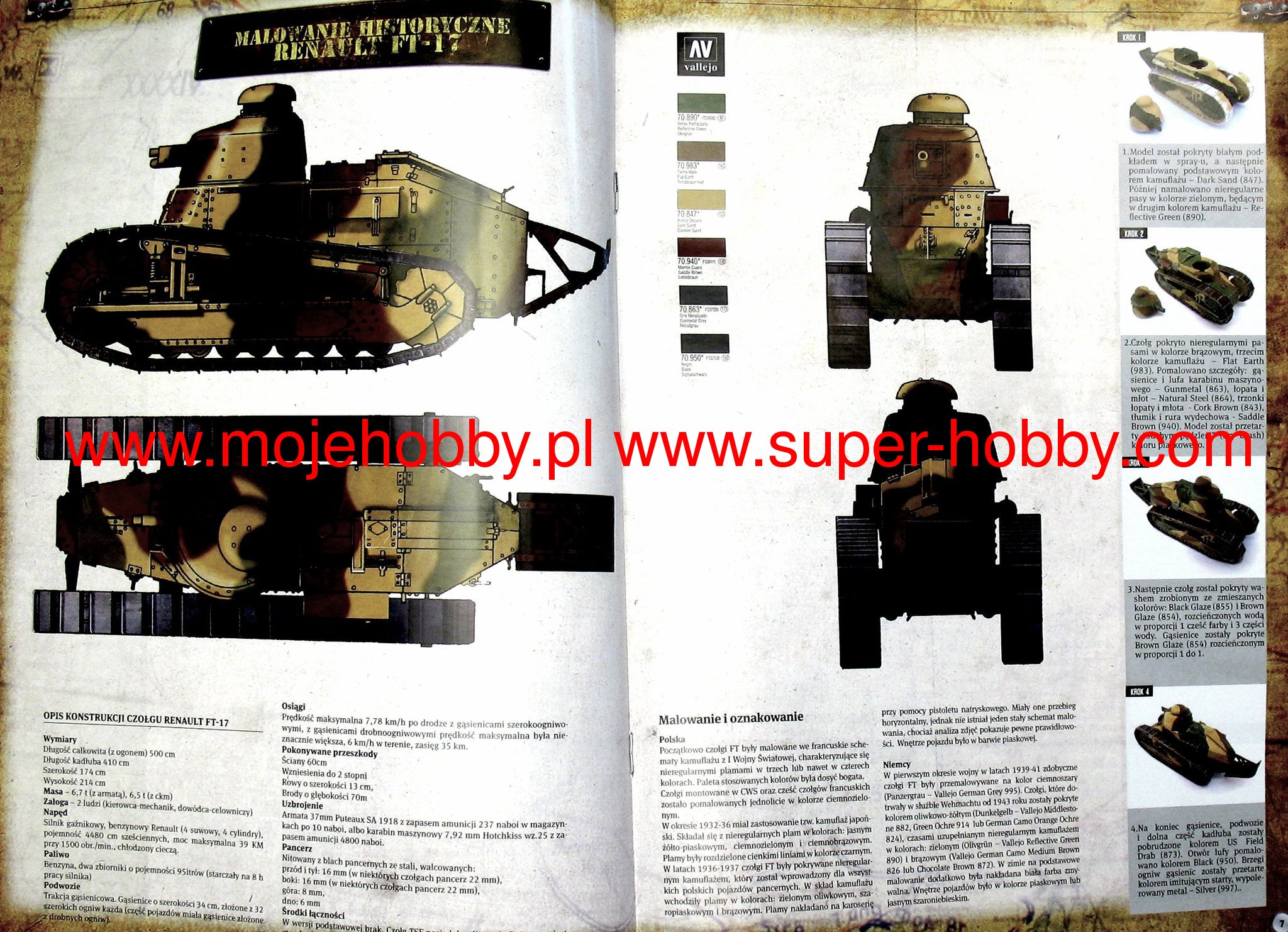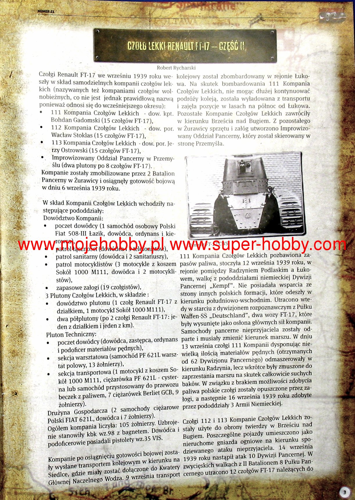 The Renault FT-17 was a French light tank from the First World War. The first prototypes of the vehicle were created at the end of 1916, and serial production started in 1917 and lasted until 1919, ending with the production of about 3,700-4,000 cars. The tank was powered by a single 35hp Renault 18CV carburetor engine. Its main armament was either a single Puteaux cannon 37mm L / 21 or 1 7.92 mm Hotchkiss machine gun. The armament was mounted in a round cast tower by Renault or a conical riveted tower by Berliet. Renault FT-17 was one of the most revolutionary tank designs of World War I, as it was the first vehicle in history to feature a classic tank design: the driver's seat was located in the front, the combat compartment with a rotating turret was placed in the middle, and the engine compartment at the rear. This layout has been preserved in tanks to this day, due to its high functionality. The Renault FT-17 was also small in size and had a crew of only two people, which was unheard of compared to other tanks of that period! Renault FT-17 also received a special "tail" at the rear of the fuselage, which made it easier for it to overcome the trenches on the battlefield. The vehicle, which debuted on the battlefield on May 31, 1918, fought until the end of the war, proving to be the most effective and reliable tank of the French army. After 1918, it was widely exported (e.g. to Poland or the USA), often constituting the first tank in the history of the armed forces of a given country. The Italian FIAT 3000 tank and the Soviet MS-1 were also based on its design. Renault FT-17 remained in the arsenals of the French and Polish armies until the outbreak of World War II, but at that time it was perceived as completely obsolete design.