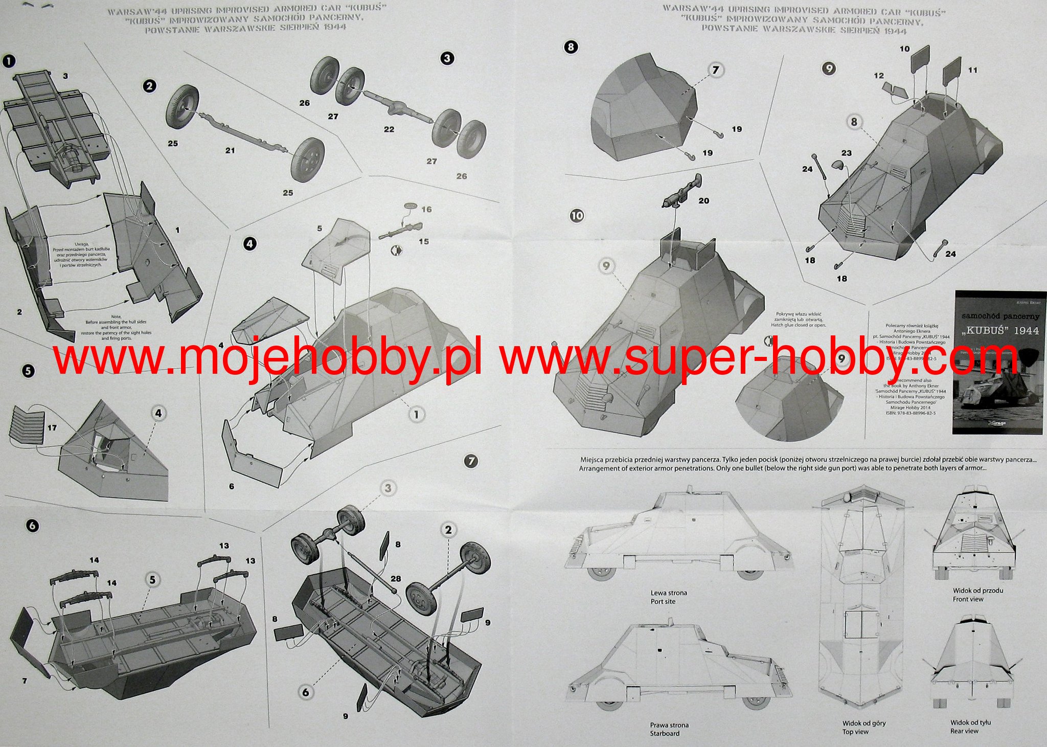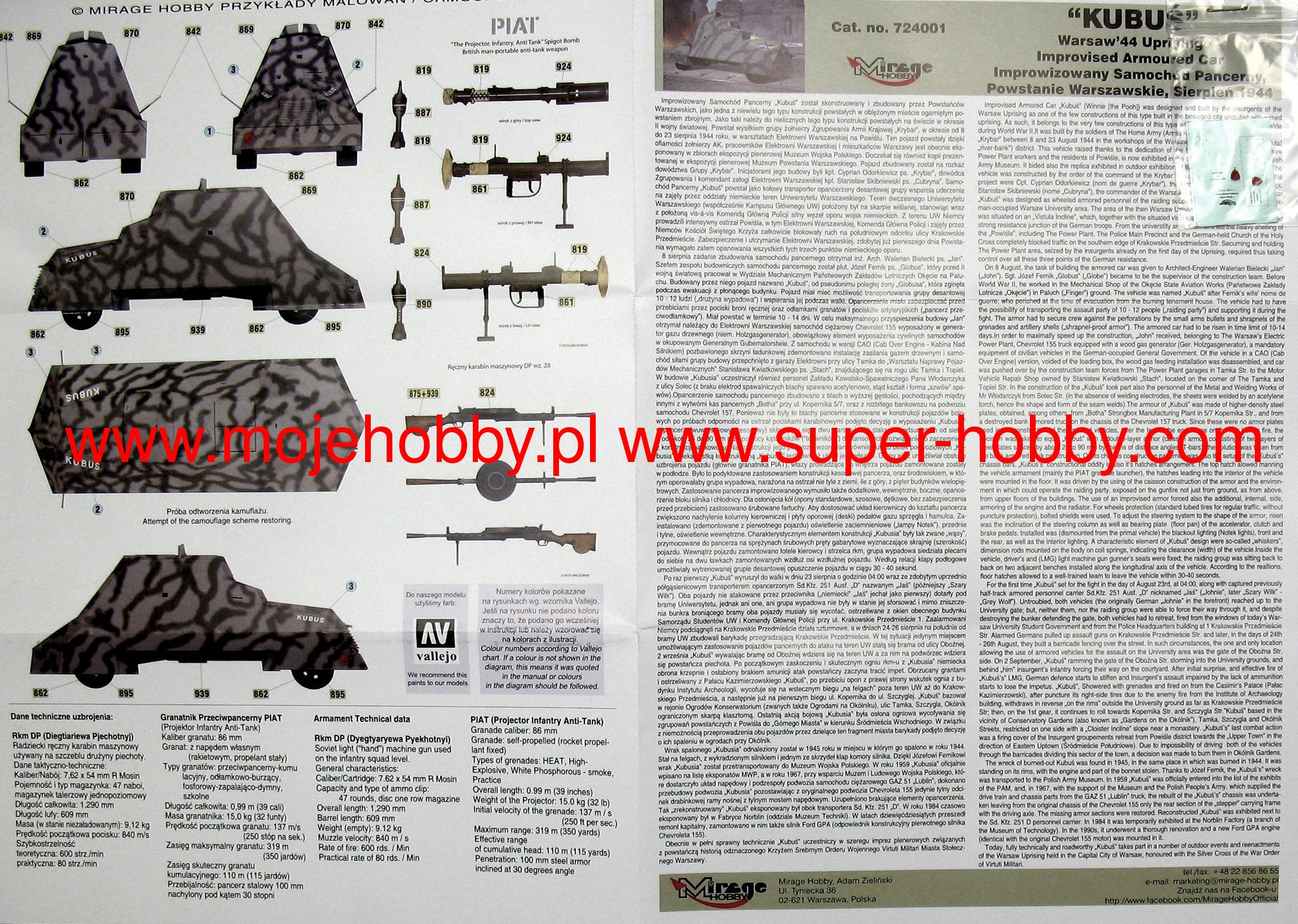 Download Mirage Hobby PDF catalogueKubuś was a Polish light armored car (armored personnel carrier) from the Second World War that served during the Warsaw Uprising in 1944. Only one copy of this vehicle was built. The armament of the car consisted of a single 7.62 mm DP machinegun or wz. K. The decision to build Kuba was made at the beginning of the fighting in Warsaw, probably on August 8, 1944. Its originator is considered to be Captain Cyprian Odorkiewicz, pseud. Krybar. The structure of the car was based on the frame of a Chevrolet model 157 truck with a capacity of 3 tons, which was licensed in Warsaw before the outbreak of World War II. In conditions of material shortages and in the course of combat, the vehicle was built - from scratch - in 13 days! The car was ready on August 23, 1944, when it also underwent its baptism of fire during the fighting at the University of Warsaw building. The vehicle was immobilized and excluded from fighting on September 6. Kubuś was probably the only armored car made independently by the underground in occupied Europe. The vehicle has survived and today it can be seen at the Polish Army Museum in Warsaw - its replica is on display at the Warsaw Uprising Museum.
