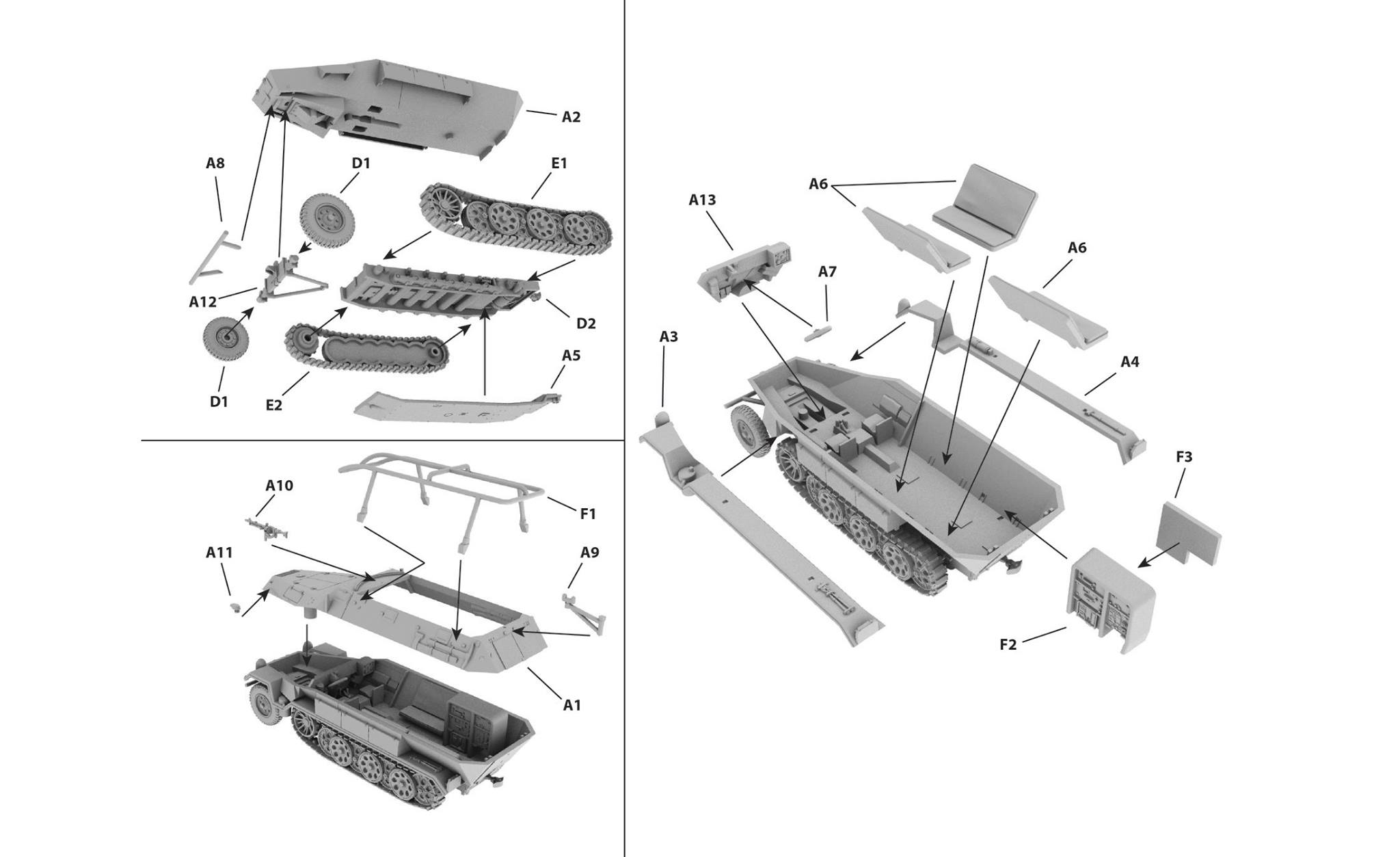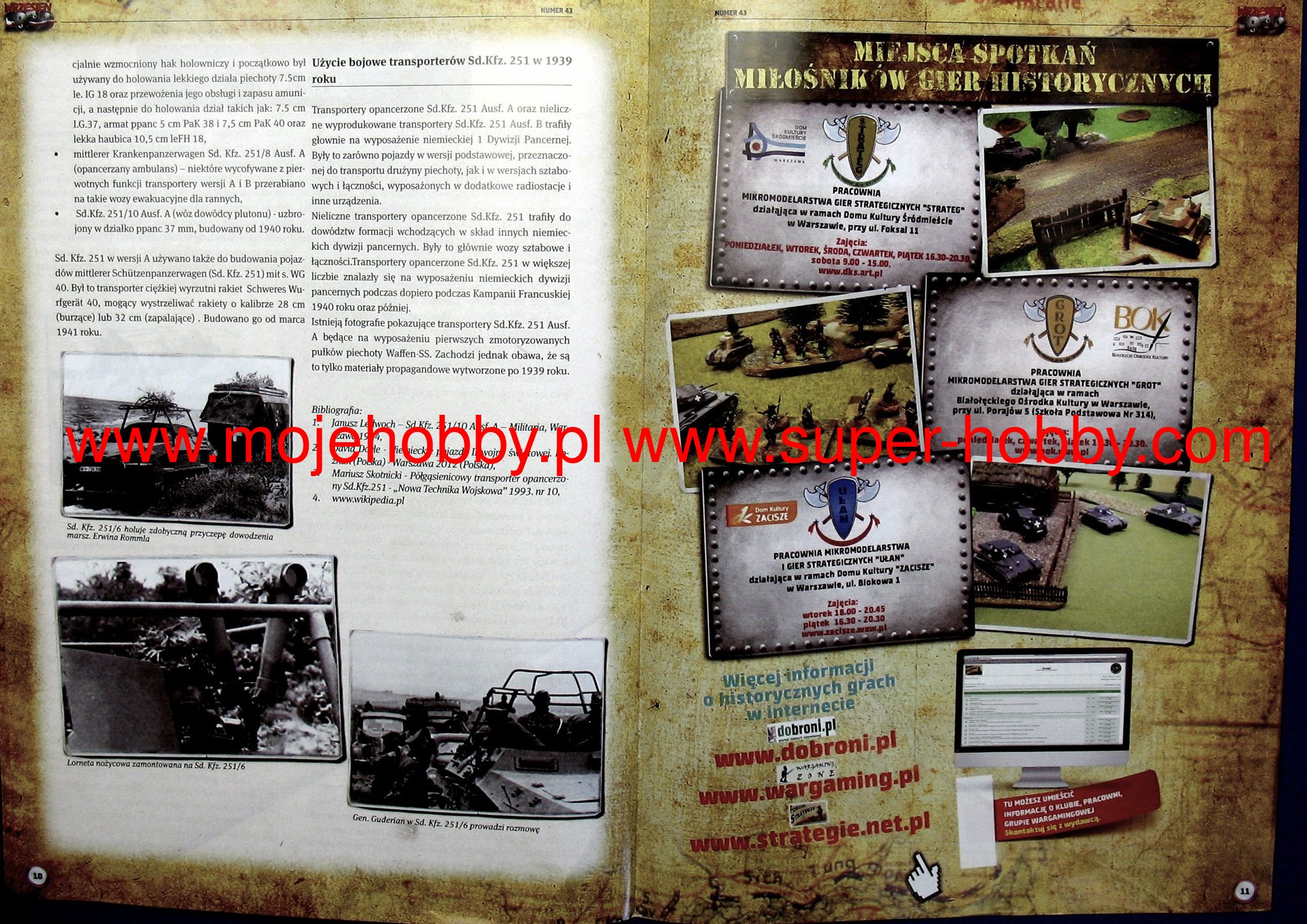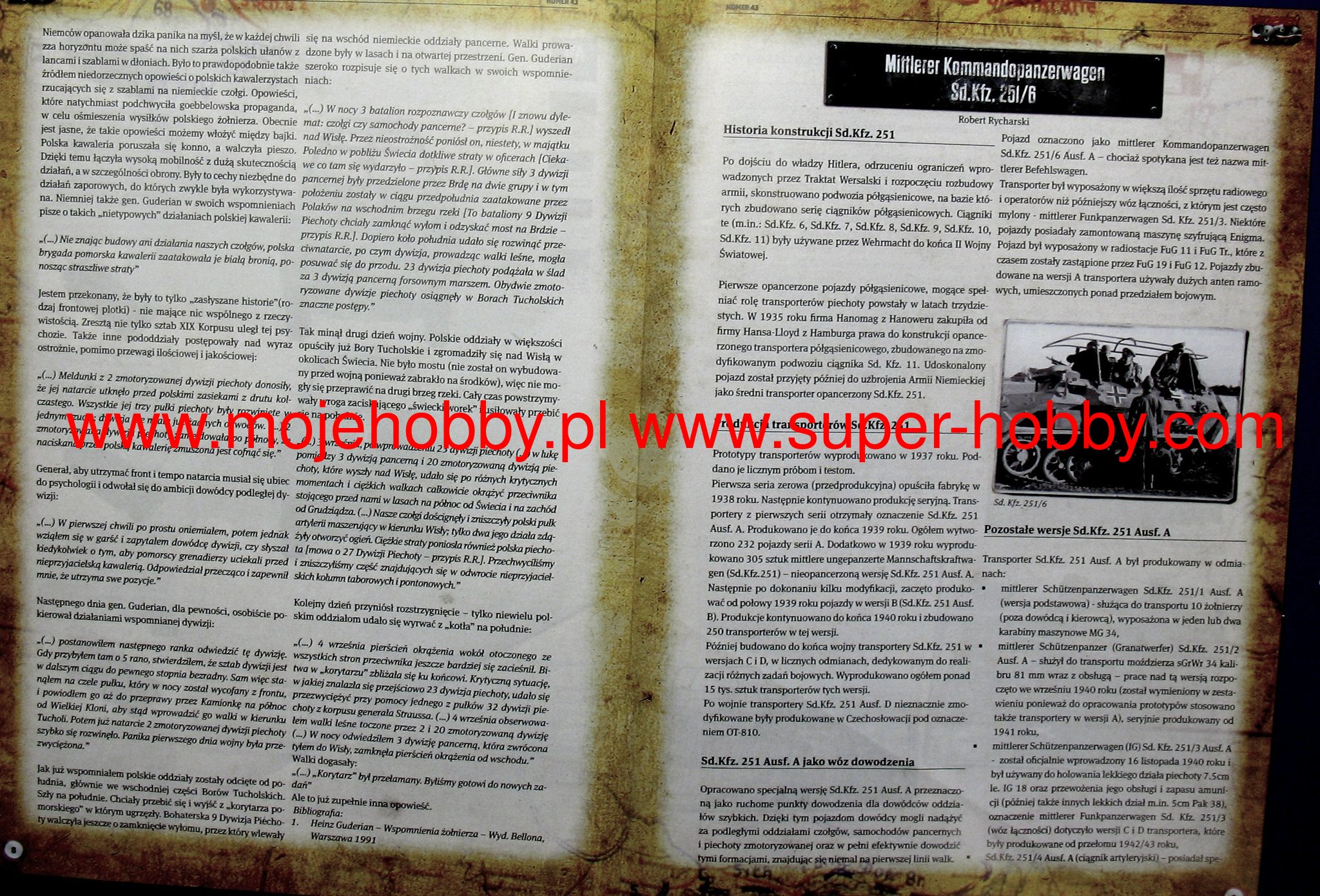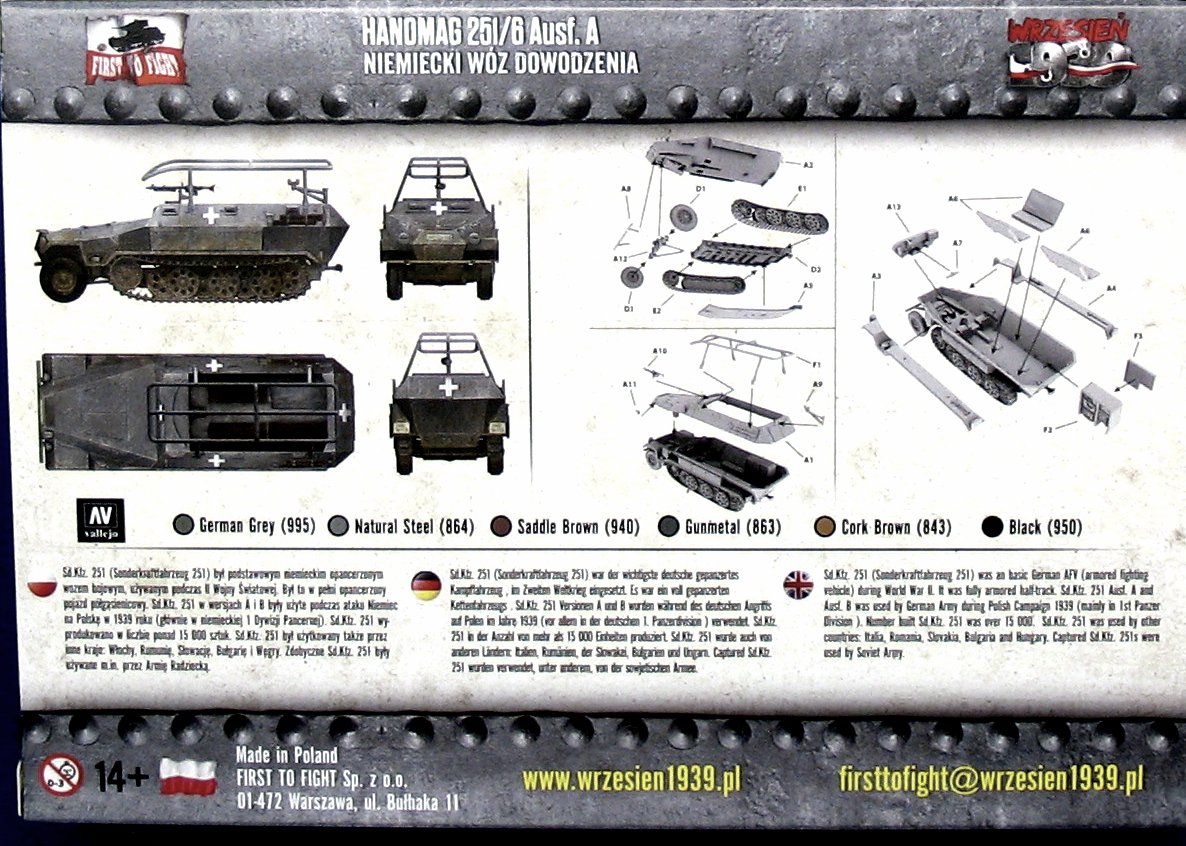 Sd.Kfz 251 was a German, medium, half-track armored transport from the Second World War. The first prototypes of the vehicle were made in 1935, and serial production continued in 1939-1945, ending with the production of about 14,500 units. The Sd.Kfz 251 was powered by a six-cylinder engine Maybach HL 42 TURKM with 100 hp . Sd.Kfz 251 was developed as a new, basic half-tracked transporter of the German armed forces. Its design was based on the Sd.Kfz.11 heavy tractor, with several elements changed in the adapted chassis: a new fuel tank was added, the location of the steering wheel, and the exhaust system was redesigned. In the course of serial production, four basic versions of the Sd.Kfz 251 (Ausf. A, B, C and D) were created, however, in terms of details related to the production process (especially the C version) and a slightly different arrangement of elements inside the fuselage. During World War II, more than 20 variants and versions of the Sd.Kfz 251 were created. The chronological first was the Sd.Kfz 251/1, which was the basic version, armed with two MG34 or MG42 machine guns and capable of carrying up to 10 landing troops. In 1941, a version of the Sd.Kfz 251/2 was developed, armed with an 80 mm mortar. There was also a version of the Sd.Kfz 251/3, which was a communication and radio communication vehicle with various sets of radio stations and antennas. In 1942, the Sd.Kfz 251/9 Stummel variant was developed, armed with a 75mm StuK 37 short-barrel gun. More interesting versions were the Sd.Kfz 251/16 with two flamethrowers or the Sd.Kfz 251/20 UHU equipped with an infrared radiation emitter and intended for targeting at night. Cars Sd.Kfz 251 of all versions served primarily in armored divisions and armored grenadiers on virtually all fronts of World War II: from the September campaign (1939), through the campaign in France (1940), fighting in the Balkans and North Africa (1941-1943) after fights on the Eastern (1941-1945) and Western (1944-1945) fronts.