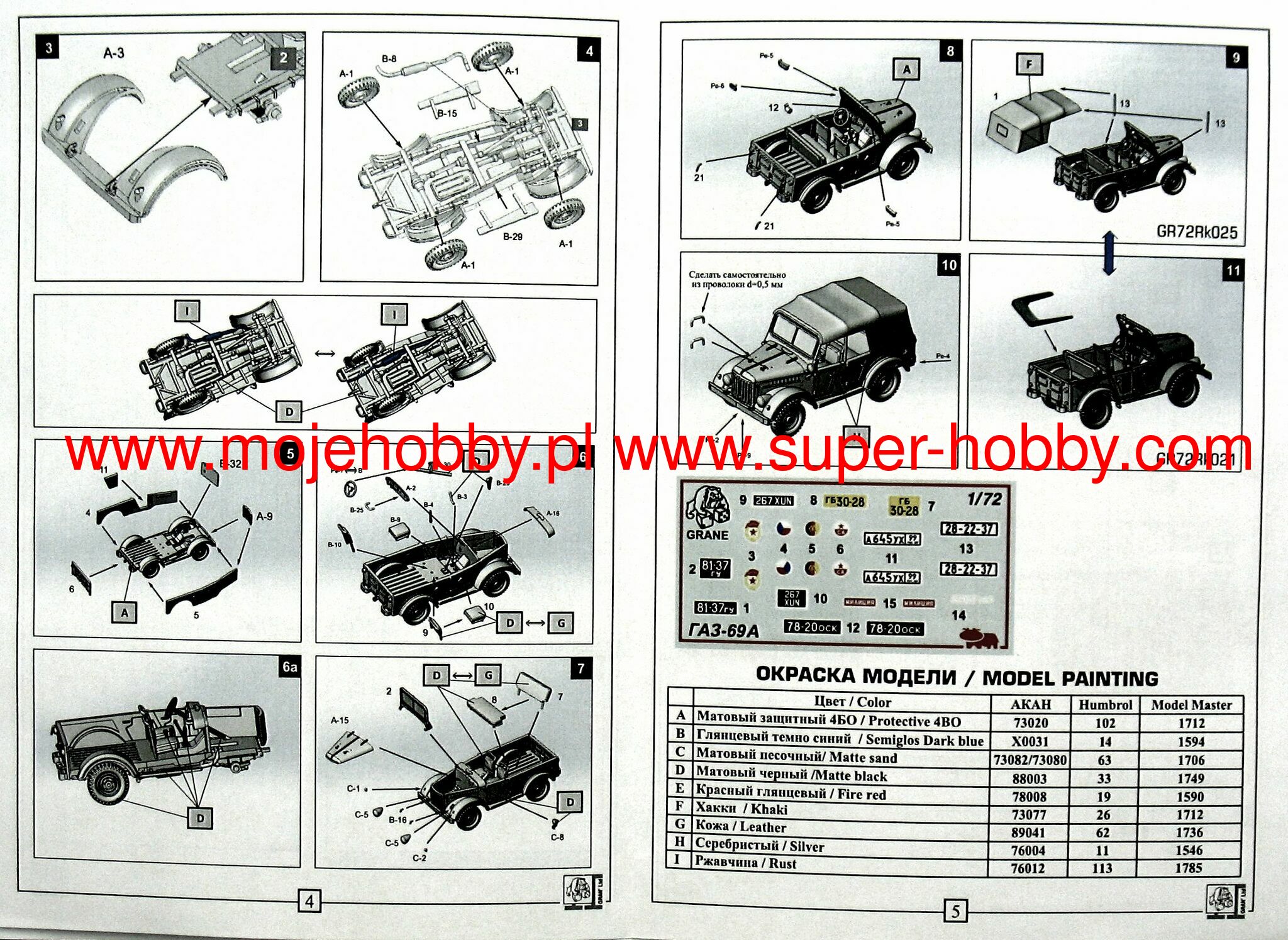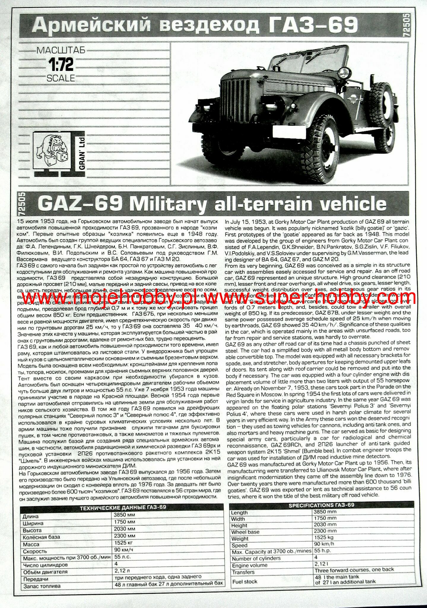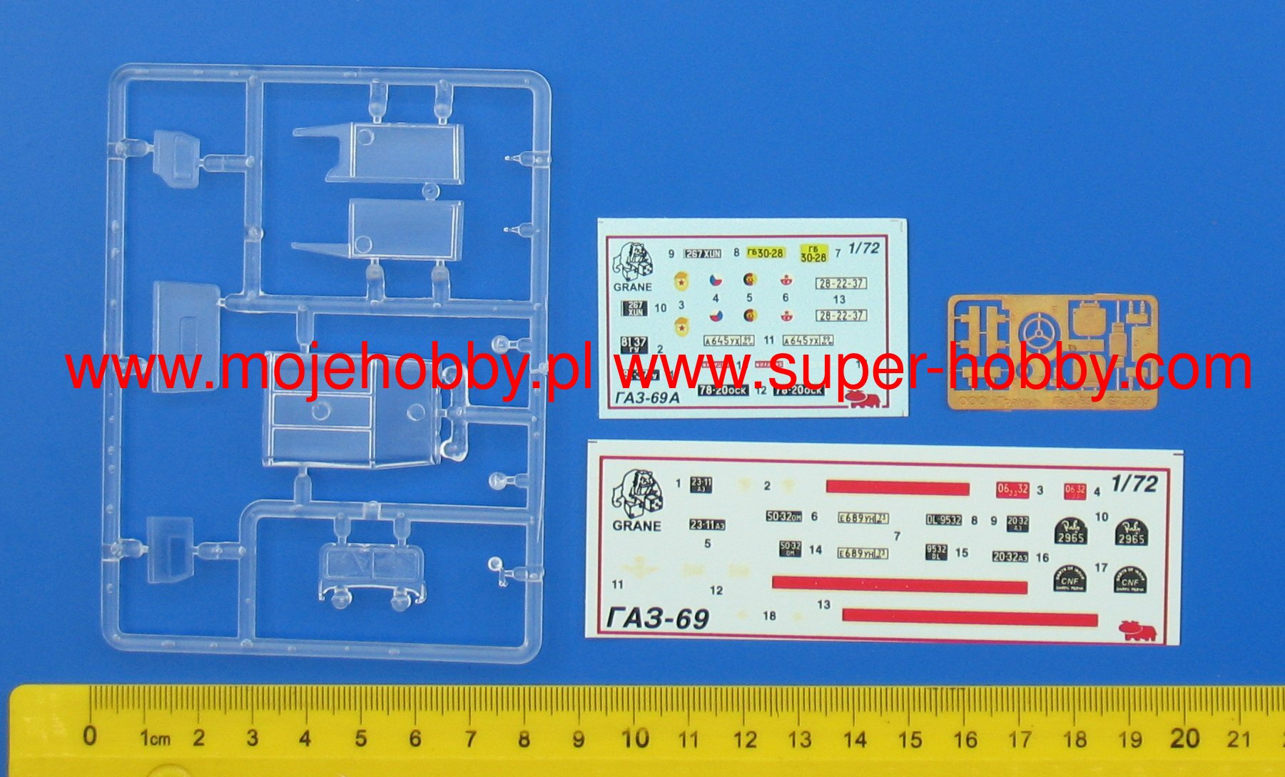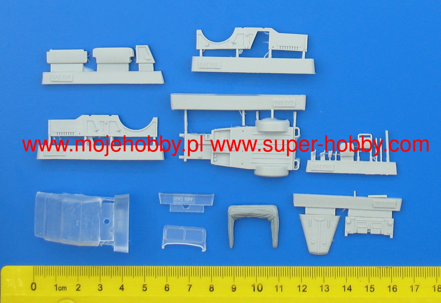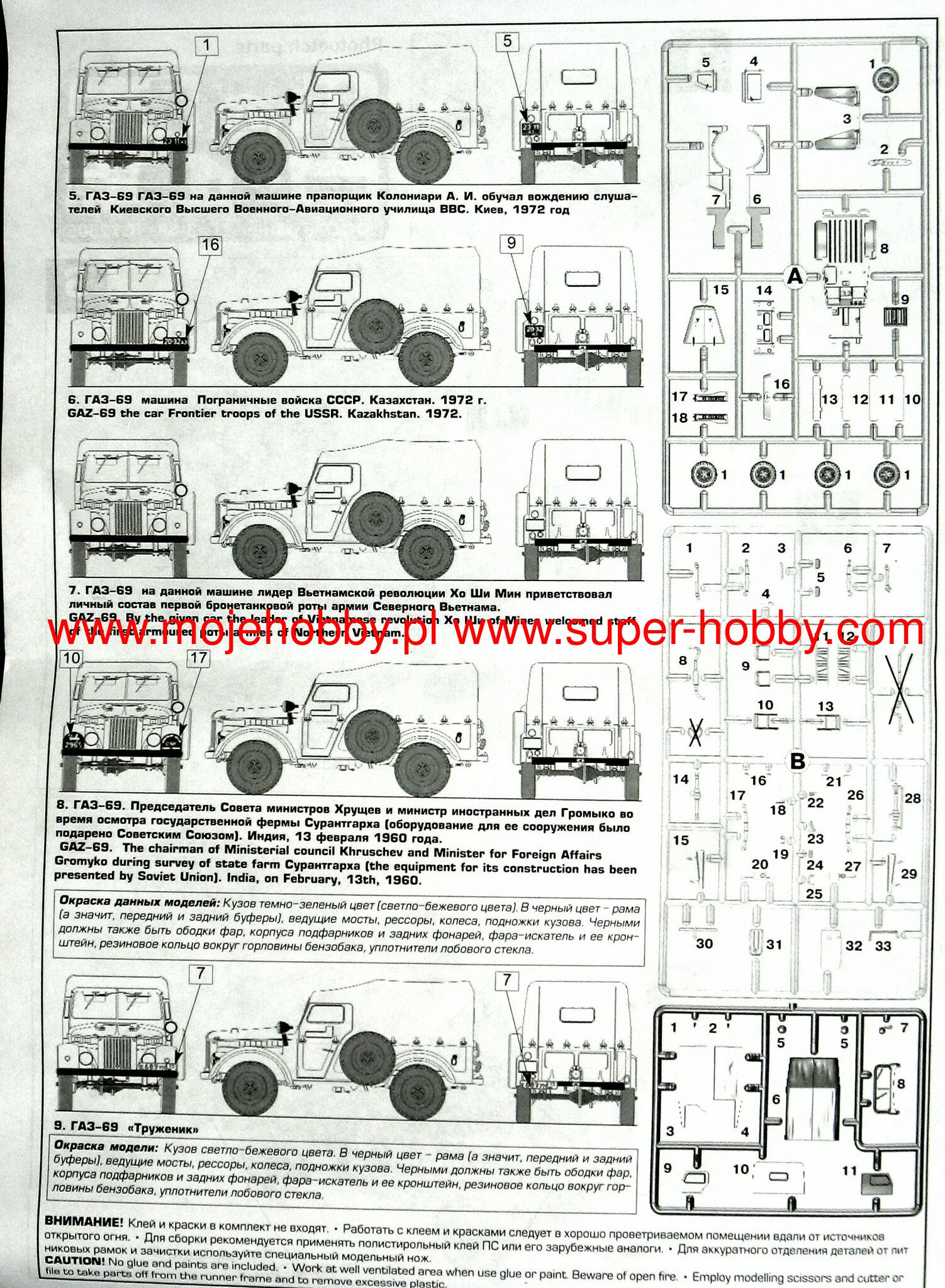 Samochód terenowy GAZ-69 został opracowany pod koniec lat 40. XX wieku. Produkcję seryjną rozpoczęto w 1952 roku w zakładach GAZ w mieście Gorki, a później także w zakładach UAZ w Uljanowsku. Produkcja seryjna trwała do 1972 roku. GAZ-69 był napędzany pojedynczym silnikiem R4 M-20 o mocy 55 KM oraz pojemności 2,1 litra. Posiadał również 3-biegową skrzynię manualną oraz napęd na wszystkie koła (4x4). Samochód terenowy GAZ-69 powstał jako następca GAZ-67. W wersji podstawowej mógł przewozić 8 osób, w tym dwie na przednich siedzeniach lub 500 kg ładunku. Wersja pierwotna posiadała nadwozie dwudrzwiowe, ale w 1951 roku opracowano nadwozie czterodrzwiowe (GAZ-69A). GAZ-69 cechował się bardzo dobrymi właściwościami terenowymi, wysoką niezawodnością oraz prostotą konstrukcji. Elementy te sprawiły, że stał się podstawowym, lekkim samochodem terenowym Armii Radzieckiej, jak i państw Układu Warszawskiego. Na podwoziu GAZ-69 opracowano także samobieżną wyrzutnię pocisków przeciwpancernych o nazwie 2P26. Samochód terenowy GAZ-69 Został zastąpiony w latach 70. XX wieku przez UAZ-469. Jednak do dzisiaj (2017 r.) pozostaje na wyposażeniu armii państw, np. Korei Północnej. Co oprócz modelu będę potrzebować do jego sklejenia?