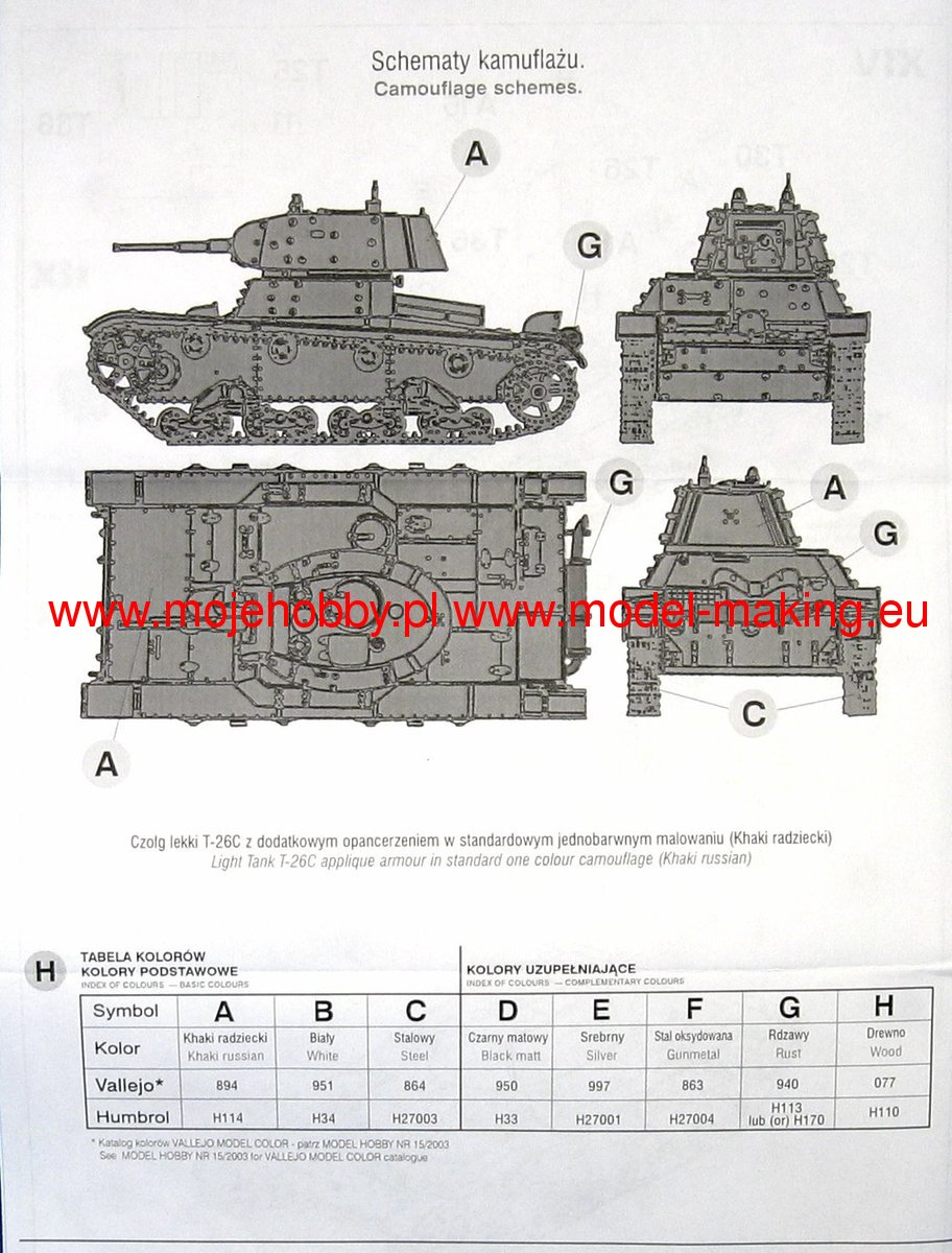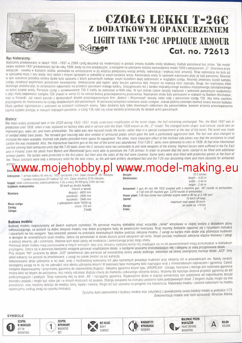 Download Mirage Hobby PDF catalogueThe T-26 is a Soviet light tank from the interwar period and World War II. The first prototypes of this vehicle were made in 1931, and the car entered service in 1931-1932. Approximately 12,000 vehicles of this type were produced in the course of production, along with derivative versions and specialized vehicles! The combat weight of the T-26 tank in the basic version was up to 8.2 tons. The drive was provided by a single, 12-cylinder GAZ carburetor engine with a power of 90-91 HP. The basic armament consisted of a single 45 mm wz.1932 or wz.1934 gun and 1 to 3 DT 7.62 mm machine guns. In fact, the T-26 was a far-reaching development of the British Vickers 6-Ton. The vehicle was also the basic Soviet infantry support vehicle in the 1930s and at the beginning of World War II. It is also worth remembering that the first prototypes of the car and the first production batches had two turrets (T-26 models 1931 and 1932), only from 1933 the tank was manufactured in a single turret variant with a 45 mm gun as the main armament. In the course of production, several variants of the T-26 and specialized versions were created, including: the T-26 model 1938 (version with a new turret, with sloped walls), ChT-130 and ChT-133 (specialized vehicles with flamethrowers) and a wagon ST-26 (bridge tank). The T-26 vehicles took part in numerous conflicts in the 1930s, including the border incidents in Manchuria in 1934-1945 and the civil war in Spain (1936-1939). Tanks of this type were also used on a considerable scale during the aggression against Poland in September 1939, during the Winter War (1939-1940), as well as during the war with Japan in 1939-1940. They were also used on a large scale in the initial phase of the German-Soviet war in 1941. It is worth noting that there are opinions that the latest versions of the T-26 (for example, the 1938 or 1939 model) were not significantly inferior to the German tanks during the Barbarossa or Typhoon operations.