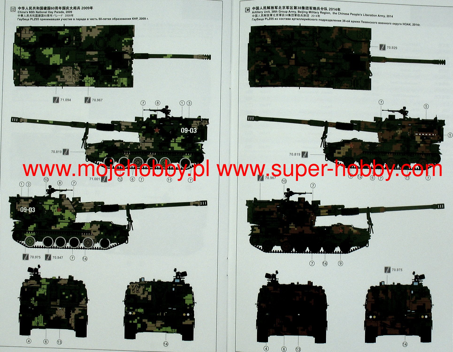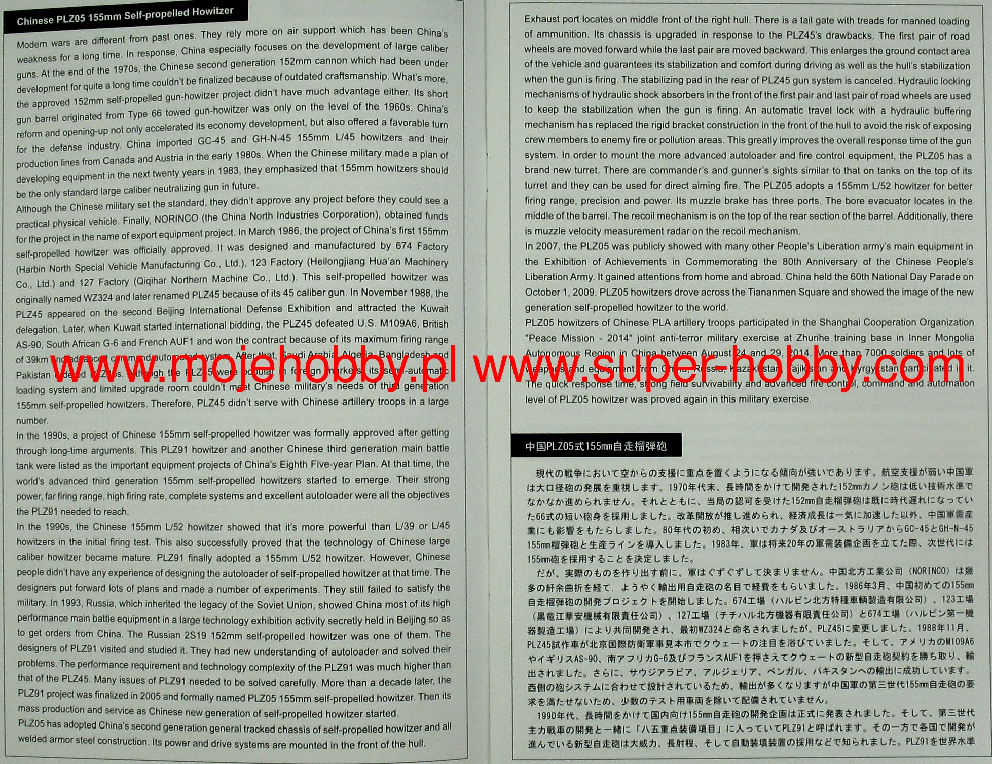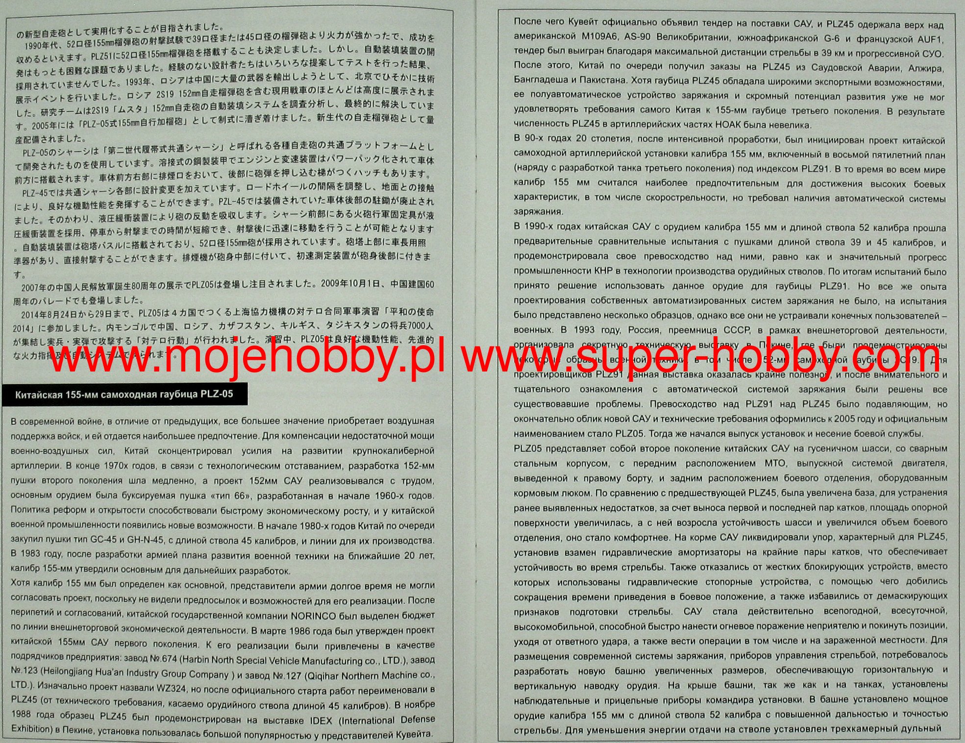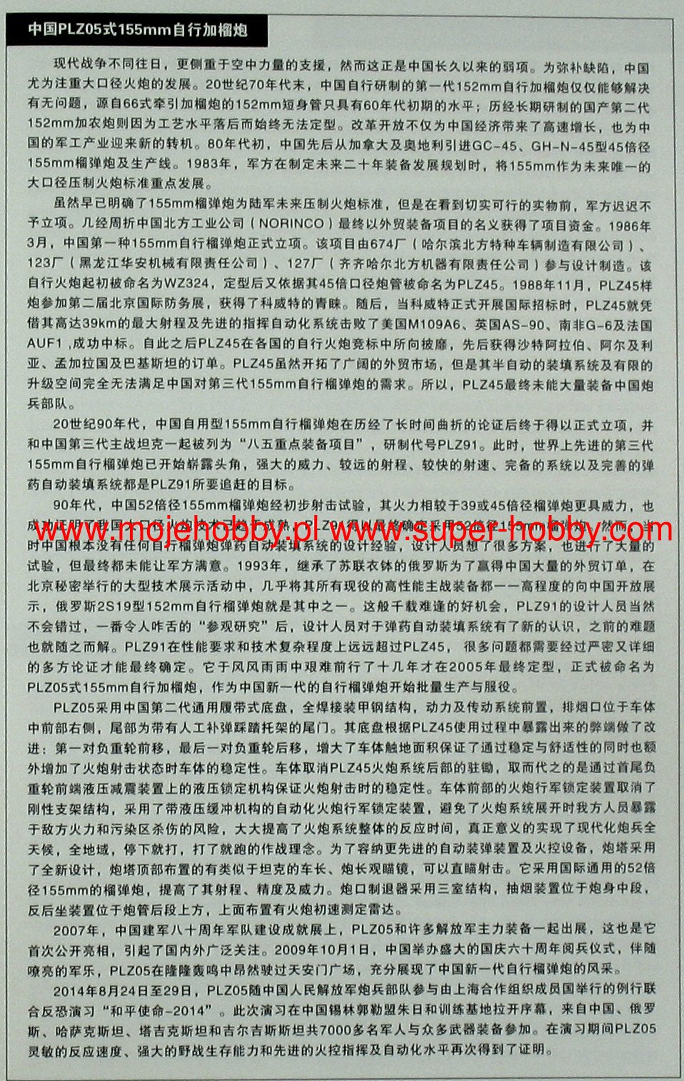 The PLZ-05 is a modern Chinese self-propelled gun on a tracked chassis. The first prototypes of the car were made in 2003, and serial production probably started in 2005 and is still going on. It is estimated that from 2005 to the end of 2017, approximately 300 vehicles of this type entered the line. The drive is probably provided by an 8-cylinder diesel engine with a capacity of 800-1000 hp. The armament - in the basic version - is a single 155 mm howitzer and a single 12.7 mm machine gun. The PLZ-05 was designed and manufactured by the Beijing-based NORINCO concern to replace the Type 59-1 and Type 83 vehicles in the Chinese armed forces. The PLZ-05 self-propelled gun itself was most likely developed on the basis of a highly modernized PLZ-45 gun design. It is assumed that the PLZ-05 has a high rate of fire, and the maximum range of a conventional high-explosive shell reaches approx. 30 kilometers. The car has armor that provides protection against small arms and artillery fragments. Currently, the production of an improved version (PLZ-52) is confirmed, it is powered by a 1000hp engine, ensuring better performance, as well as the design of the main armament has been refined and the fire control system has been improved.