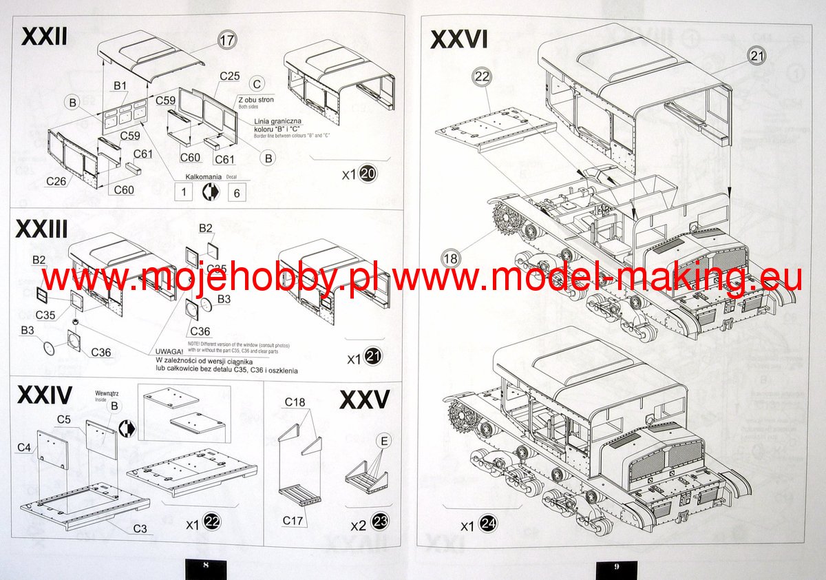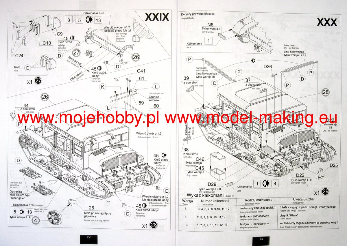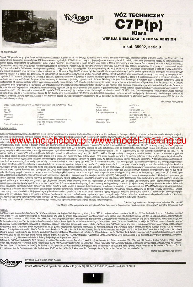 Download Mirage Hobby PDF catalogueThe C7P was a Polish tracked artillery tractor from the interwar period and World War II. The first prototypes of the vehicle were built in 1933, and serial production continued in the period 1934-1939, ending with the production of about 150 examples. The C7P was powered by an engine PZInż. 235 with 115 hp. The vehicle did not have any permanent weapons. Along with the slow motorization and mechanization of the Polish Army at the turn of the 1920s and 1930s, it was decided to increase the mobility of Polish artillery and use in some of its units new tracked tractors that would replace the vehicles used so far - such as the Holt tractor 75. In order to shorten the time needed for analytical and implementation works, it was decided to use the chassis and many components were developed at the same time for the 7TP tank. As a result, a vehicle with good off-road characteristics, low failure rate and relatively easy operation was created. C7P tractors were used primarily for towing heavy cannons, howitzers and mortars. The main target unit turned out to be the 1st Heaviest Artillery Regiment, which received a large part of the C7Ps produced. These vehicles also found their way to the armored forces, where they were used to tow and retrieve damaged tanks from the field. C7P tractors took part in the September campaign in 1939, and small numbers of them fell into the hands of the Wehrmacht and the Red Army.
