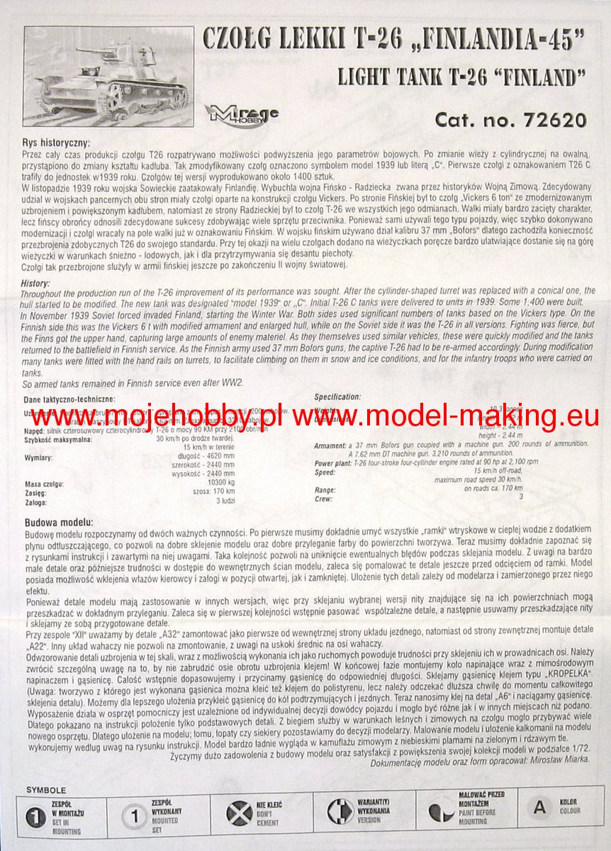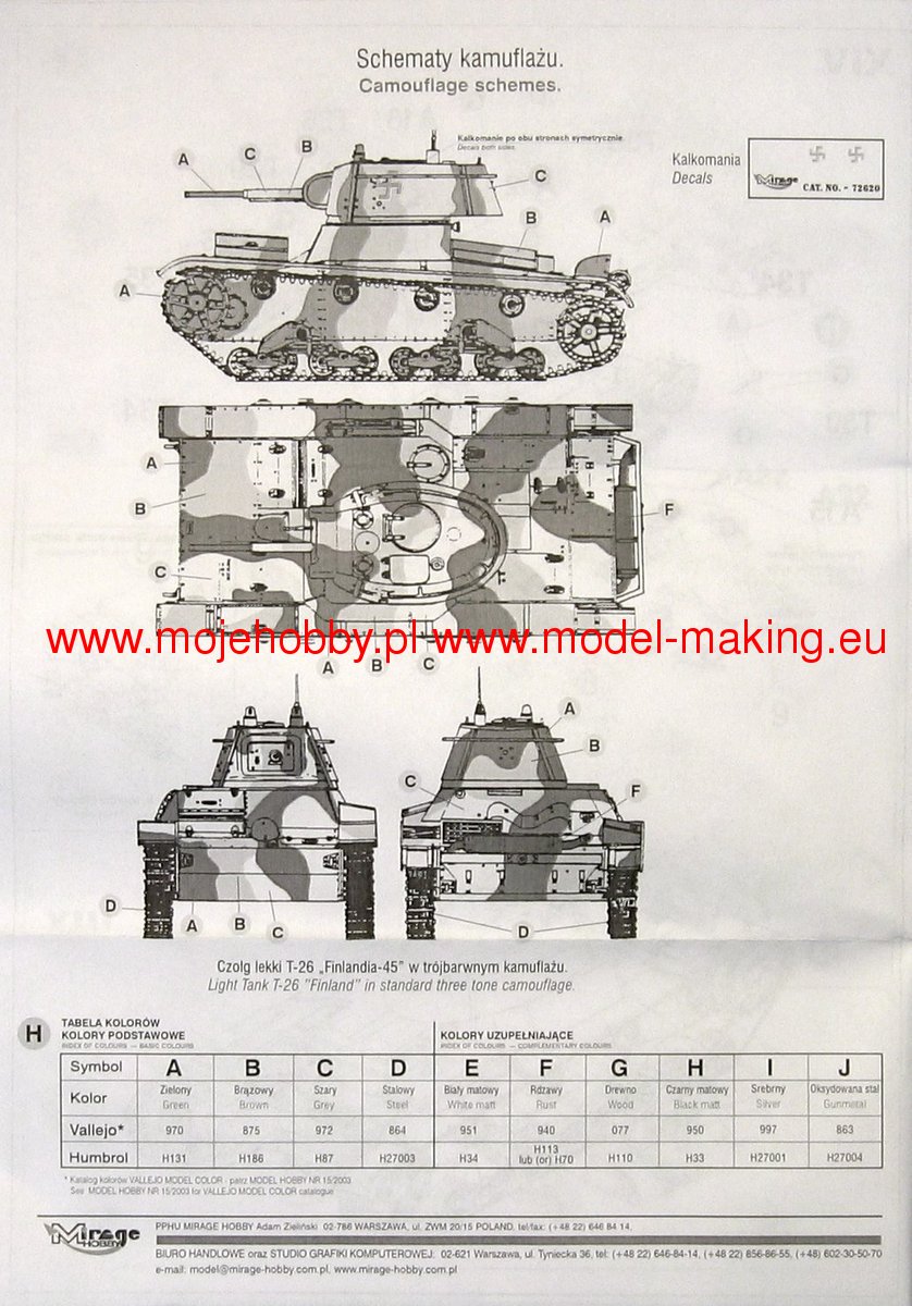 The T-26 is a Soviet light tank from the interwar period and World War II. The first prototypes of this vehicle were made in 1931, and the car entered service in 1931-1932. Approximately 12,000 vehicles of this type were produced in the course of production, along with derivative versions and specialized vehicles! The combat weight of the T-26 tank in the basic version was up to 8.2 tons. The drive was provided by a single, 12-cylinder GAZ carburetor engine with a power of 90-91 HP. The basic armament consisted of a single 45 mm wz.1932 or wz.1934 gun and 1 to 3 DT 7.62 mm machine guns. In fact, the T-26 was a far-reaching development of the British Vickers 6-Ton. The vehicle was also the basic Soviet infantry support vehicle in the 1930s and at the beginning of World War II. It is also worth remembering that the first prototypes of the car and the first production batches had two turrets (T-26 models 1931 and 1932), only from 1933 the tank was manufactured in a single turret variant with a 45 mm gun as the main armament. In the course of production, several variants of the T-26 and specialized versions were created, including: the T-26 model 1938 (version with a new turret, with sloped walls), ChT-130 and ChT-133 (specialized vehicles with flamethrowers) and a wagon ST-26 (bridge tank). The T-26 vehicles took part in numerous conflicts in the 1930s, including the border incidents in Manchuria in 1934-1945 and the civil war in Spain (1936-1939). Tanks of this type were also used on a considerable scale during the aggression against Poland in September 1939, during the Winter War (1939-1940), as well as during the war with Japan in 1939-1940. They were also used on a large scale in the initial phase of the German-Soviet war in 1941. It is worth noting that there are opinions that the latest versions of the T-26 (for example, the 1938 or 1939 model) were not significantly inferior to the German tanks during the Barbarossa or Typhoon operations.Download Mirage Hobby PDF catalogue