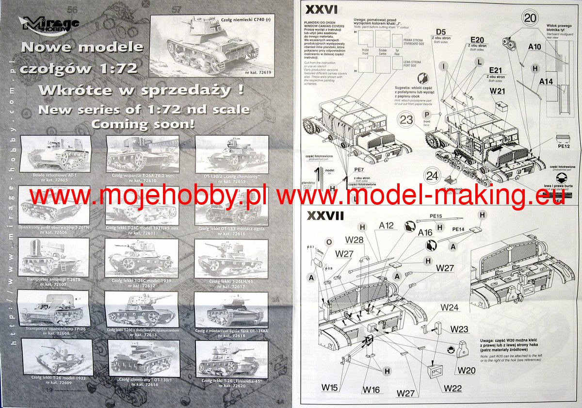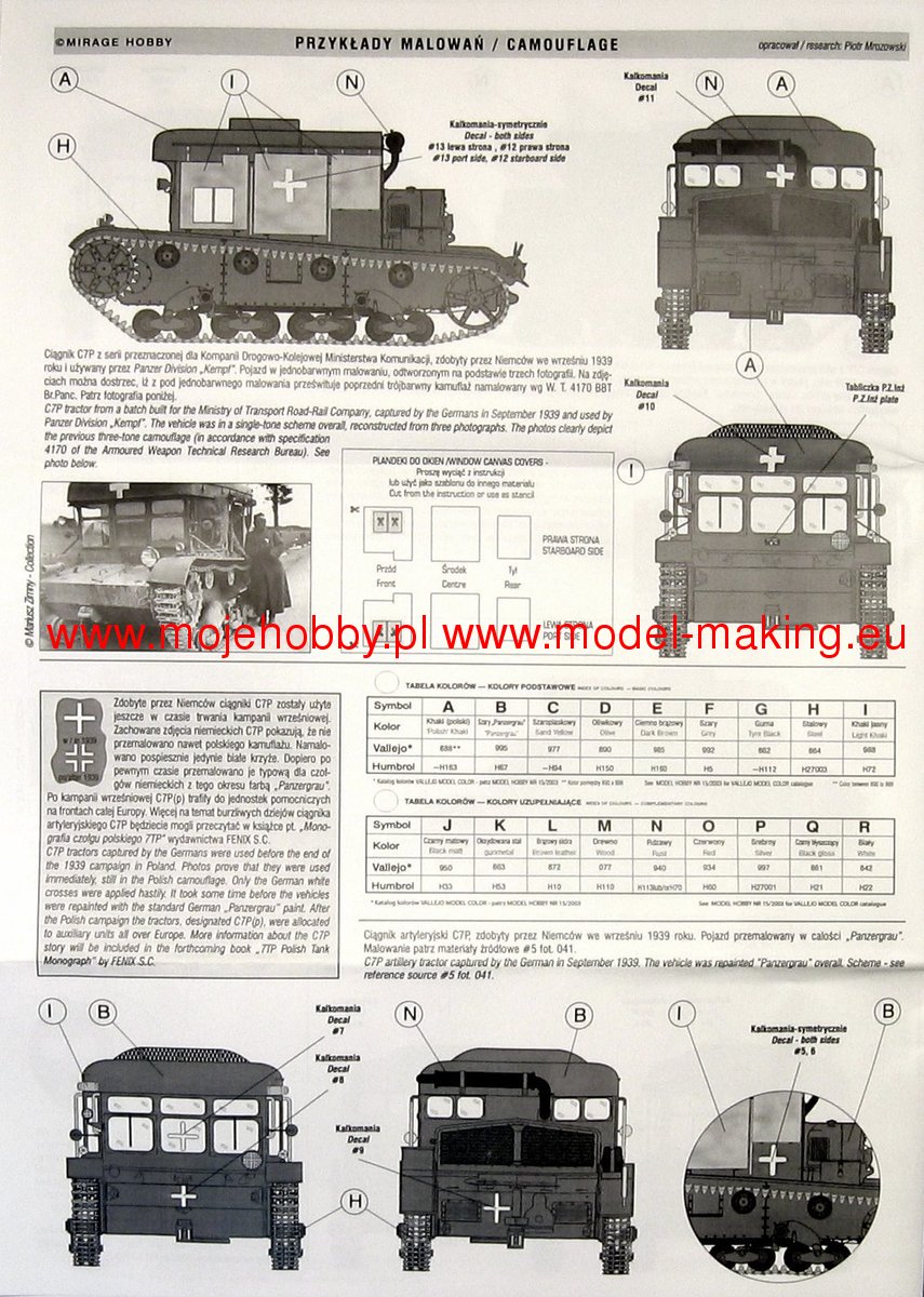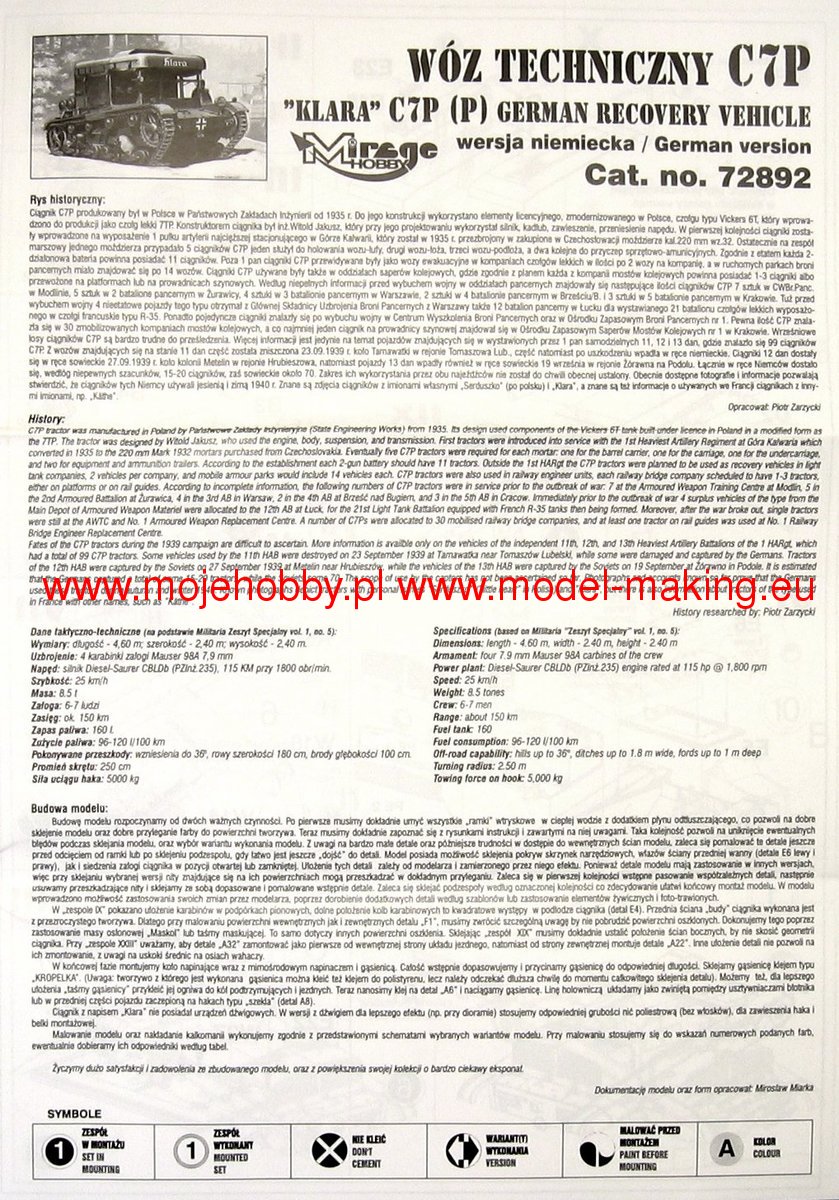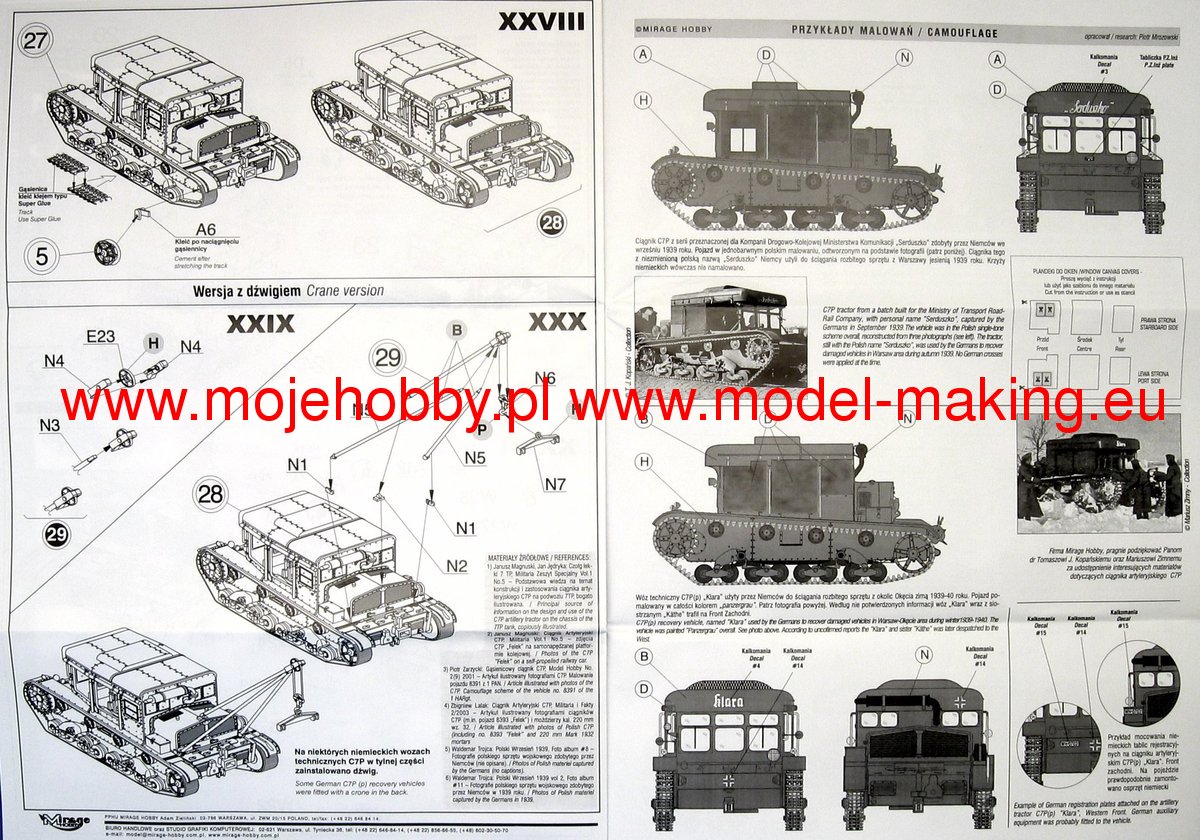 Скачать каталог продукции Mirage Hobby в формате PDFC7P польский гусеничный артиллерийский тягач межвоенного периода и периода Второй мировой войны. Первые прототипы машины были построены в 1933 году, а серийное производство продолжалось в период 1934-1939 годов, завершив выпуск около 150 экземпляров. C7P был оснащен двигателем ПЗИнж. 235 мощностью 115 л.с. Постоянного вооружения машина не имела. Наряду с медленной моторизацией и механизацией Войска Польского на рубеже 1920-х и 1930-х годов было принято решение повысить мобильность польской артиллерии и использовать в некоторых ее частях новые гусеничные тягачи, которые заменили бы применявшиеся до сих пор машины - такие как трактор Holt 75. Чтобы сократить время, необходимое для аналитических и внедренческих работ, было решено использовать шасси, и в то же время многие компоненты были разработаны для танка 7TP. В результате был создан автомобиль с хорошими внедорожными характеристиками, низким уровнем отказов и относительно простым управлением. Тягачи C7P использовались в основном для буксировки тяжелых пушек, гаубиц и минометов. Основной целевой единицей оказался 1-й тяжелый артиллерийский полк, который получил большую часть произведенных C7P. Эти машины также попали в бронетанковые войска, где их использовали для буксировки и извлечения поврежденных танков с поля боя. Тракторы C7P участвовали в сентябрьской кампании 1939 года, и небольшое их количество попало в руки Вермахта и Красной Армии.
