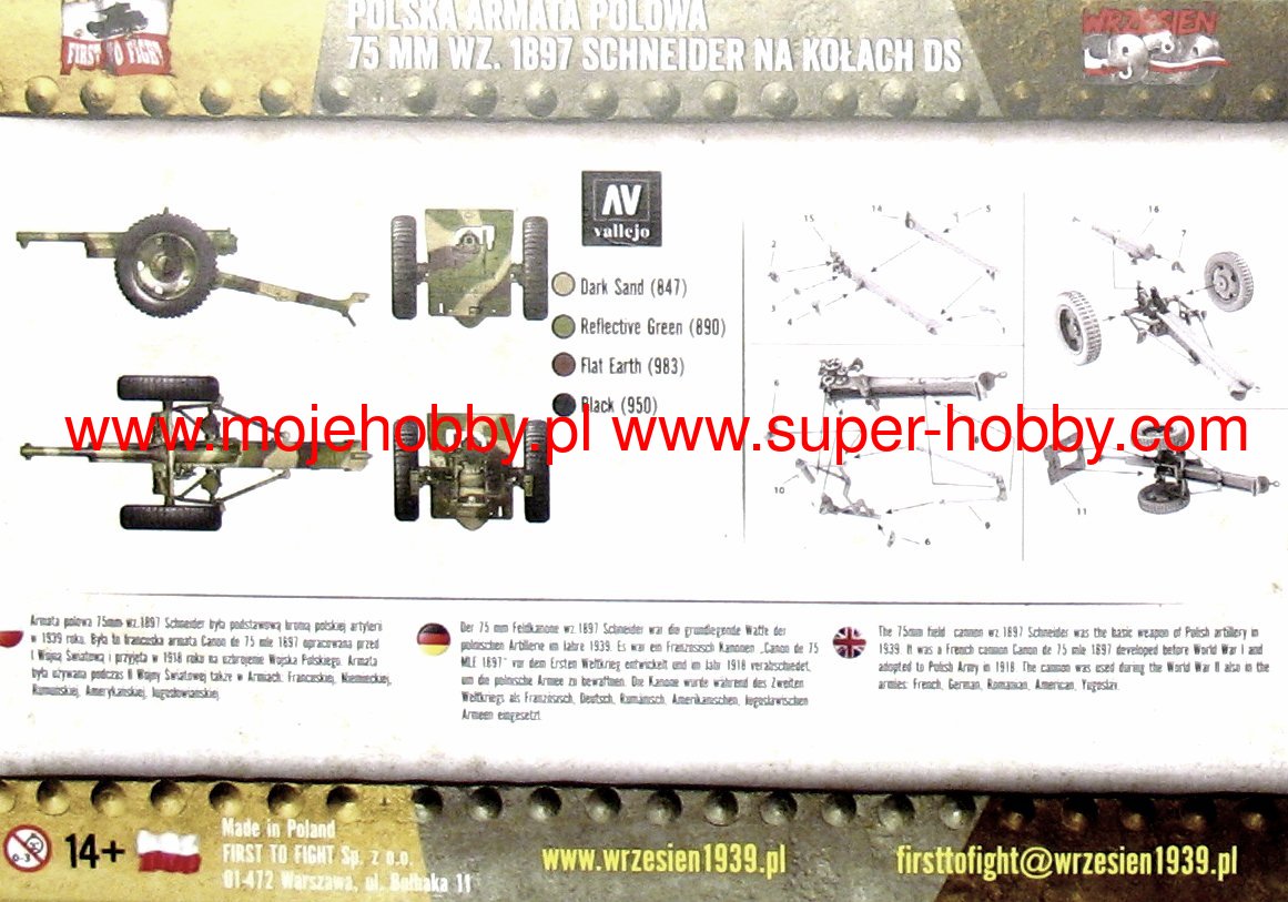 75 mm field gun wz. 1897 is a French 75 mm towed cannon, used in the Polish Army in the interwar period and at the beginning of World War II. The weight of the weapon in the combat position was 1,190 kilograms, with the total length (in the combat position) of 4.5 meters. The maximum range was about 11,200 meters, with a rate of fire of up to 12 rounds per minute. The presented cannon is a version of the famous "seventy-five" produced in the Schneider plant for the needs of the French army, the same one that was one of the main cannons of the French army during the Great War. The first guns of this type reached the Polish Army together with General Haller's Blue Army, and another one was received from France in the early 1920s. Another 300 were purchased in 1924, and in the same year more copies were obtained from Romania. 75 mm field gun wz. 1897 in the interwar period was the basic infantry support department, which was most often towed by horse traction. A number of these guns in 1937 were adapted to be towed in motor traction, by replacing wooden wheels with metal ones with tires. C7P or PZInż vehicles were used as artillery tractors. W-Z cake. 34. It is assumed that at the time of the beginning of the September campaign, there were approximately 1,370 guns of this type in the Polish Army.