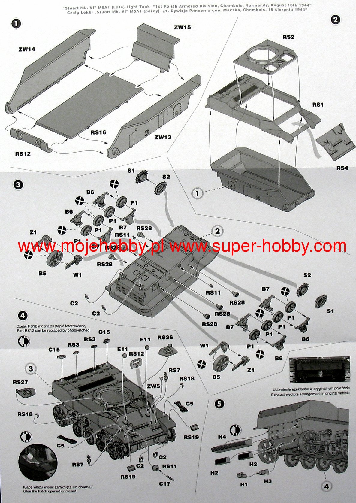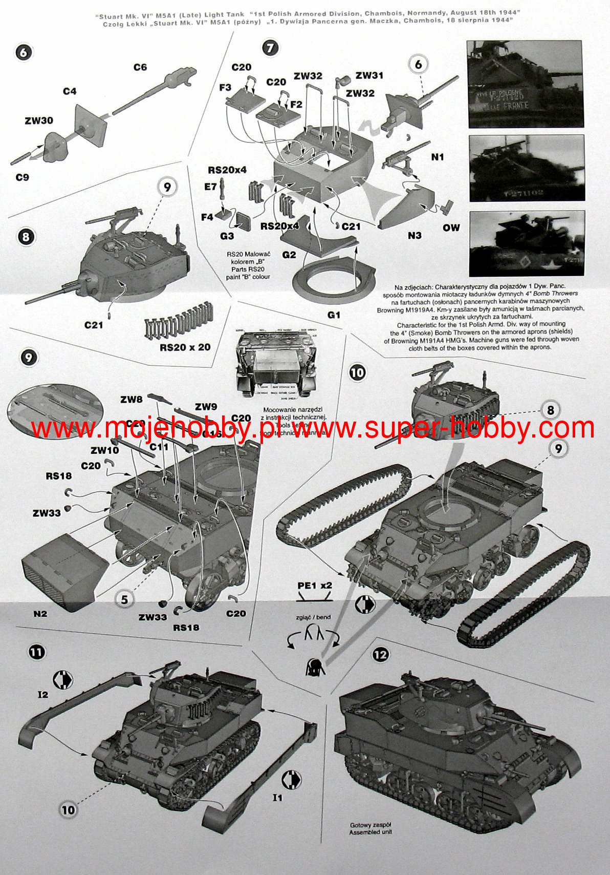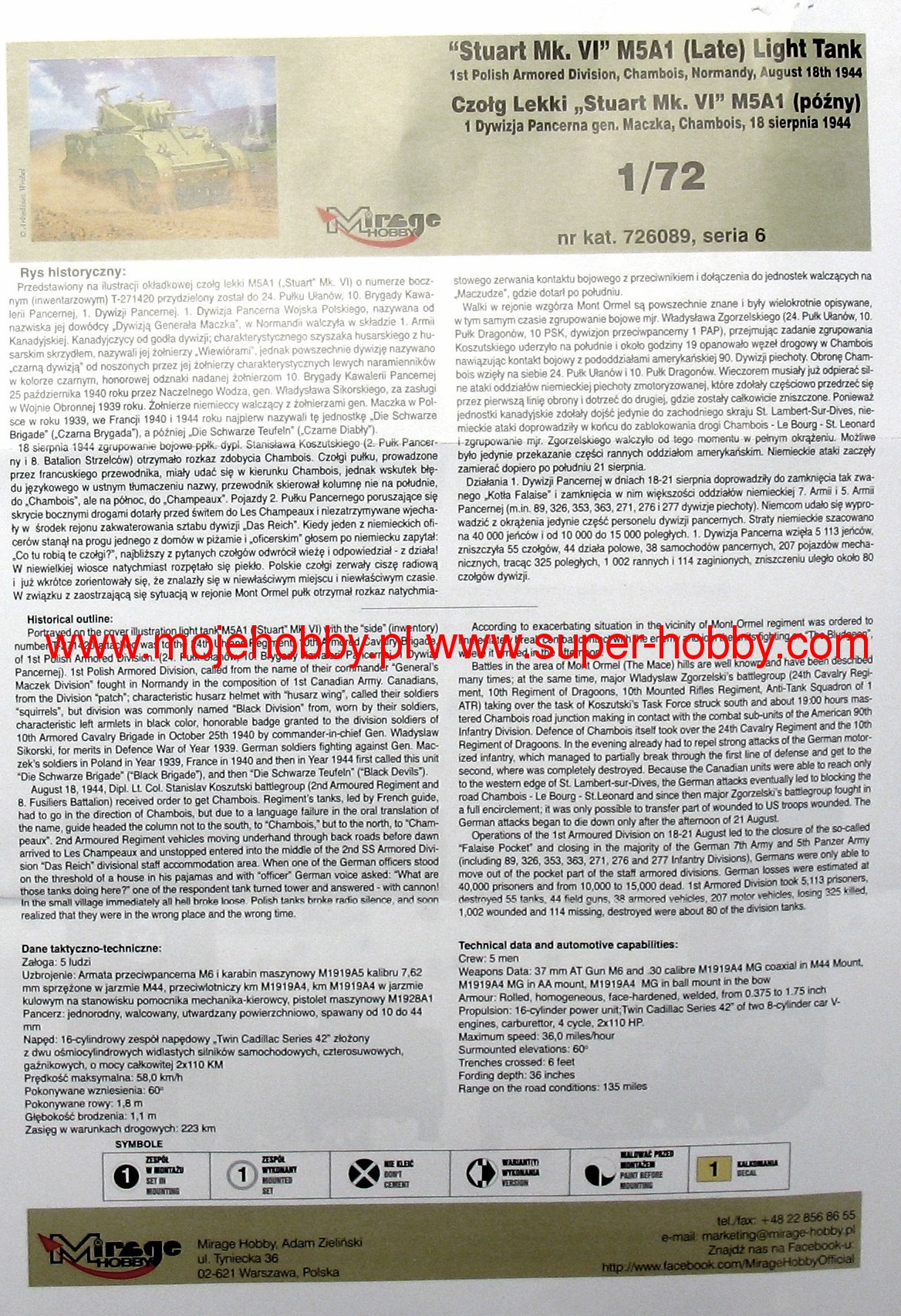 Download Mirage Hobby PDF catalogueThe M3 / M5 Stuart is an American light tank from the Second World War. The history of the M3 began in 1940, when the US Army saw the need to replace the old M2 with a more modern design. After several months of testing, the American Car and Foundry company released the first serial copy of the new tank, designated M3, in March 1941. The production of this successful tank lasted until 1945 and ended with the production of over 22,000 units! The M3 was powered by a Continental W-970-9A 7-cylinder engine with a capacity of 250 HP or a 9-cylinder Guilberson T-1020-4 diesel engine with a capacity of 210 HP. On the other hand, the M5 tank was powered by two coupled Cadillac V-8 engines with a capacity of 220 HP each. In total, several versions of the M3 tank were created. The first production series was marked M3, the next was M3A1, which min. was stripped of the watchtower and no longer had side machine guns. The M3A3 model entered production in 1943, with numerous improvements from the fighting in North Africa. Production of the M5 also began in March 1942, which was essentially a modification of the M3. The M5 tank was made in only two versions: M5 and M5A1. The latter had an elongated turret, an improved cannon mount and a new machine gun mount on the turret. The last modification was not used on all tanks of this version. The M8 self-propelled gun was also created on the basis of the M3 / M5 tank. The tanks were massively exported to Great Britain under the Lend and Lease Act program. In the American and British service, they served in North Africa, Italy, Normandy, and in the battles in France and Germany in 1944-1945. Tanks in the declining period of the war were replaced by the M24 Chaffe. The M3 / M5 Stuart is recognized as one of the best light tanks of World War II. Satisfactory range, speed and maneuverability all made him highly valued by his crews. Technical data (M3A3 version): length (with a barrel): 4.52m, width: 2.24m, height: 2.52m, engine power: 210-250KM, range: 217km, maximum speed (on the road): 58km / h, armament: 1 M6 37mm cannon, 2 7.62mm M1919 machine guns.