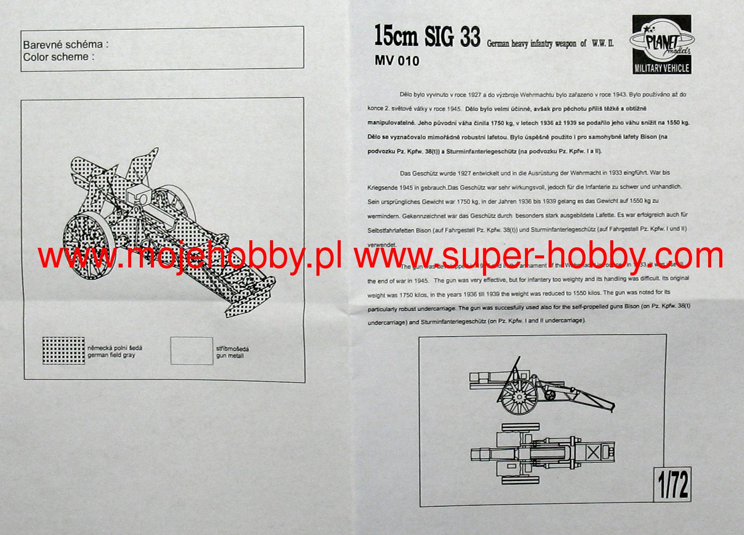 SIG 33 (нем. schweres Infanterie Geschutz 33) немецкая 150-мм буксируемая тяжелая пехотная пушка времен Второй мировой войны. Первые опытные образцы орудия были созданы в 1927 году, а в 1936-1945 годах серийное производство продолжалось, завершившись выпуском около 4200 экземпляров этого оружия. Максимальная дальность полета составляла 4700 м, а начальная скорость снаряда 240 м/с. sIG 33 создавался в результате немецкого опыта Первой мировой войны, который наглядно показал, что в бою пехоте крайне важно поддерживать ее собственной сопровождающей артиллерией. Поэтому после долгого обсуждения в профессиональной прессе немецкая армия решила создать орудие калибра 150 мм (именно SIG 33), которое должно было быть пушкой, сопровождающей пехотные полки и непосредственно им подчиненной, мощным огнетушителем. В то время как сама концепция была новаторской, орудие SIG 33 было традиционным по конструкции более того, оно оказалось очень тяжелым и долгое время было направлено на снижение веса с целью повышения маневренности. Пушка sIG 33 также стала основным вооружением таких машин, как, например, Sturmpanzer II, Sturmpanzer IV Brummbar или Grille. Немецкая армия использовала SIG 33 на протяжении всего периода Второй мировой войны.